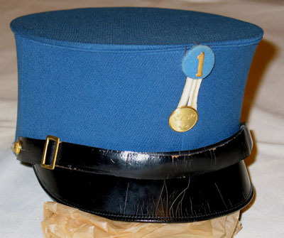 Skärmmössa med ljusblå mössknapp med förgylld " 1 ". Foder av blått siden. I mösskullen firmamärken i guldtryck: " MILITÄR EKIPERINGS A.B // STOCKHOLM // M.E. // A." och under en hertigkrona initialerna: " G. A. " Svettrem av naturfärgat läder, b: 40 mm. I övrigt modellenlig.