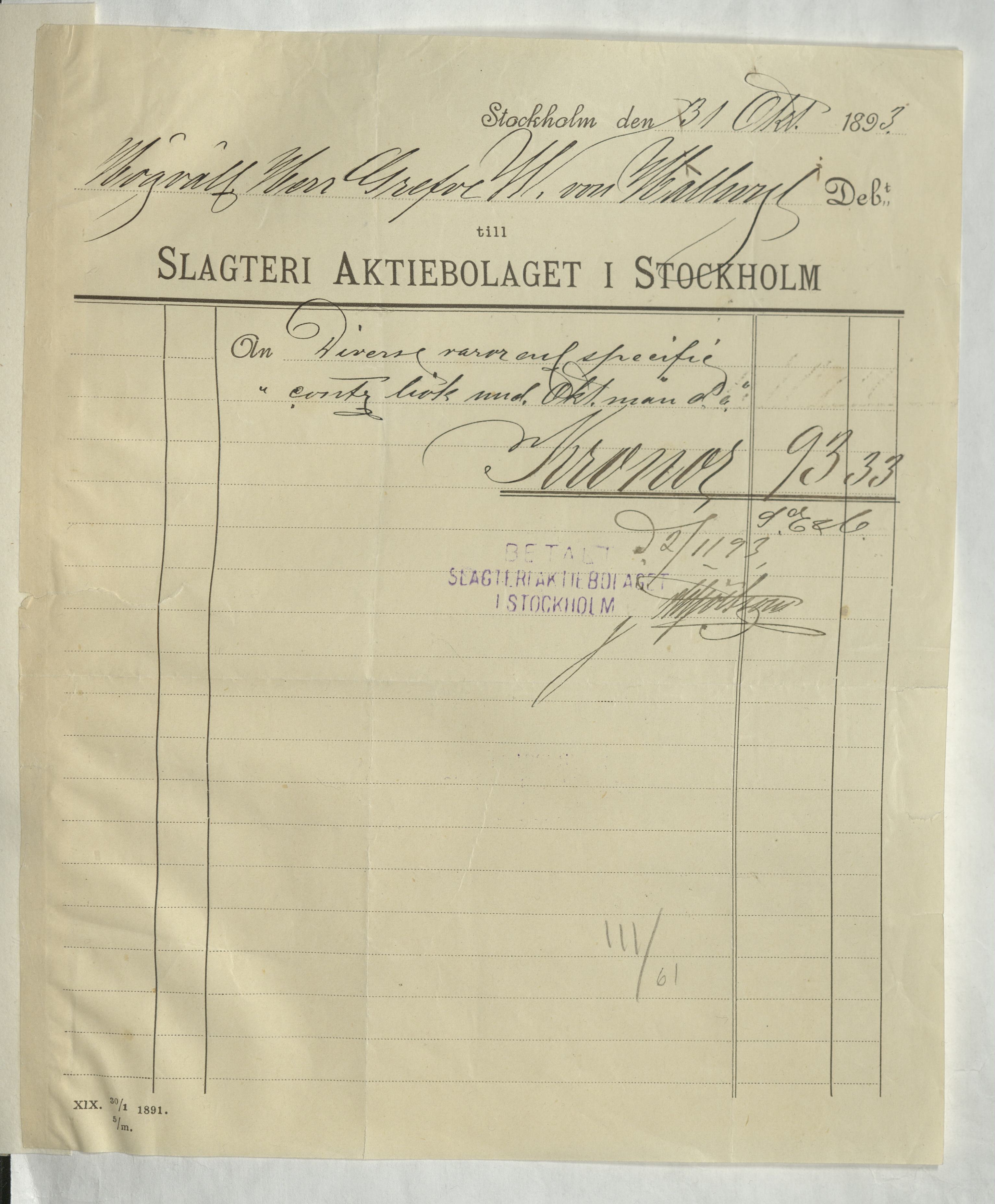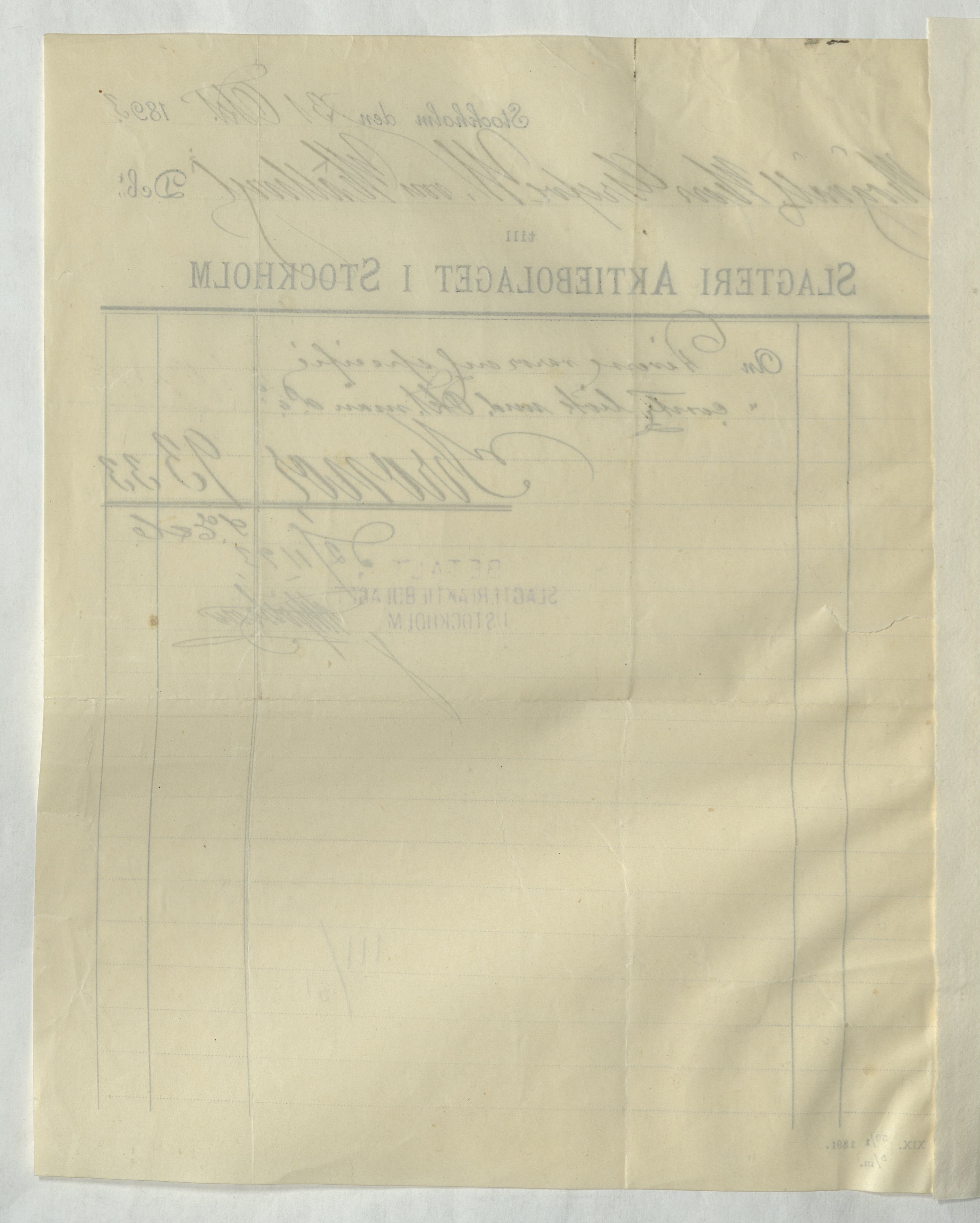 Kvitto från Slagteri Aktiebolaget i Stockholm