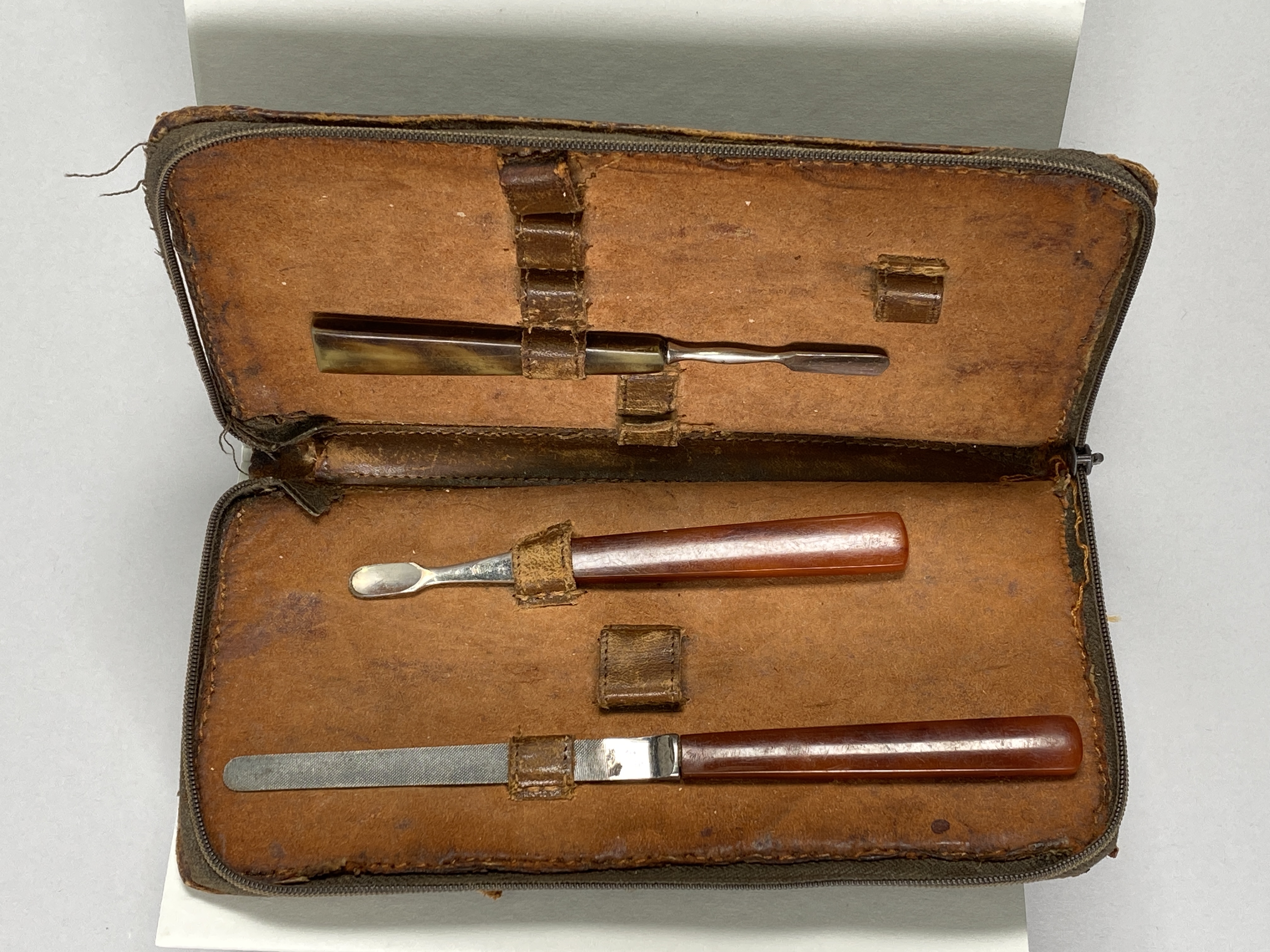 Etui för nagelvård. Etui läder med dragkedja. Innehåller en nagelfil och två nagelbandsredskap. Medfördes på Elsbeth Israels resa från Tyskland till Sverige 1939.