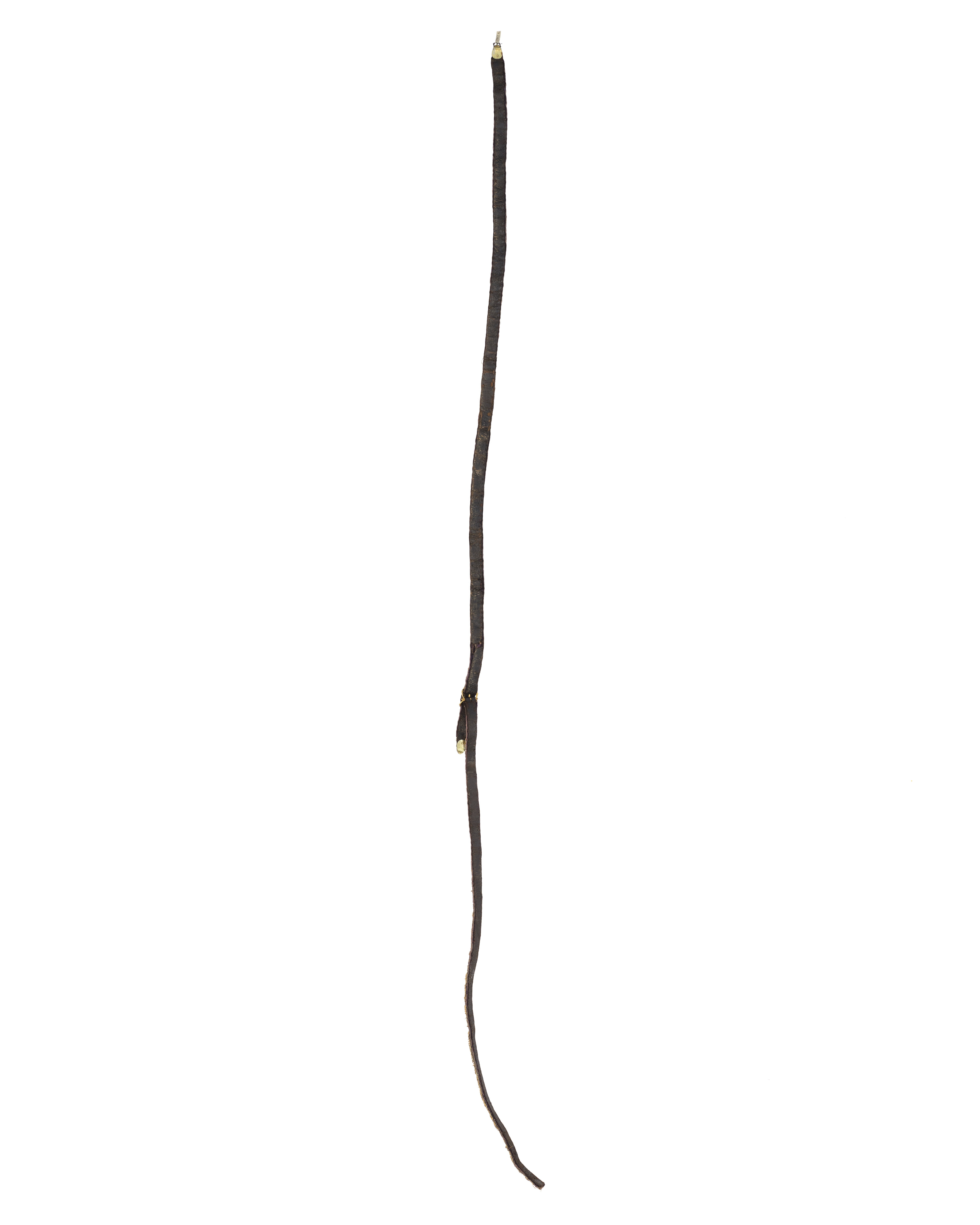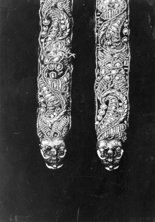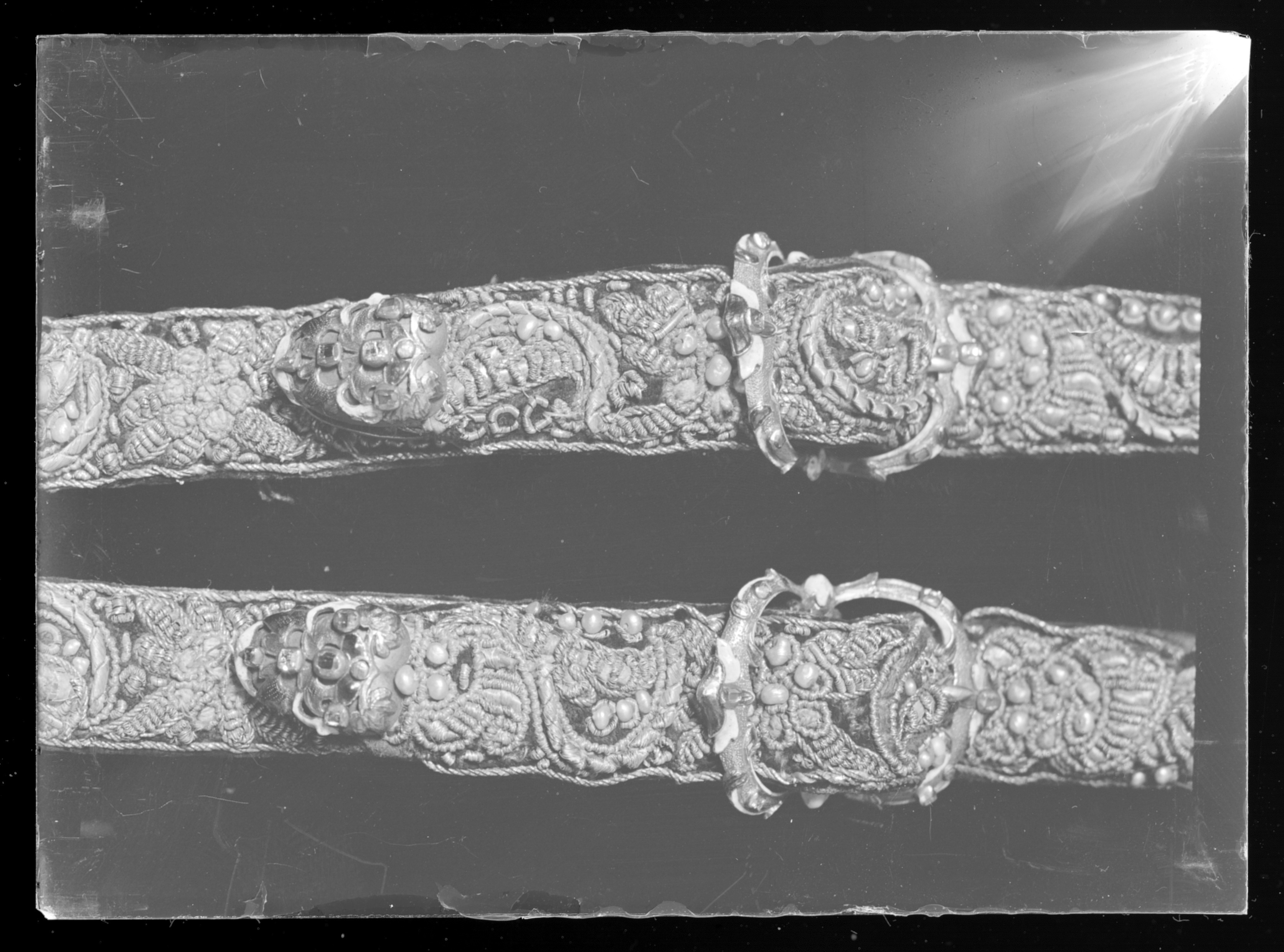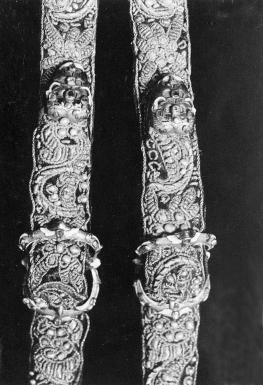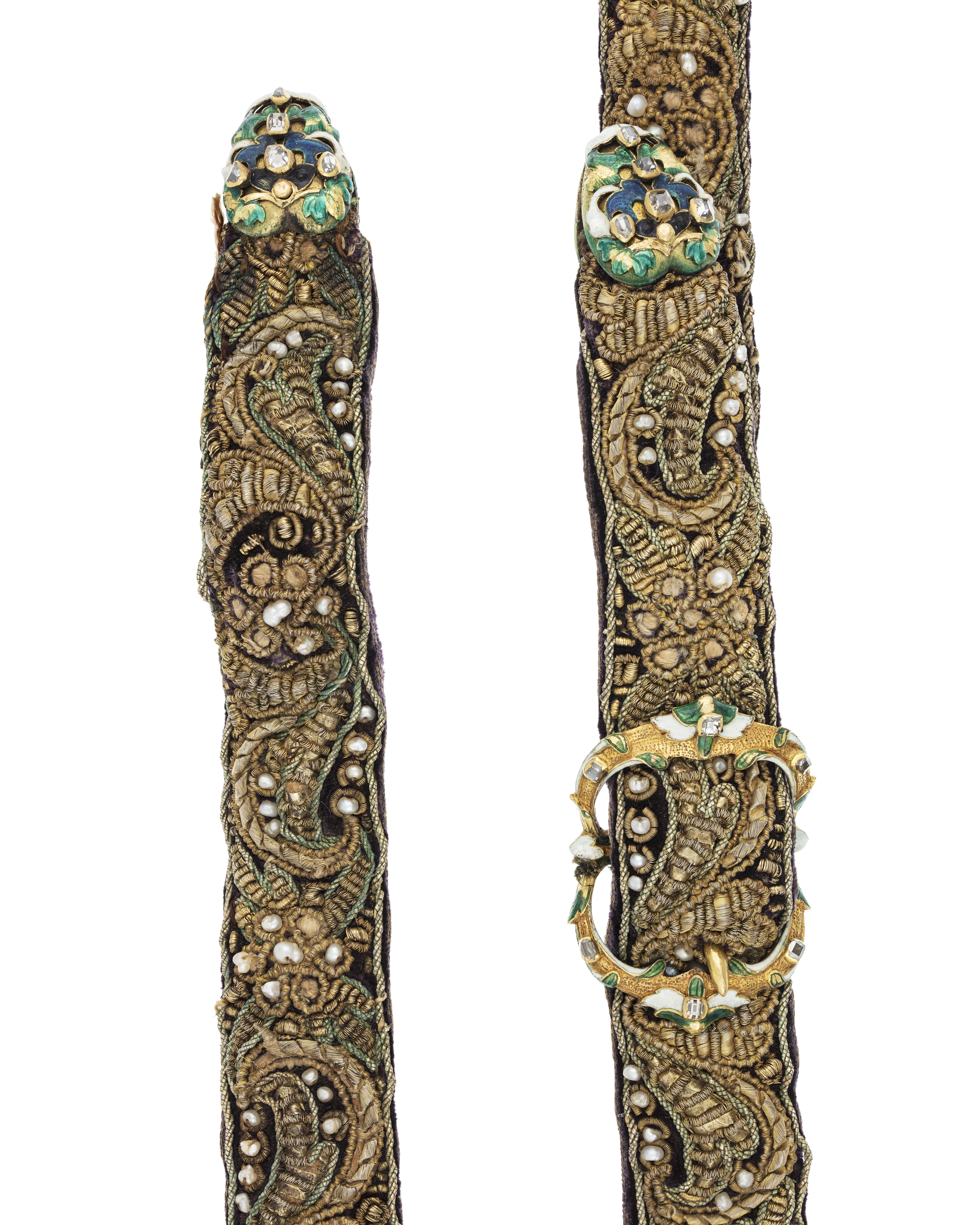En rem 1004 mm lång med beslag i vardera änden av förgyllt silver på en sidan belagt med guldplåt i form av rankor med dekor av transparant och opak flerfärgad emalj samt infattade små rektangulära translucida stenar. I ena änden, den andra avsliten. Båda remmarna av mörkbrunt läder på ena sidan klädda med mörk lila sammet broderade med guldtråd och pärlor i rank- och bladmönster.