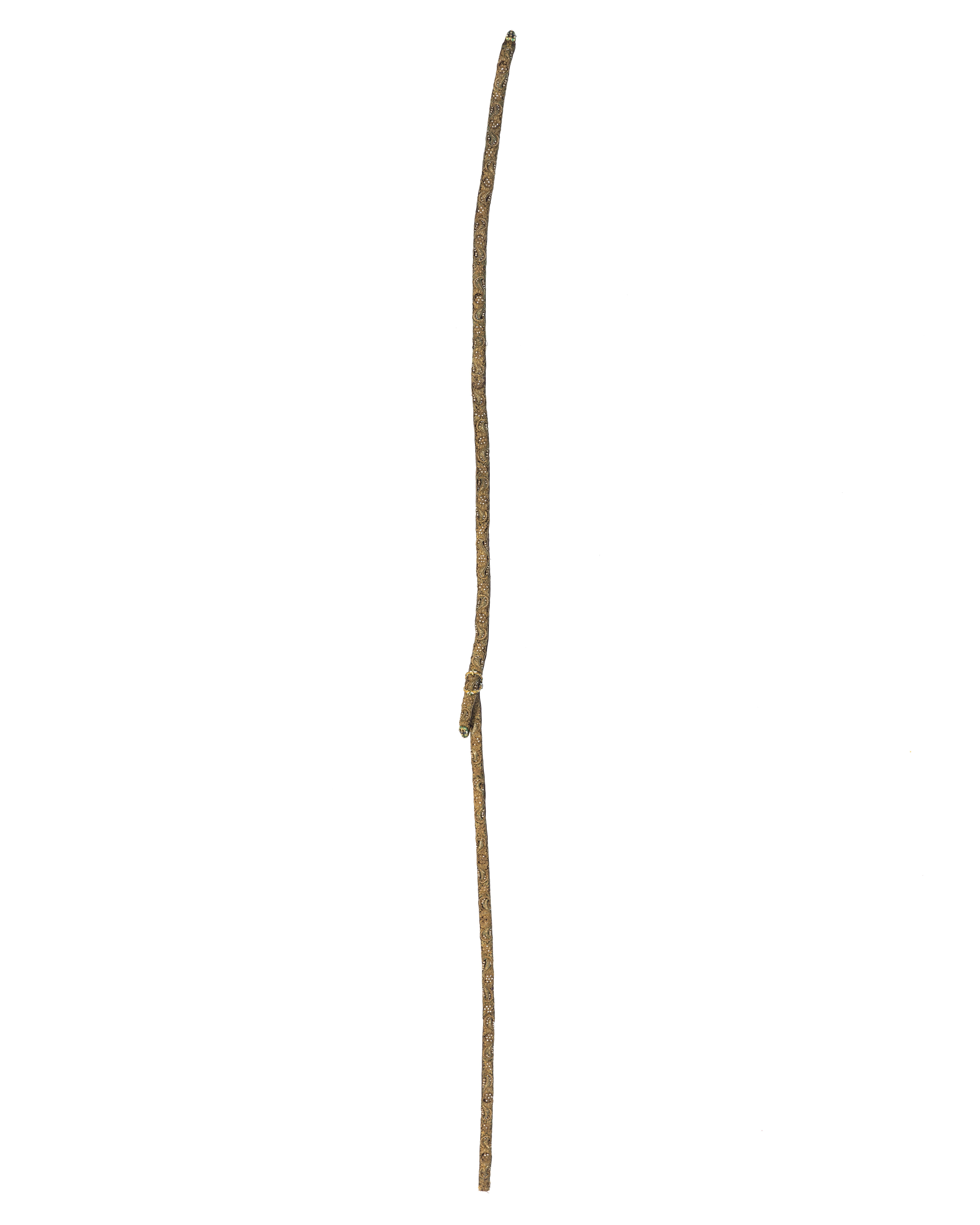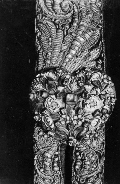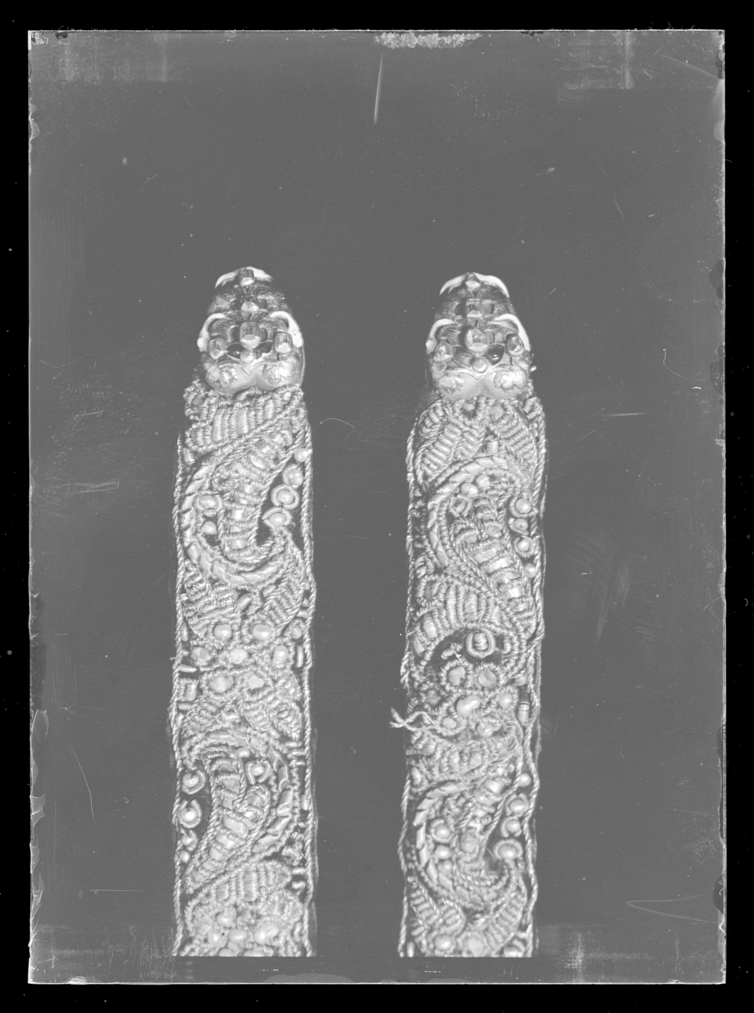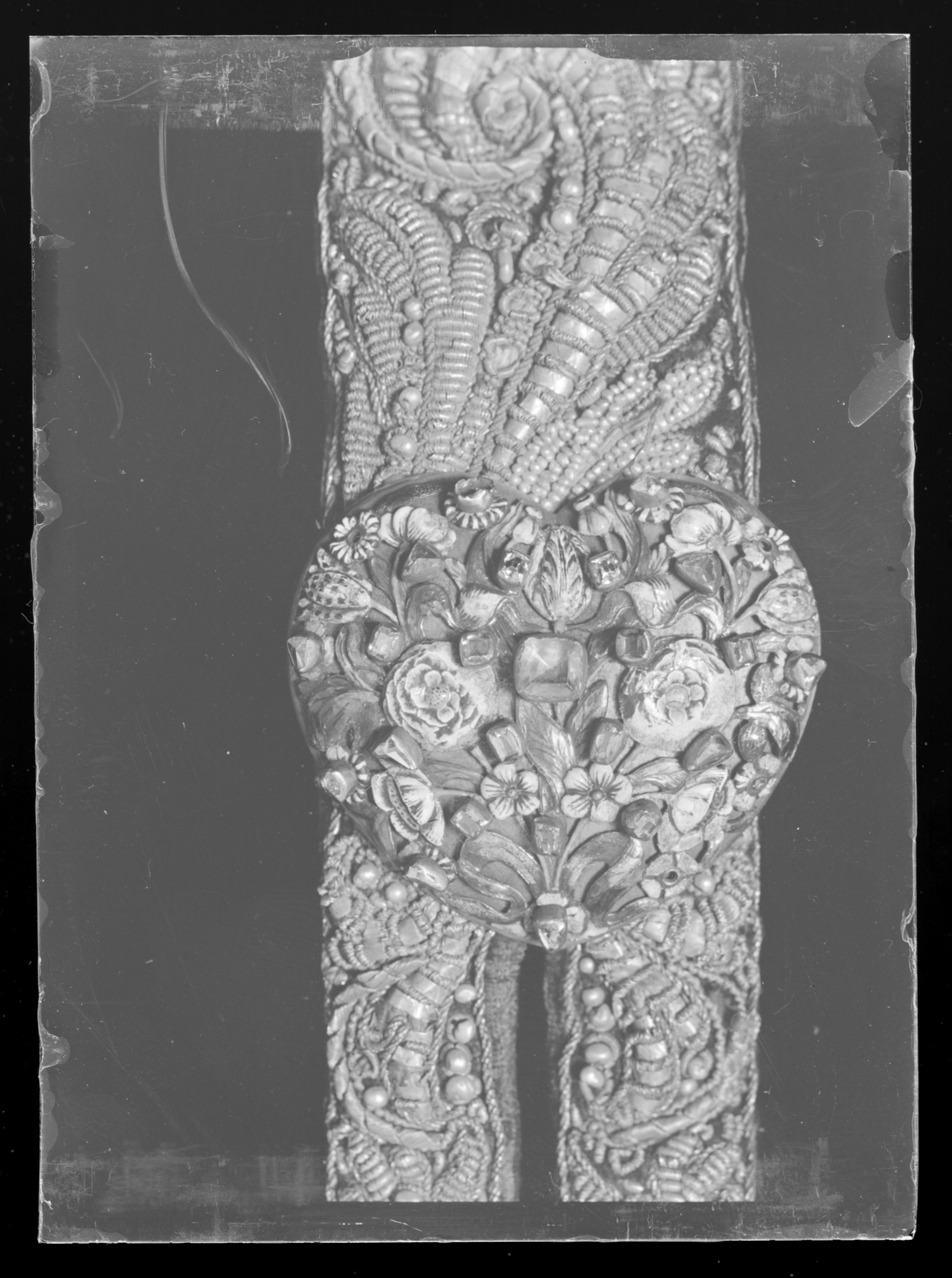 En rem 1004 mm lång med beslag i vardera änden av förgyllt silver på en sidan belagt med guldplåt i form av rankor med dekor av transparant och opak flerfärgad emalj samt infattade små rektangulära translucida stenar. I ena änden, den andra avsliten. Båda remmarna av mörkbrunt läder på ena sidan klädda med mörk lila sammet broderade med guldtråd och pärlor i rank- och bladmönster.