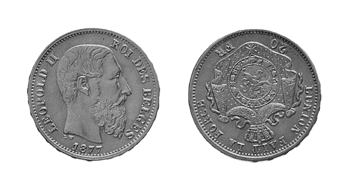 GULD. 20 Francs 1877. Åtsida: Konungens huvudbild i profil åt höger. Kring kanten en pärlstav. Frånsida: Riksvapnet i rund sköld inom LEOPOLD-ordens kedja, med hermelinsmantel samt under kunglig krona. Kring kanten en pärlstav. Rand: Med inskrift i relief: (Gud beskydde Belgien). Mått: Vikt: 6,4 gr. Diameter: 21,5 mm. Medfört av Johanna Kempe från resa 17 Augusti- 6 Oktober 1878.