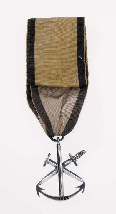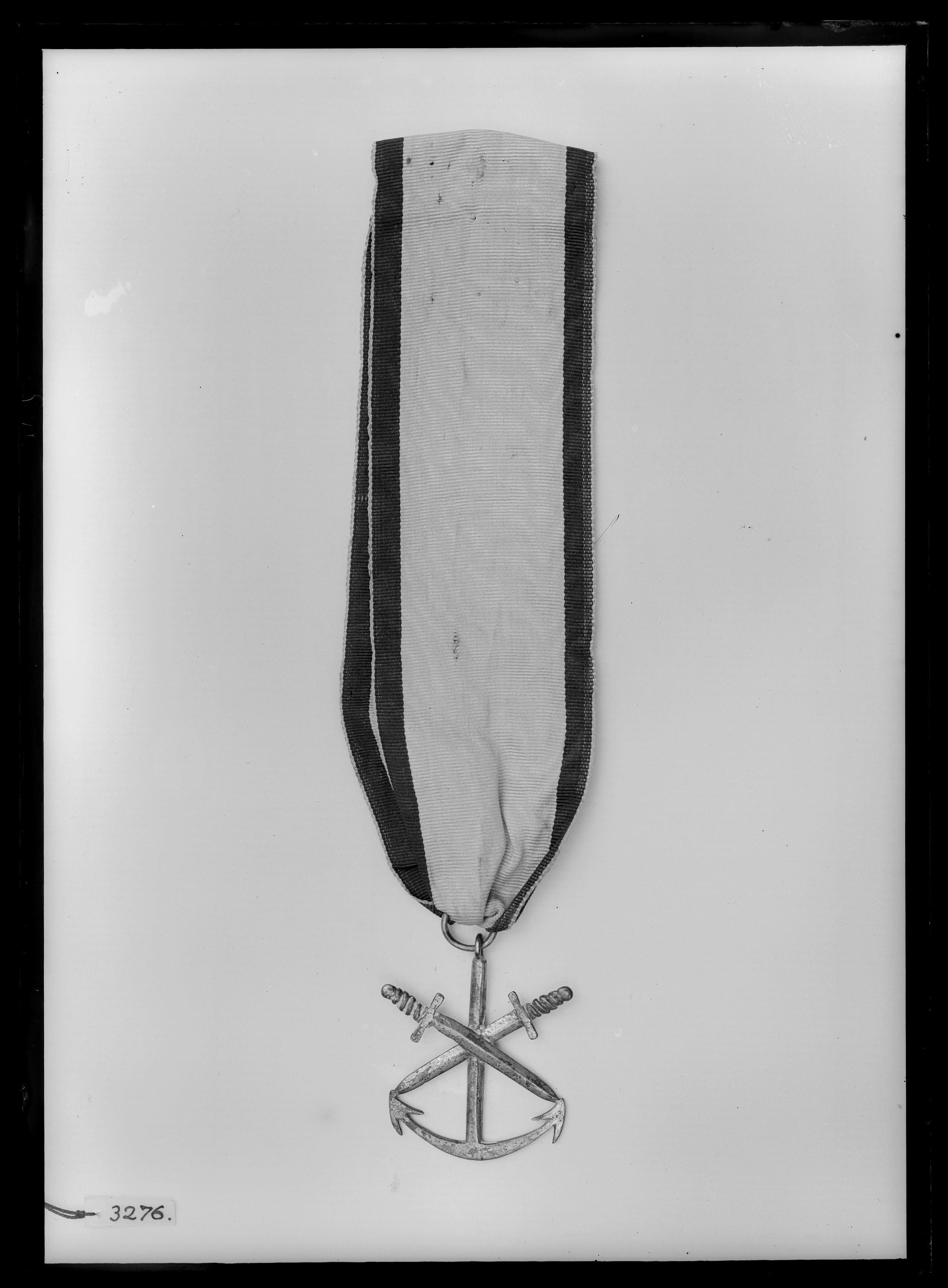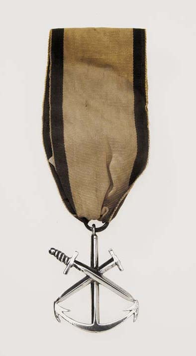 Två svärd med spetsarna nedåt, korslagda över ett ankare, allt av silver. Flottans distinktionstecken för tapperhet till sjöss (Hoglandstecknet) lägre graden