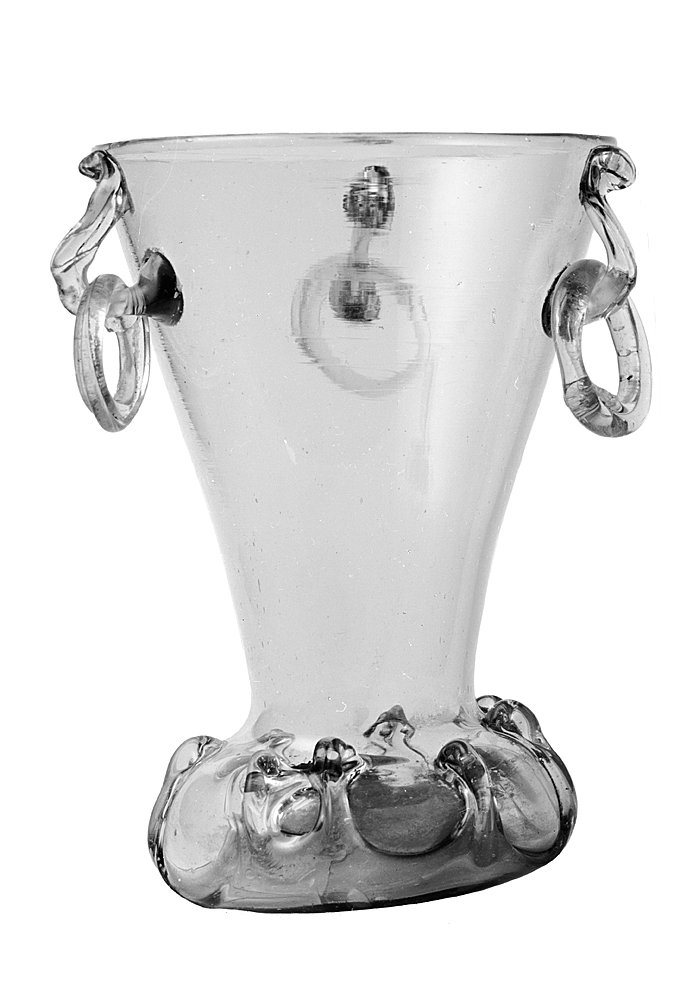 BÄGARE (Ringbecher). Av omvänd konisk form med vilstformigt utstående fot. Bottnen lågt koniskt upphöjd, bildad av ett pålagdt stycke med åtta över foten uppvikna tungor. På bottens utsida, i mitten, brottyta efter punteln. På bräddens utsida tre pålagda byglar, i varje en något ojämn lös ring, bildad av en hopböjd tråd av glasmassa. Massan blåaktig. Höjd: 10 -10,5 cm, diameter: 7,4 cm. Fot, diameter: 6 cm.