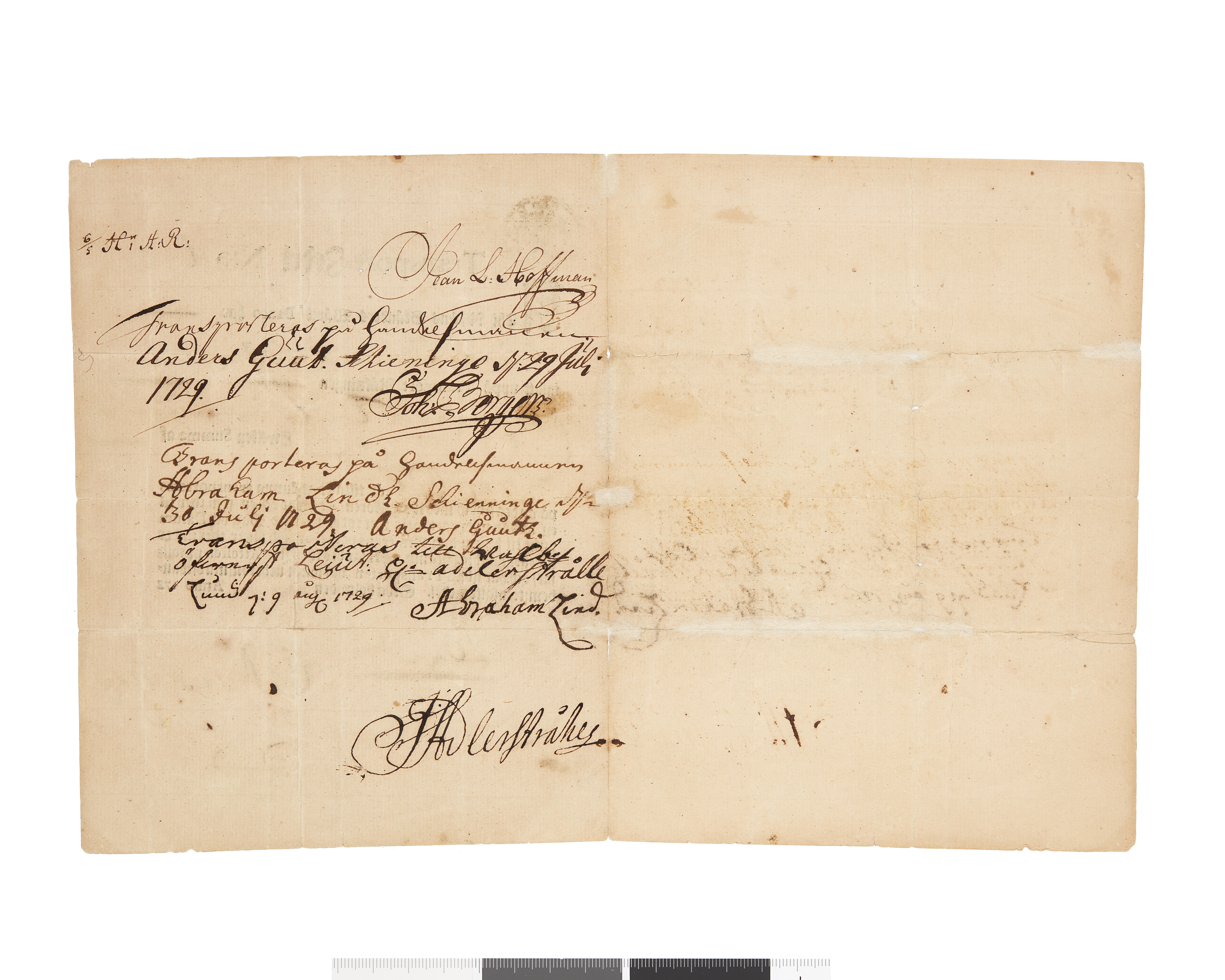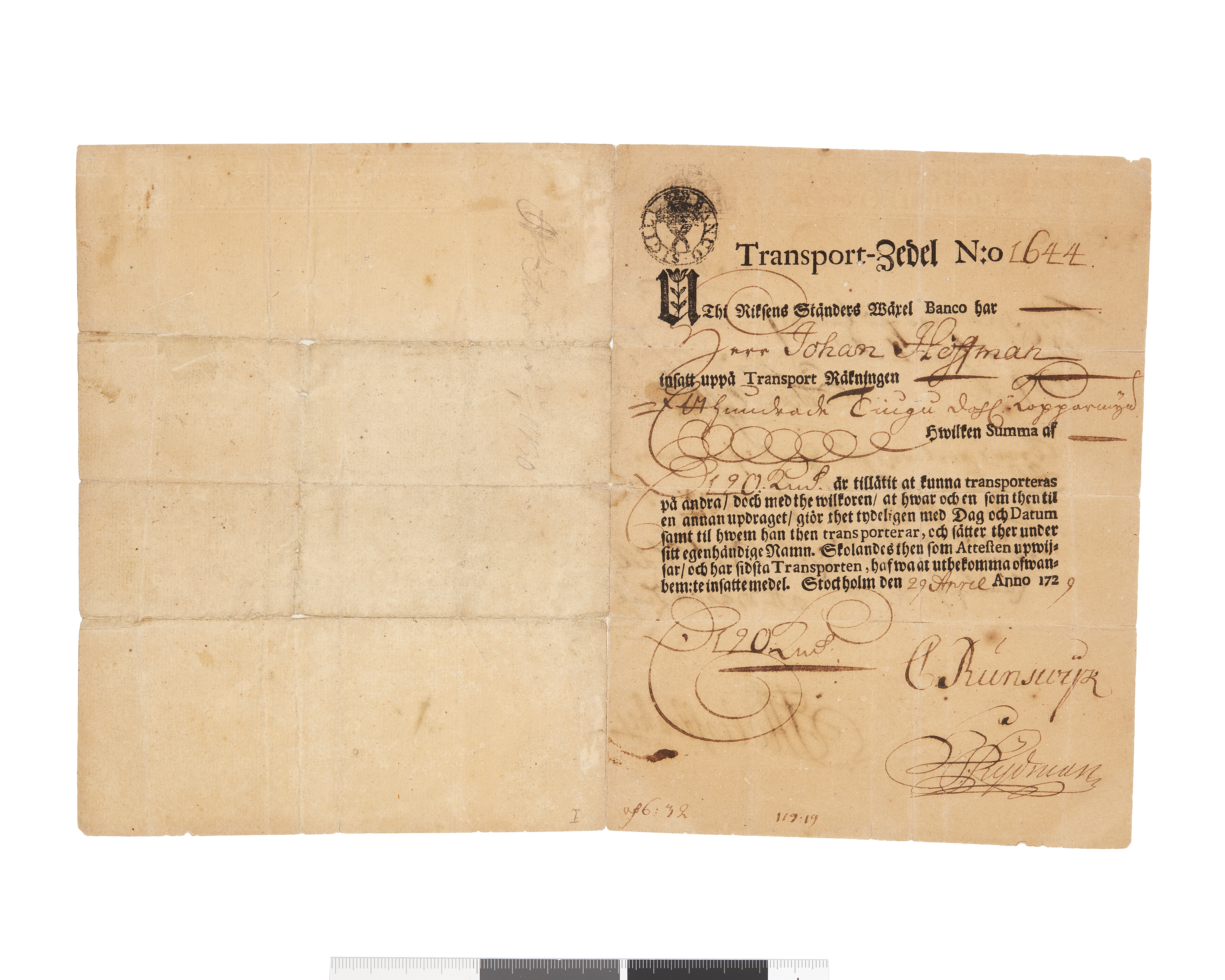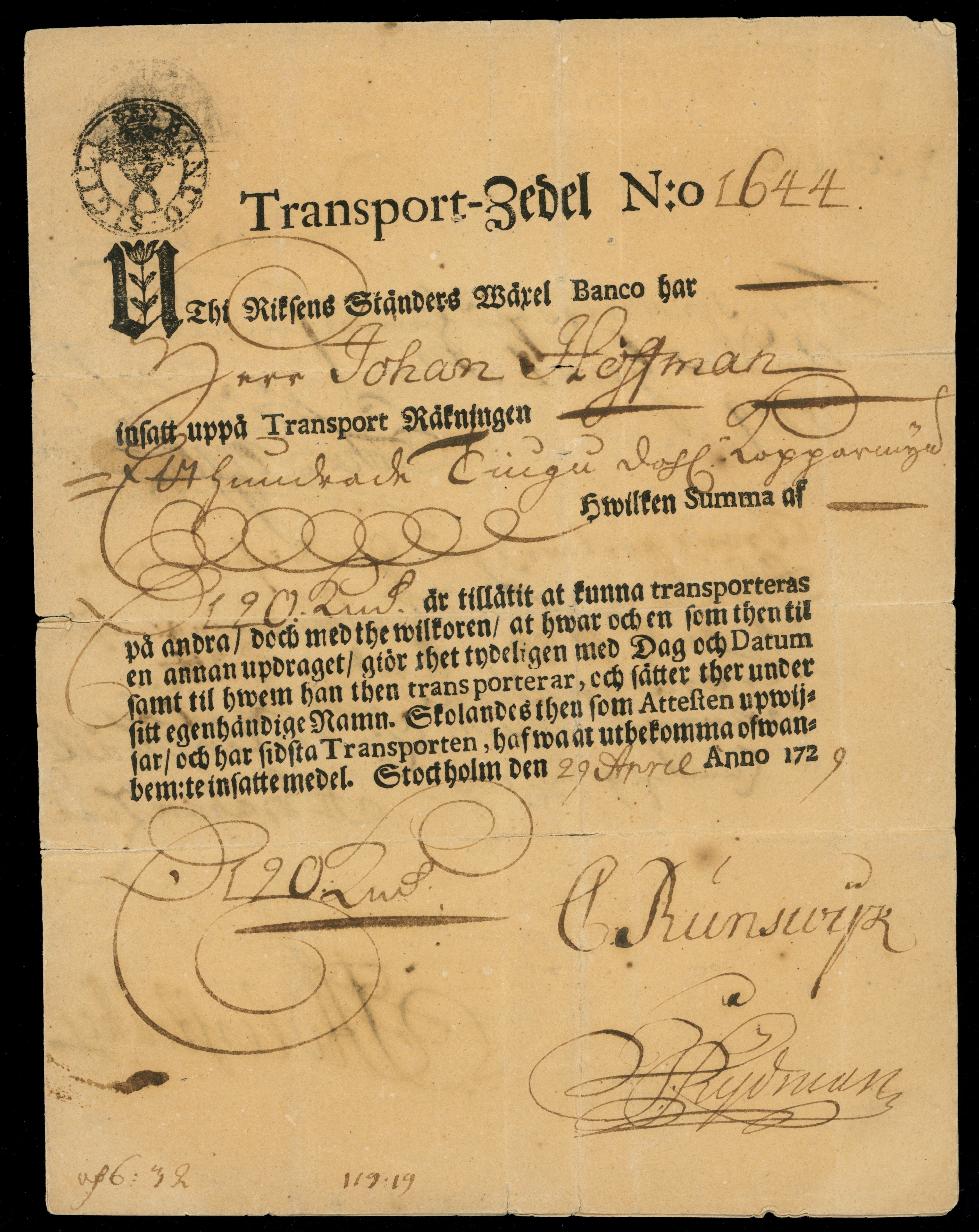 Transportsedel, 120 daler km, utgiven 1729 av Riksens Ständers Wäxel Banco. Sedeln utställd på Johan Hestman (?)