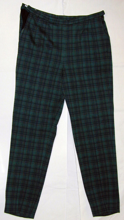 Byxor av grönrutig jersey. Mörkgrön botten med ljusare gröna punktlinjer samt någottjockare, bruna linjer av snedställda streck. Benen avsmalnande nedåt. Byxorna har veck ibåda sidor som bildar fickor och upptill knäppes med hakar. Tre par hakar gör att viddenkan varieras. Ofodrade. Resår i midjan.
