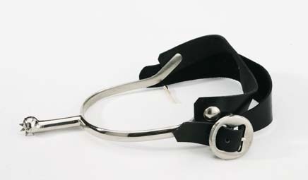 Sporre av förnicklat stål med två läderremmar för fastspännande. Bygelarmarna är i ändarna nedåtböjda. På vardera bygelarmen är två inborrade knappar, på den ena sidan är remmarna fästade genom vanliga knapphål, på den andra sitter på samma sätt en rem samt på den andra knappen en förnicklad, rund sölja på en ledad metallarm. Sporrhalsen rak, längt ut nedåt kulformigt utvidgad. Sporrtrissan stjärnformig med åtta stora tänder, d:14 mm, fäst med en genom halsen gående nit. Läderremmarna svarta, den ena bredare mitt på, den andra jämnbred.