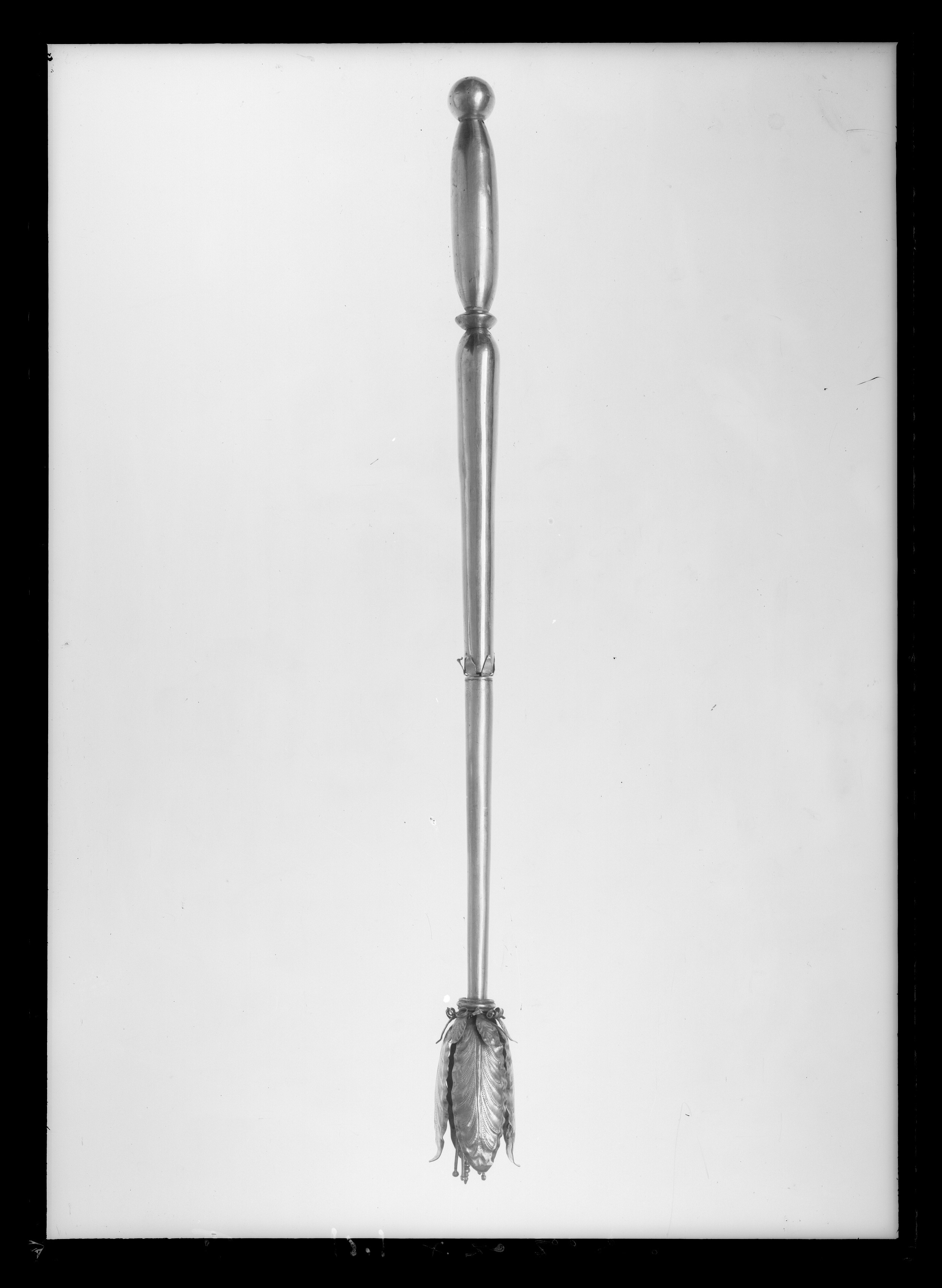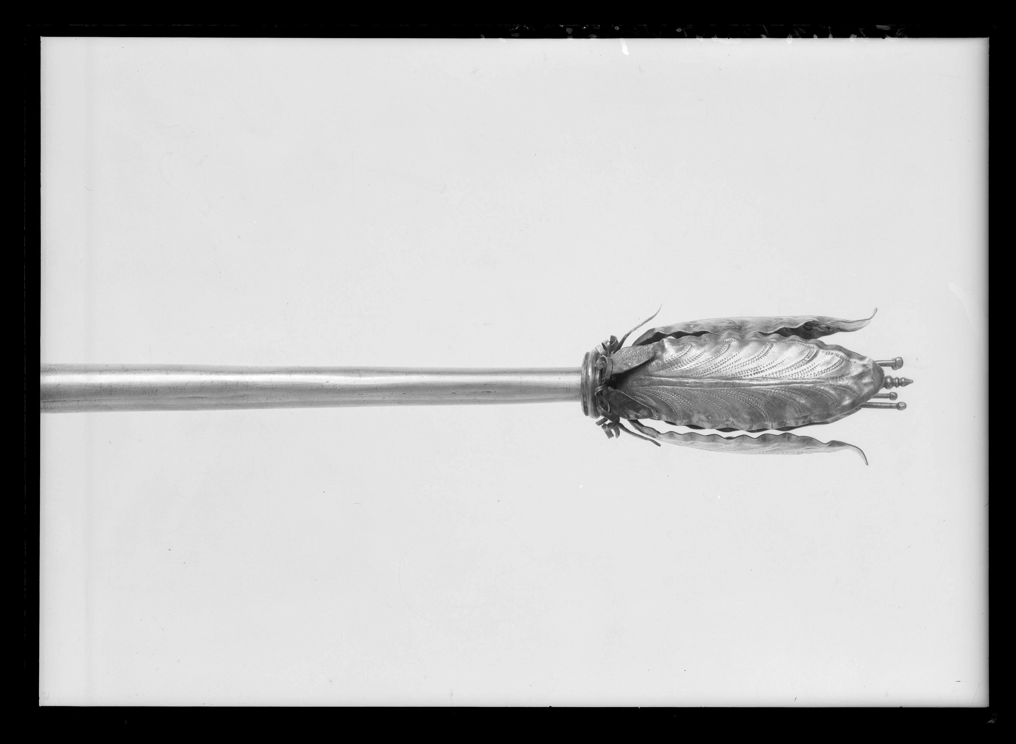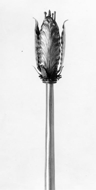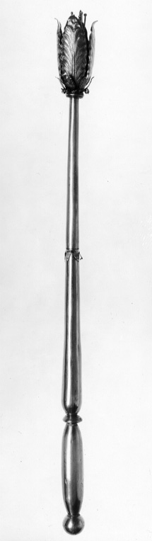 Begravningsspira sammansatt av åtta delar: 1. handtag, nertill avslutat med kula, oval kavel, vulst med markerad mittkant, upptill en gängad stav, l : 129 mm. 2. spolformigt mellanparti, gängade hål i båda ändar, l: 150 mm. 3. mellanring med sex uppåtstående, klippta blad. 4. uppåt avsmalnande stav, gängad tapp i nederänden, gängat hål i överänden, l: 167 mm. 5. mellanring med rundad vulst. 6. mellanring, foderblad med uppåt-utåtriktade blad med punsade nerver, mellan bladen klippta, spiralvridna trådar, flera saknas. 7. kronblad, fyra uppåtriktade blad med utåtriktade spetsar, drivna och punsade detaljer, h: 69 mm. 8. fyra ståndare och en pistoll, pistillen avslutad med tre vulster och en spets, ståndarna med kulor,nertill platta och gängad tapp, l: 91 mm.