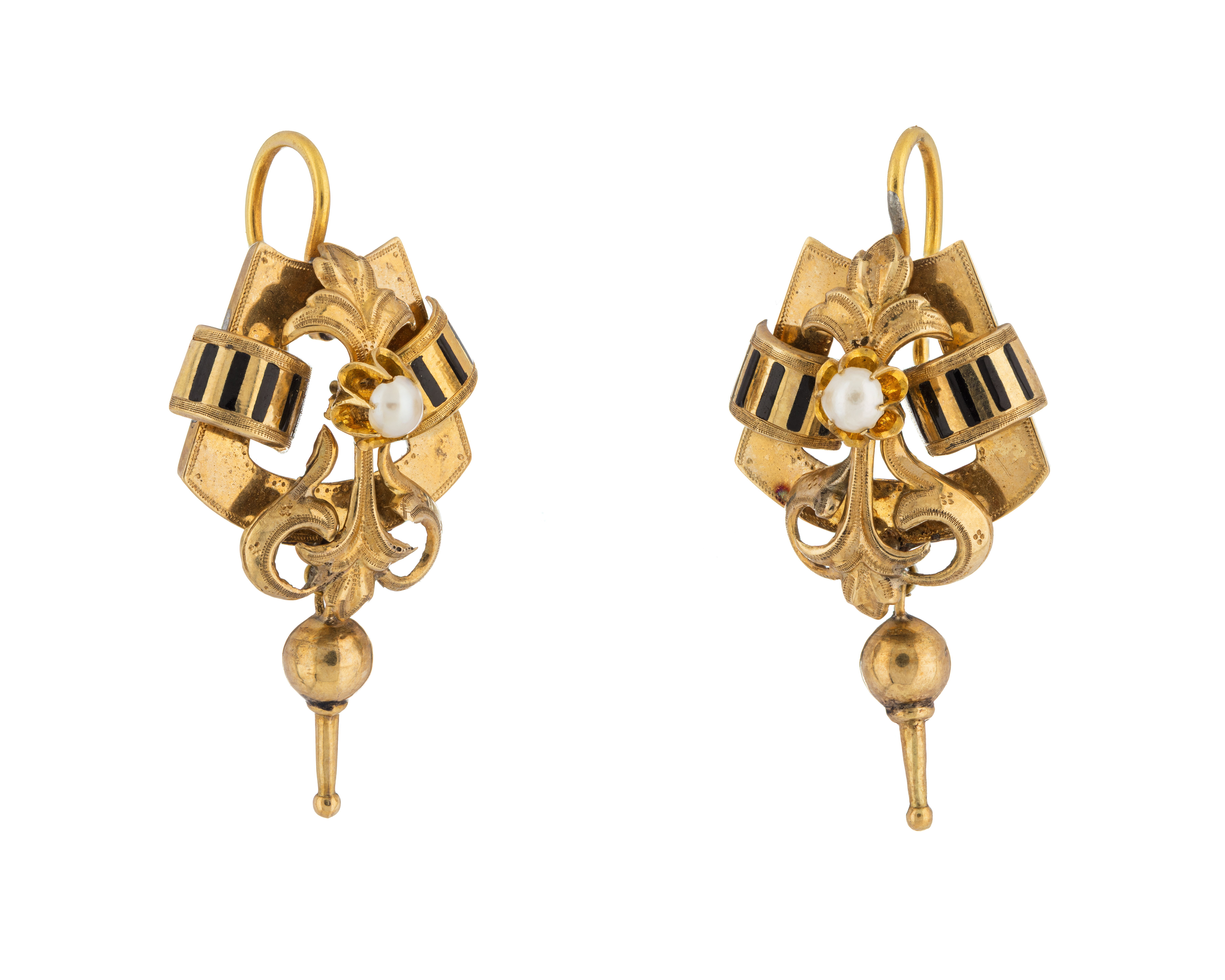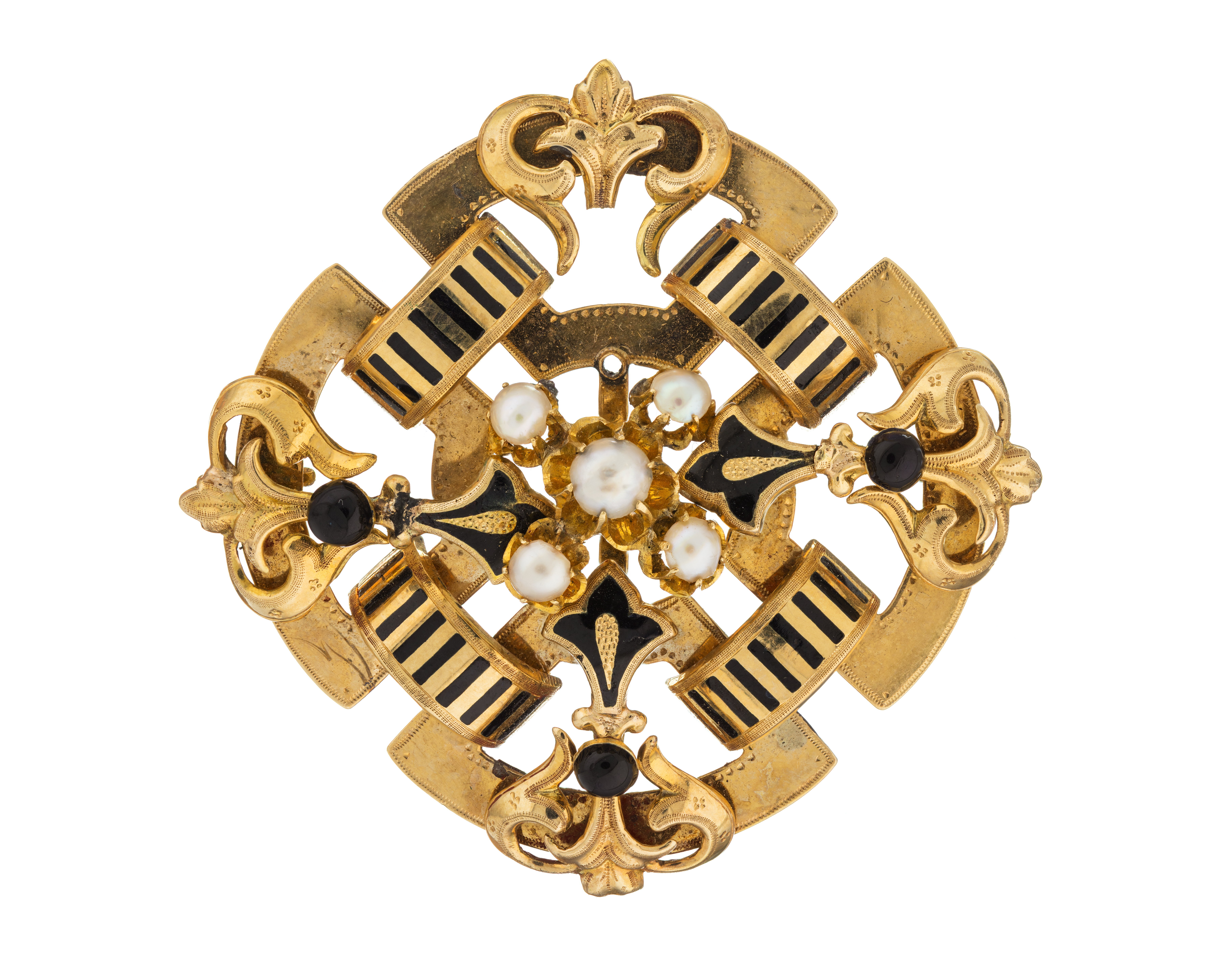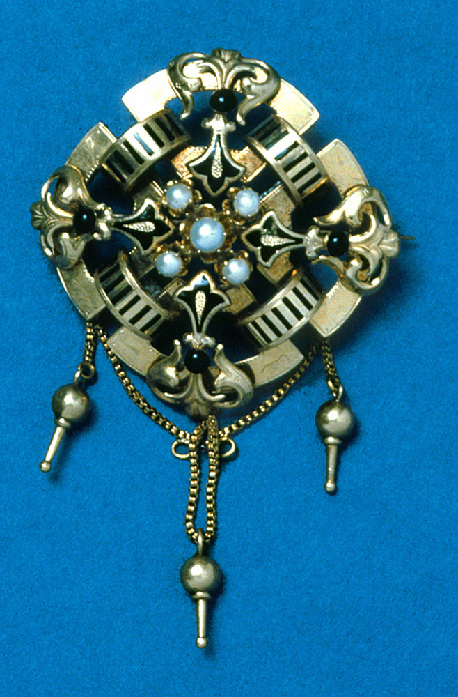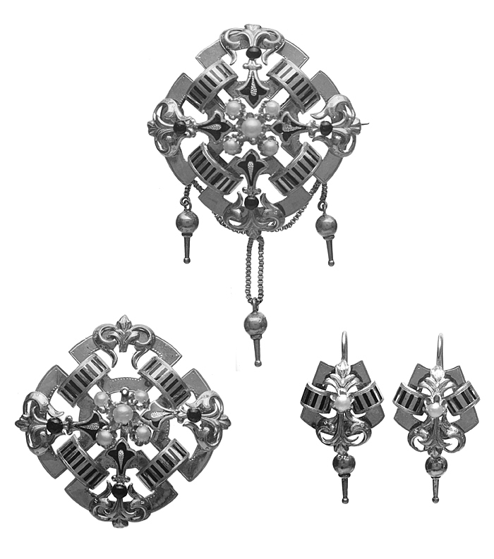 - Bestående af brosch, rosett till armband samt ett par örhängen. Af guld med orientaliska pärlor samt emalj. Brosch: Fyrsidig, ställd öfver hörn. Bestående af fyra på bredsidan liggande platta bågar, hvarje med i rät vinkel inböjda ändar; bågarna sammanhållna två och två genom en öfver de inböjda ändarna tvärgående bred båge med tvärränder i svart emalj. Å hvarje af de förstnämnda bågarna ett fritt pålagdt, inåtriktadt ankarliknande ornament, i hvars midt en halfsfärisk knopp af svart emalj, inre ändan treflikad och delvis belagd med svart emalj. I midten en grupp af fem halfva pärlor, en större i midten, alla i chatongfattningar af guld. Vid nedre hörnet tre kulformiga kläppar med lång spets, hvarje kläpp hängande i en kedja af små fyrsidiga länkar, de vid sidorna enkla, den mellersta dubbel; mellan sidokedjorna en i båge hängande dylik kedja, i dennas midt två små runda öglor, hvari den dubbla kläppkedjan ursprungligen löpt. Å baksidan nål och krylle. Utan stämplar. Vikt: 10.7 gr. Sidlängd: 3.7 cm. Anm. Å baksidan två pålödda lagningar. Rosett: I form och dekor som broschen men utan kläppar och kedjor; å baksidan å hvar-dera af två motstående bågar en konturerad ögla. Utan stämplar. Vikt: 7.2 gr. Sidlängd: 3.6 cm. Anm. Inre delen å ett af de ankarliknande ornamenten saknas; å baksidan å två motstående bågar en tennlödning, hvari en tvärgående öppning för något faste till armbandet; rosetten har tidigare varit monterad å armband III:A.a.2. Örhängen: Hvartdera utgöres af en fyrsidig ram med raka sidostycken samt bågformiga änd-stycken, det nedre utböjdt och längre, det öfre inböjdt och kortare, å hvartdera sidostycket en tvärgående bred båge med tvärränder i svart emalj; längs midten ett ankarliknande ornament som de å broschen men här å midten med en half pärla i chatong-fattning; dessutom saknar den treflikade ändan emalj; å nedre ändan en kläpp som i broschen, kopplad i en ögla i ramens kant. Å baksidan upptill en S-formigt omböjd rundstafvig hake. Utan stämplar. Vikt: 2.2 gr. pr st. Längd: 3.6 cm.; utan kläpp och hake, längd: 1.9 cm.; bredd: 1.8 cm. Tyskt arbete, Hamburg, från omkring 1860. Gåfva till Wilhelmina Kempe Julaftonen 1862 från hennes föräldrar, Wilhelm Heinrich (Henrik) Kempe, f. 21 December 1807 i Stralsund, d. 8' Maj 1883 i Stockholm, och Johanna Kempe, f. Wallis 13 September 1818, d. 15 April 1909, gifta 18 December 1843. Inköpt af de sistnämnda hos en juvelerare i Hamburg.