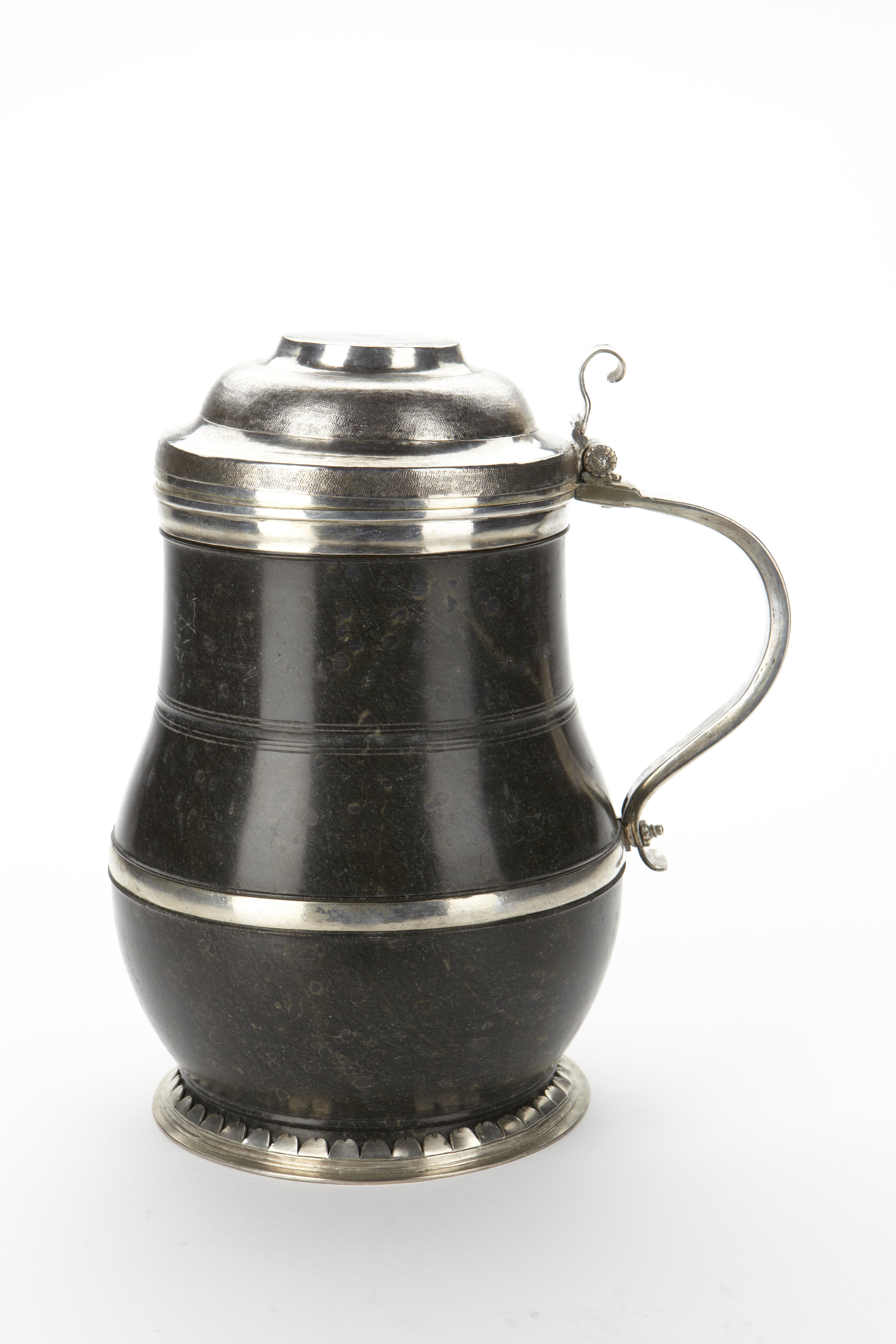 Sydtyskland eller Österrike, 1600-tal. Svarvad, mörkt grön serpentinsten. Montering i silver, insidan av locket förgyllt, utsidan med spår av förgyllning. Ostämplad. Låg fot. Locket välvt, med punsad och ristad dekor, invändigt förgyllt. På locket tumgrepp. Handtaget svängt. Runt kannans överdel silverband, liksom på bukens bredaste del. Runt foten silverbeslag med runduddig kant. På silverkanten under botten ristat "40.L". Sko inv. 1757: 1 st drickes kanna af Serpentin med beslag, handtag och lock af Silfwer, locket innan förgylt, 36:-
