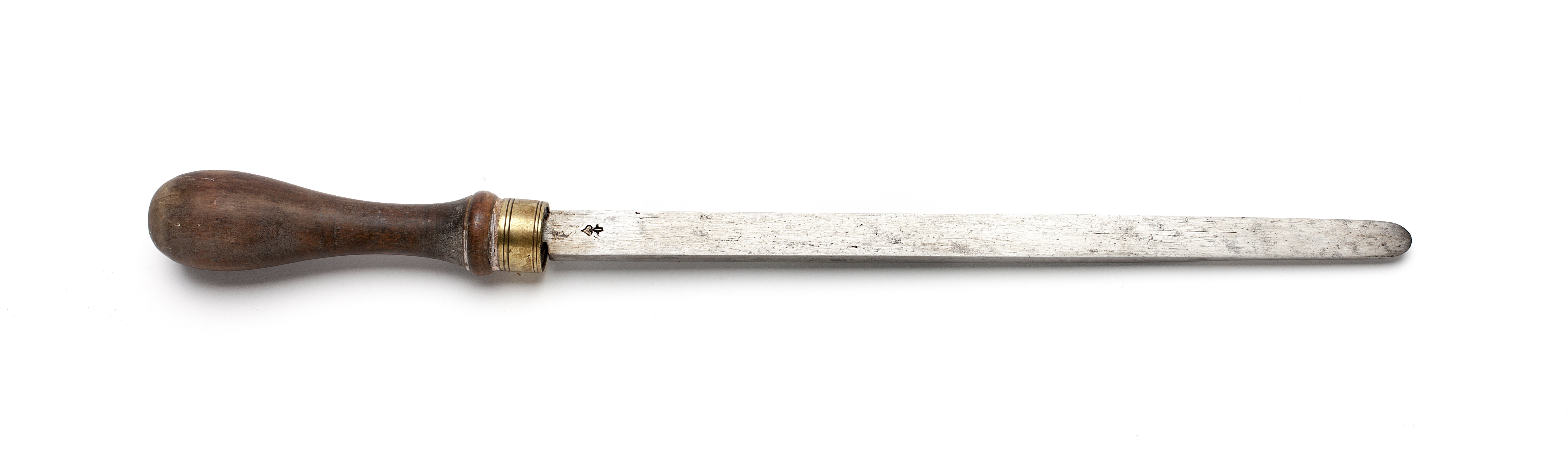 Klinga med rektangulär genomskärning. Undre kanterna avfasade i änden. Stämplat på klingan: hjärta under kors. Svarvat skaft av päronträ, med en vulst nedtill. Mässingsring.