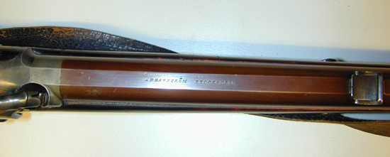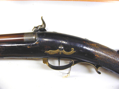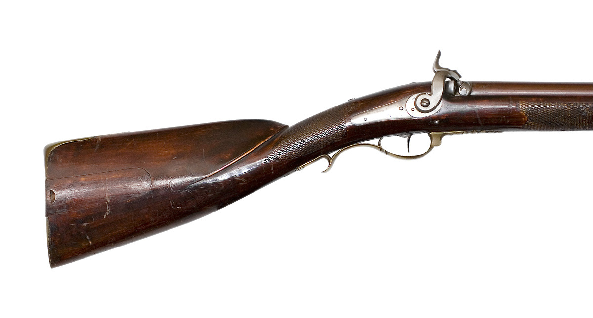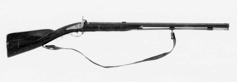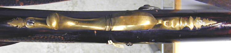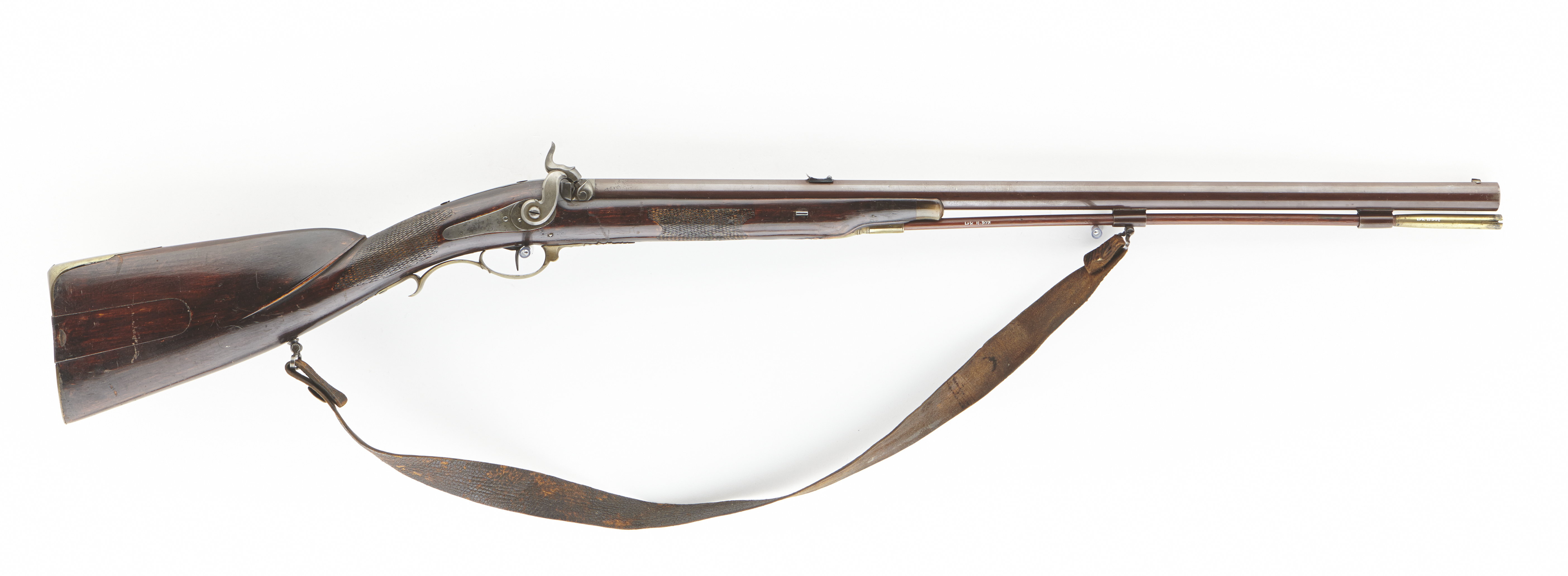 Rund, brunerad pipa, åtta breda räfflor. Siktbana från svanskruvbladet till mynningen. Pipbasen, L: 18 mm icke brunerad, på h. sida i godset snäcka med skärm bakom. Svansskruvblad långt med två blånerade skruvar. På siktbanan stämplat: "A.F. HAGSTRÖM STOCKHOLM". På pipans undersida två brunerade rörkor, på den bakre fäst en rembygel av stål. Riktmedel: Inlaxade riktmedel, blånerat sikte med bågformig platta, flyttbar i spår på klacken, på h. sida hela och halva inställningshack. Oblånerat stolpkorn. Fästning: Ett häfte. Pipan fäst med två blånerade krysskruvar, den främre skruvad i avtryckarblecket, ett blånerat engelskt pipstift. Slaglås med bakåtliggande slagfjäder, hane med fasade kanter, harmynt slaghuvud, nätskuret tumgrepp. Länk mellan slagfjäder och nöt, nötstudel fäst med tre skruvar, de två främre blånerade. Fästning: En blånerad låsskruv. Blånerad avtryckare. Rödbetsad halvstock med kolvlåda och kindstöd, lock i flykt med kolven, segment- formigt fingergrepp. Nätskuren kolvhals och framstock. Beslag av förgylld (?) mässing. Bakplåt med slät flik på kolvryggen, sidbleck i form av två bågar med skruvhålet på mittplatta, fasade kanter. Varbygel med främre profilerad arm, avslutad med urna och slätt, konturerat blad, vid framstolpen stämpel: CC, bygel med fasade kanter, kluven bakre stolpe, fri bakre arm med stämpel: MN, omvänt c-formig stolpe, en skruv. Blånerat avtryckarbleck. På kolvens undersida en rembygel av stål. Tillbehör: laddstock av trä, L: 767 mm, i tjockänden ett mässingsrör, L: 86 mm, i stockänden inuti röret en konisk fördjupning. Bärrem av läder, b: 38 mm, i bakänden knäppning med mässingsknapp för svenska flottan, d: 19,7 mm. I kolvlådan ett konvolut med krut, sju spetskulor med koniska spetsar, liknande kula för tappgevär m:1848 (Alm, Eldhandvapen II, fig. 11:1). d: 13,7 mm, h: 21,6 mm. En krats av stål och ett krutmått av mässing, L: 60 mm, med ring: 72 mm, d: ca 10 mm. Två vaxade linnelappar.