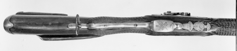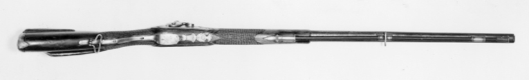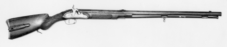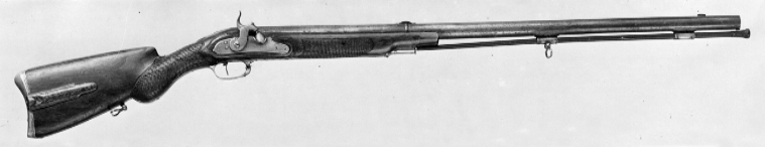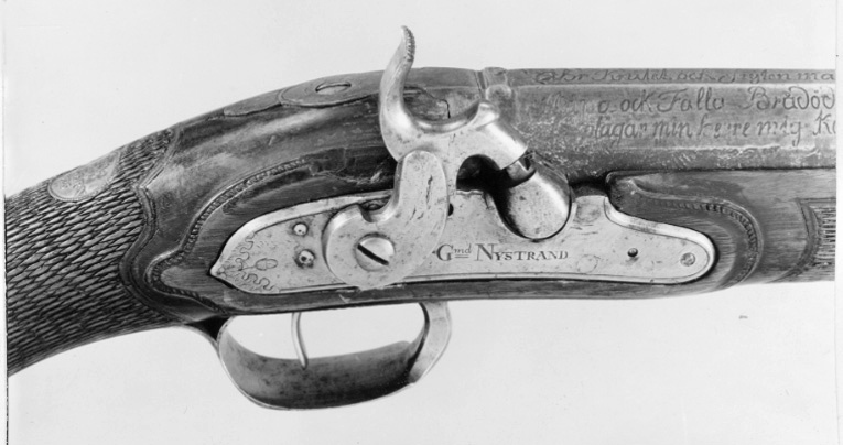 Rund, slätborrad pipa av brunerat stål med siktbana längs pipans ovansida, baskylhake baktill,tändhattssnäcka vid pipans h. sida. Vid mynningen en stödklack för laddstocken på pipans undersida, tvåfastlödda, rörformiga rörkor på rektangulära fästplattor, på den bakre en rembygel. Vid pipbasen en låg vulst på pipans ovansida. . På kammarn en lång, graverad text:"Hwad Jag sÿftar Uppå Jag hastigt // dödar ock Fäller Intet ünd slippa kan // Ähr Krutet ock fryten(?)man snäller hwad Jag sÿftar üppå det måste strax // stüpa och Falla Brådöd ähr mitt namn // så plägar min herre mig kalla". Riktmedel: Siktränna och löst sikte på ring runt pipan, spetsoval, skålad siktplatta med skålad siktränna längs mitten, balusterformiga spetsar i vardera änden. Långt stolpkorn av silver Fästning: Pipan fästmed baskylhaken, baskylbladet med krysskruv. Flintlås ändrat till slaglås, plant låsbleck med något fasade kanter, graverad kantlinje, vid bakspetsen övergående i en böljande linje samt blad och ett ekollon-liknande föremål. Framför hanen graveradsignatur: "Gmd NYSTRAND". Hane med nätskuret tumgrepp, harmynt slaghuvud. Länk nöt slagfjäder. Låset fäst med två låsskruvar. Halvstock av valnöt(?), provinstillverkad med pistolgrepp och nätskuren kolvhals och framstock, inskuren repstavsbård runt låset och sidblecksplattan (låsformig). Liten kolvlåda med lock av stockens trä,inskurna bladornamnet. Näsband av horn, övriga beslag av graverat stål. Bakpllåt med liten flik på kolvryggen, graverad kantbård i form av bladstav. Svagt s-formigt svängt sidbleck enbart mellanlåsskruvarna, graverad kantlinje samt blad vid skruvarna. Varbygel med bred platta,, graverad dekor iform av båge, pil och pilkoger lagda i kors över blommor. Fasetterad framstolpe och kluven bakre stolpe,främre armen konturerade och graverad i form av en urna på piedestal, bakre armen slät och går över kolvhalsen till kolvens undersida, där iskruvat den bakre rembygeln. På kolvhalsen en rund silverplatta med pärlstavskantbård och relieftext: "M.A. // VON // UNGERN // 1825". Vid varbygeln på låssidanstämplat i stocken "C. SUNDLÖF". I kolvlådan lapp, stämplad på ena sidan: "JÄGMÄSTAREN // E.G:SON HJORT //RÅSTORP // KISA", på den andra skrivet med bläck:" N:o 40 // Brådöd // se katalogen sid.33". Tillbehör: Laddstock av svartbetsat trä, l: 780 mm, skodd med horn.