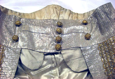 Knäbyxor av silvertyg, sydda av två fram och två bakstycken. En relativt rak modell med lucka mitt fram, 305 x 165 mm med tre knapphål i övre kanten. Luckan knäpps med motsvarande knappar sittande på midjelinningen. På midjelinningen sitter två inskurna horisontella fickor, 100 mm breda med markerade kantslåar, 25 mm breda. Intill vardera ficka sitter två knappar. En kil på midjelinningen mitt bak samt två spänntampar 140 mm långa och 40 mm breda. En knapp på vardera sida av linningen. Samtliga byxknappar är runda och klädda med guldtråd i ett snörmakeriarbete bildande en femuddig stjärna mitt på. Sprund mitt fram med knäppning av tre knappar och med motsvarande knapphål, 25 mm breda. Byxbenen avslutas vid knäna med en tillsydd kantslå, 30 mm bred. Vid byxbenens nederkant ett 78 mm högt sprund. Byxornas framstycken har en dekor av påsydda broderade guldkronor. Guldkronorna är av olika storlek, öppna kronor 38 x 30 mm samt slutna kronor 25 x 16 mm. Kronorna är av guldtråd, guldlan kantiljer av guldtråd samt guldpaljetter. Samtliga sömmar täcks av guldgallerspetsar. Guldgallerspetsarna är av guldtråd och guldlan i ett gallermönster kantade med kantiga flikar. Byxorna är fodrade med vit sidenatlas.
