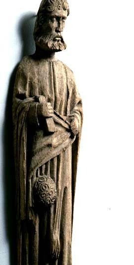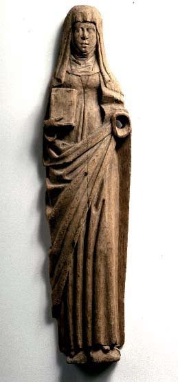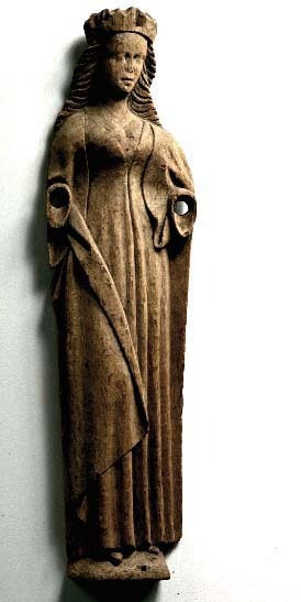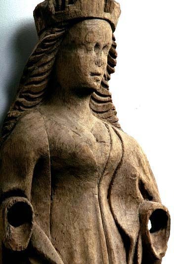 Kondition: Birgitta har förlorat sin vänstra hand, krönt kvinnligt helgon båda händerna, skulpturernas yta vittrad. Färg: all färg förlorad.