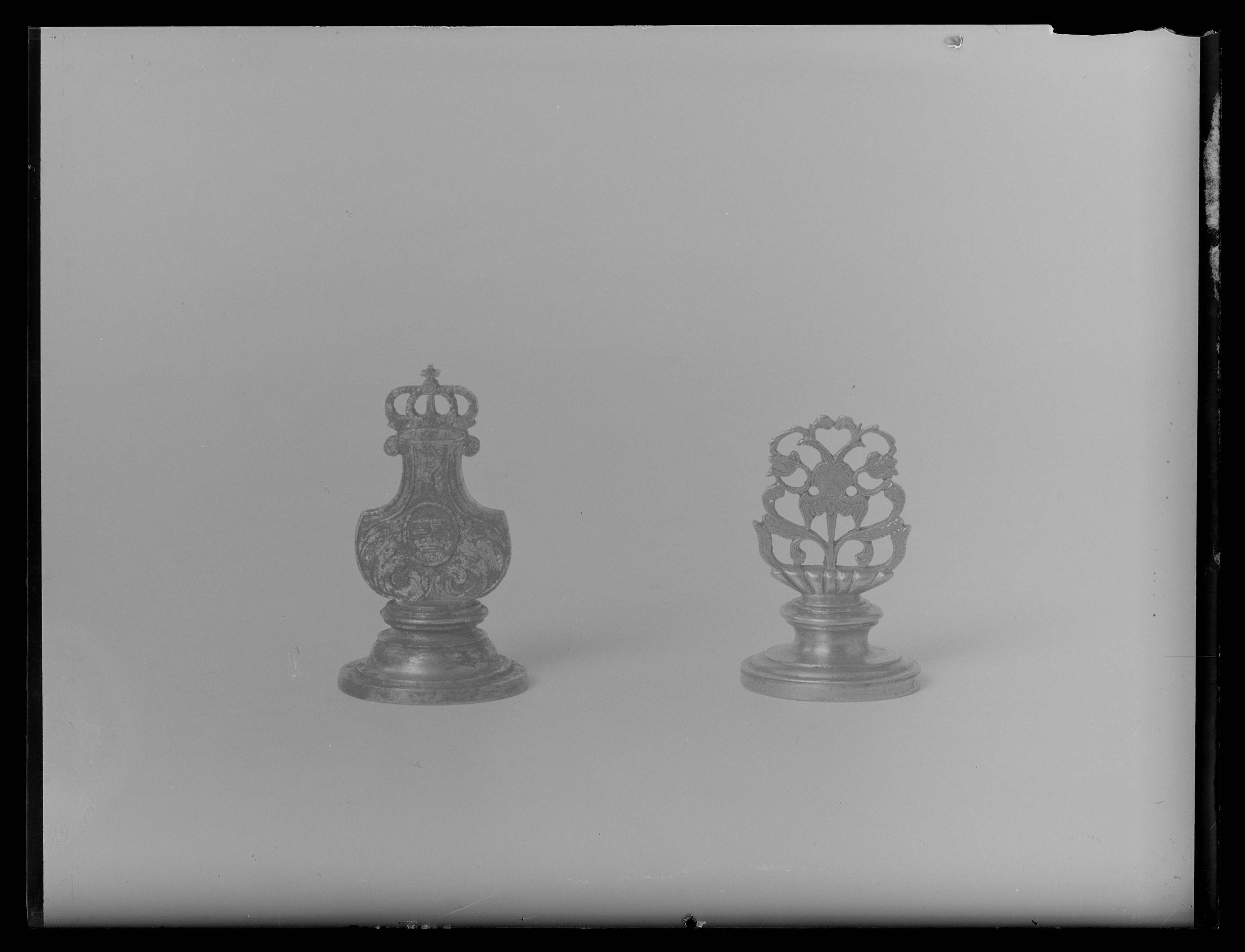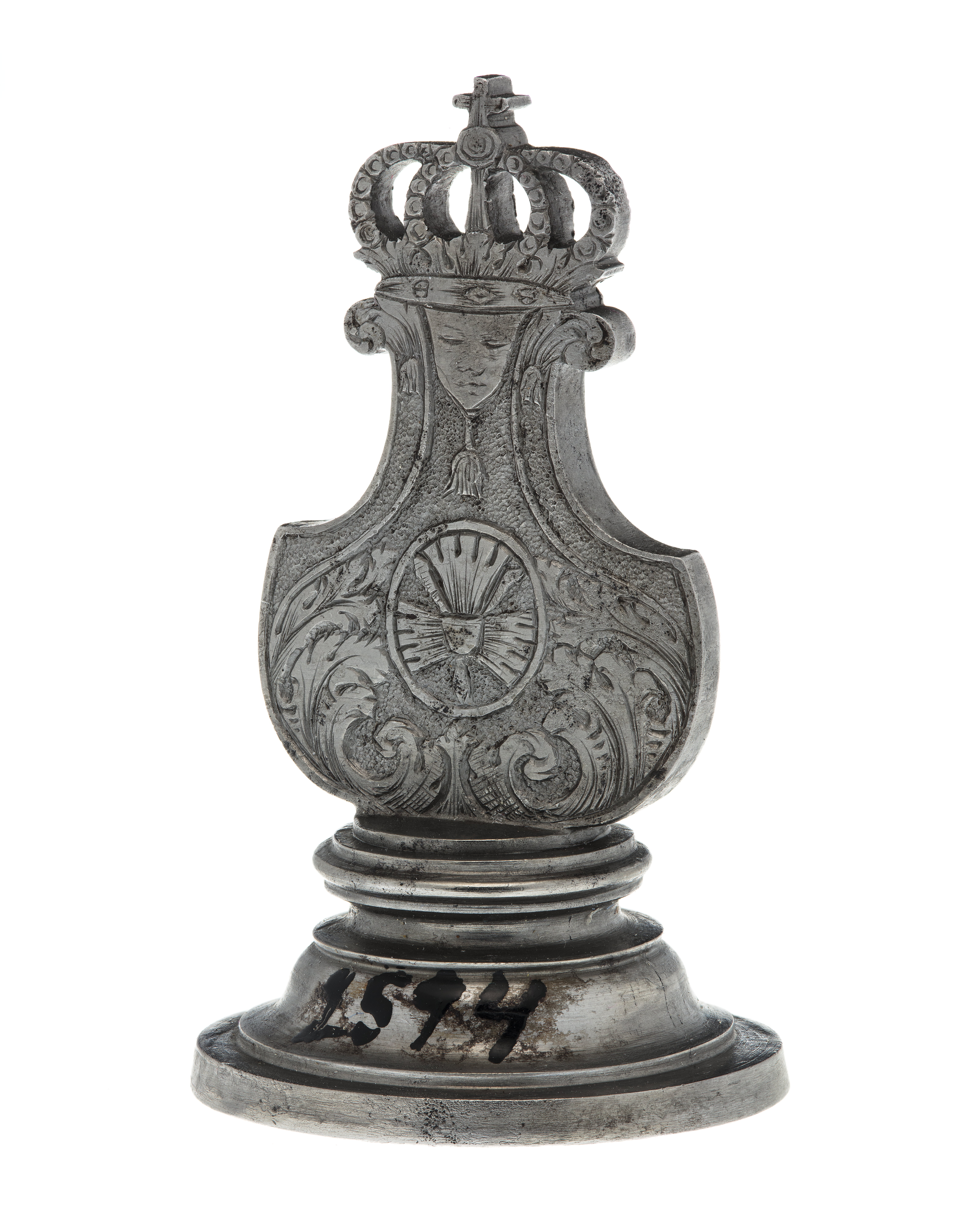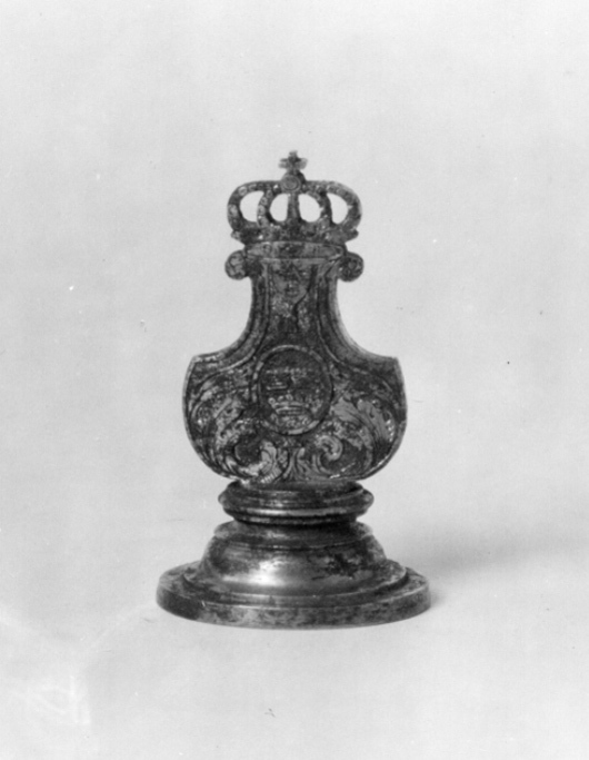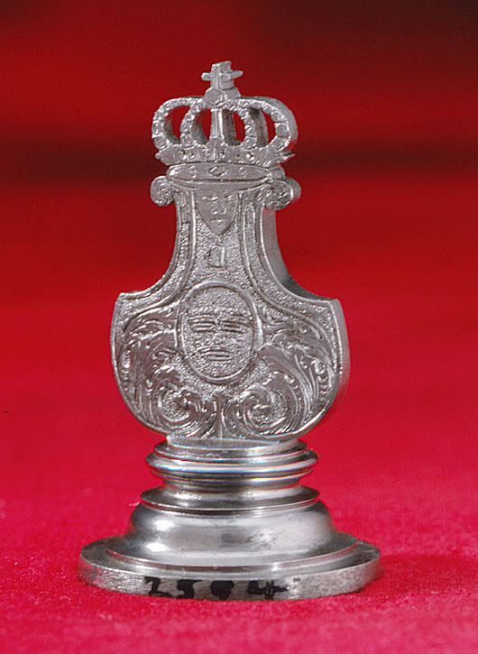 Signet för drottning Hedvig Eleonora av Sverige (1636-1715). Helt av stål. Oval platta, däri graverat alliansvapen. Kluven sköld, till höger svenska riksvapnet under huset Pfalz-Zweibrücken, till vänster Holstein-Gottorps vapen. Skölden krönt av kunglig krona, sköldhållare två krönta framåtblickande lejon. Postament av bladrankor. Spegelvänd text ovanför kronan, långa avstånd mellan bokstäverna: "H. E. R. S.". Kantbård av öppna kronor. Plattans ovansida svarvad, platt, lyrformigt skaft med graverad dekor, rankor, på mitten oval sköld med på ena sidan tre kronor, på den andra det Holsteinska nässelbladet, upptill lambrekäng med ansikte och tofs, överst genombruten, kunglig krona.