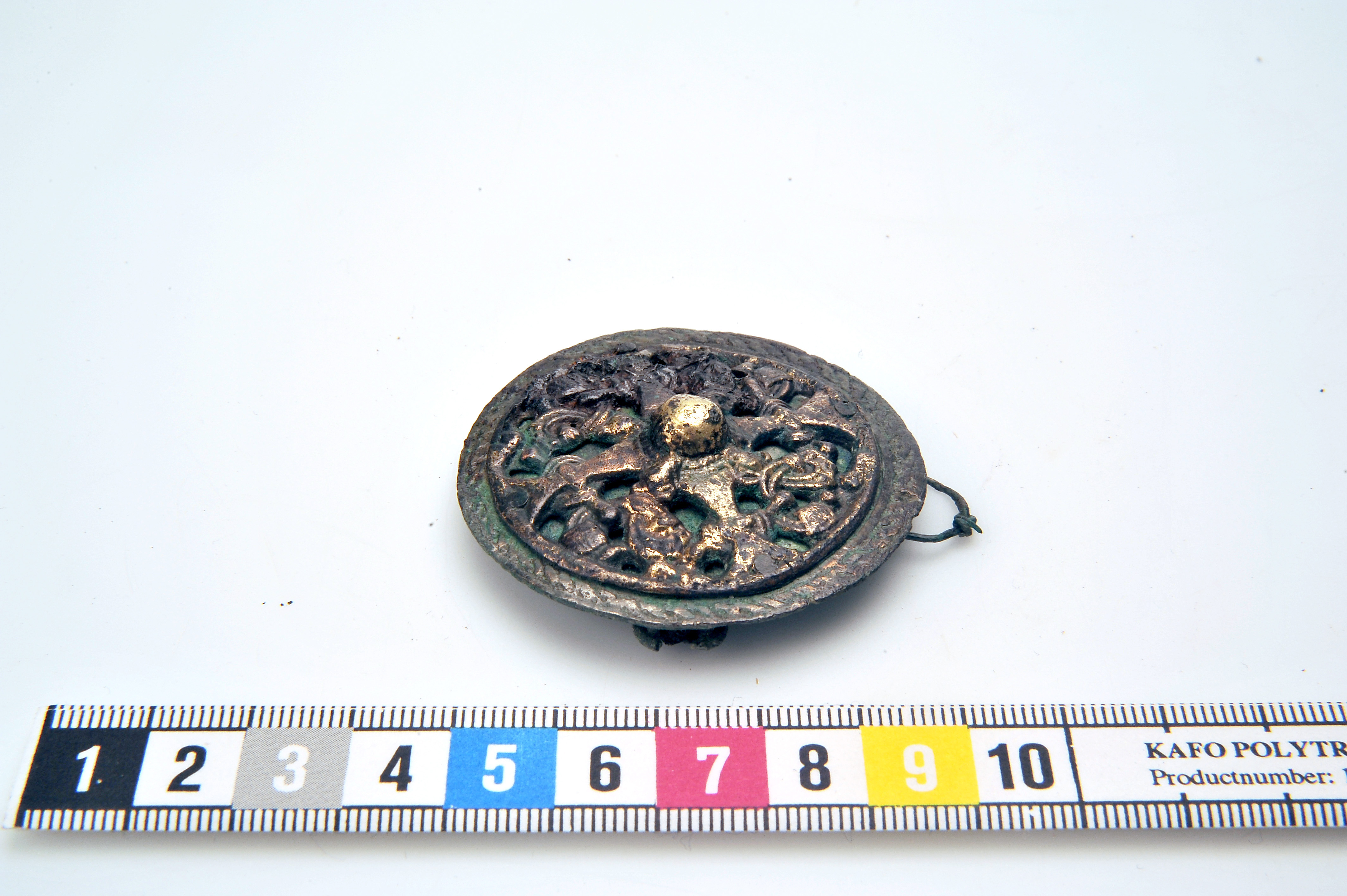 Dubbelskaligt rundspänne av förgylld brons med järnnål och mittknopp