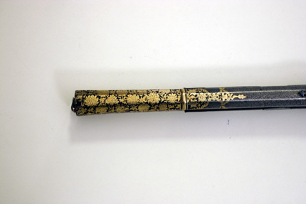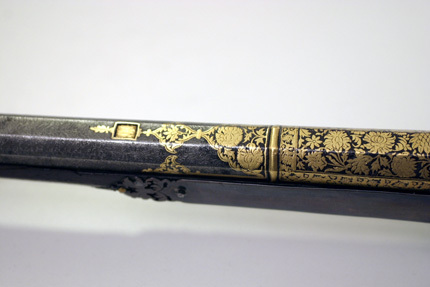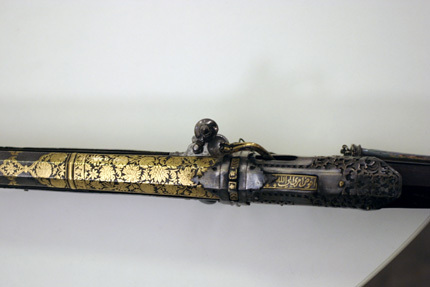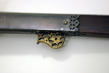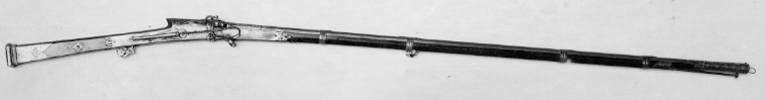 Åttkantig räfflad pipa av damaskerat stål, åtta räfflor, stjärnräffling. På svansskruvbladet inskrift av påslaget gul4d, arabiska: Aáfrazo Amri Allah (Jag lämnar mig själv och mitt öde till Gud). På kammarens ovansida yttäckande blomdekor av påslaget guld tvärgående vulst, dekoren avslutad med fyrkantigt nedsänkt fält (ursprungligen stämpel?). Mynningen vidgad med likadan yttäckande påslagen gulddekor och tvärvulst. Ståndsikte av stål med påslagen gulddekor. Knoppsikte av stål. Fängpanna av stål fäst i pipan, med horisontalt rörligt lock av silver välvt med knoppformig avslutning. Fem profilerade pipband av silver. Invändigt luntlås med böjd hane med genombruten luntklämma av stål med påslagen gulddekor. Hävstångsavtryckare av stål, genombruten i blomform med påslagen gulddekor. Brun helstock av trä, smal rak kolv med femkantigt tvärsnitt. Skarp utskjutande kolvnacke. Konturerat ändbeslag av silver, baktill utvidgat och profilerat med plan baksida. På kolvens sidor graverade bladornament ifyllt med niello (?). Genomgående runt hål i kolvens skott med silver med profilerat bleck. Stockens mitt beslagen med silver 425 mm långt med genombrutna ändar. Avtryckarbleck av silver med genombrutna ändar med graverad inskrift: doschman Kodaaz, därframför profilerat silverbeslag med graveringar inlagda med niello (?). På kolvnacken beslag av silver genombrutet i växtmönster. Näsband och överrörka av silver, profilerade, näsbandet graverat. I bakersta pipbandet kedja av silver med syl av mässing som sitter i hållare av silver på kolvsidans beslag. Två kantiga byglar av silver för gehäng.