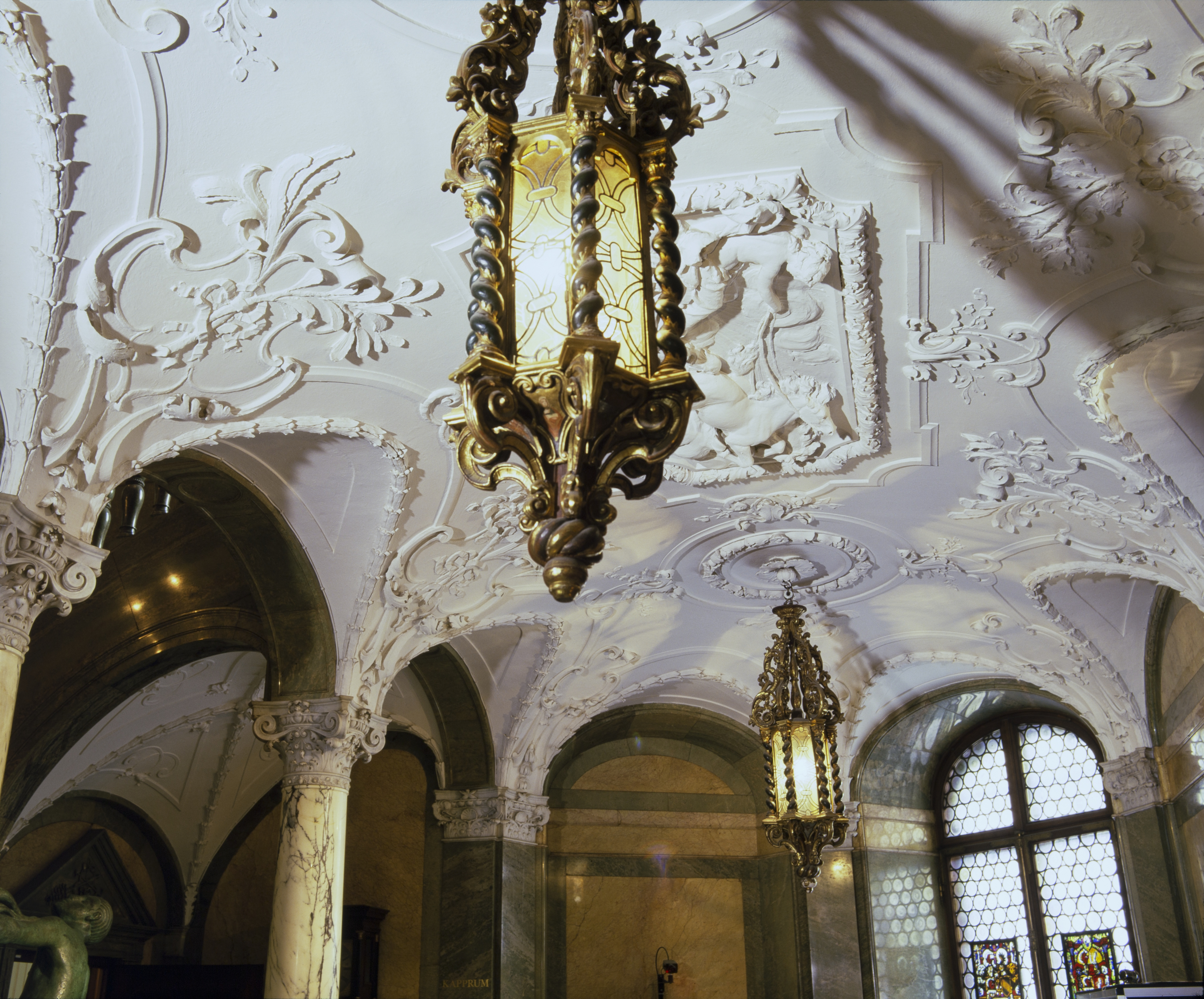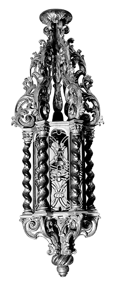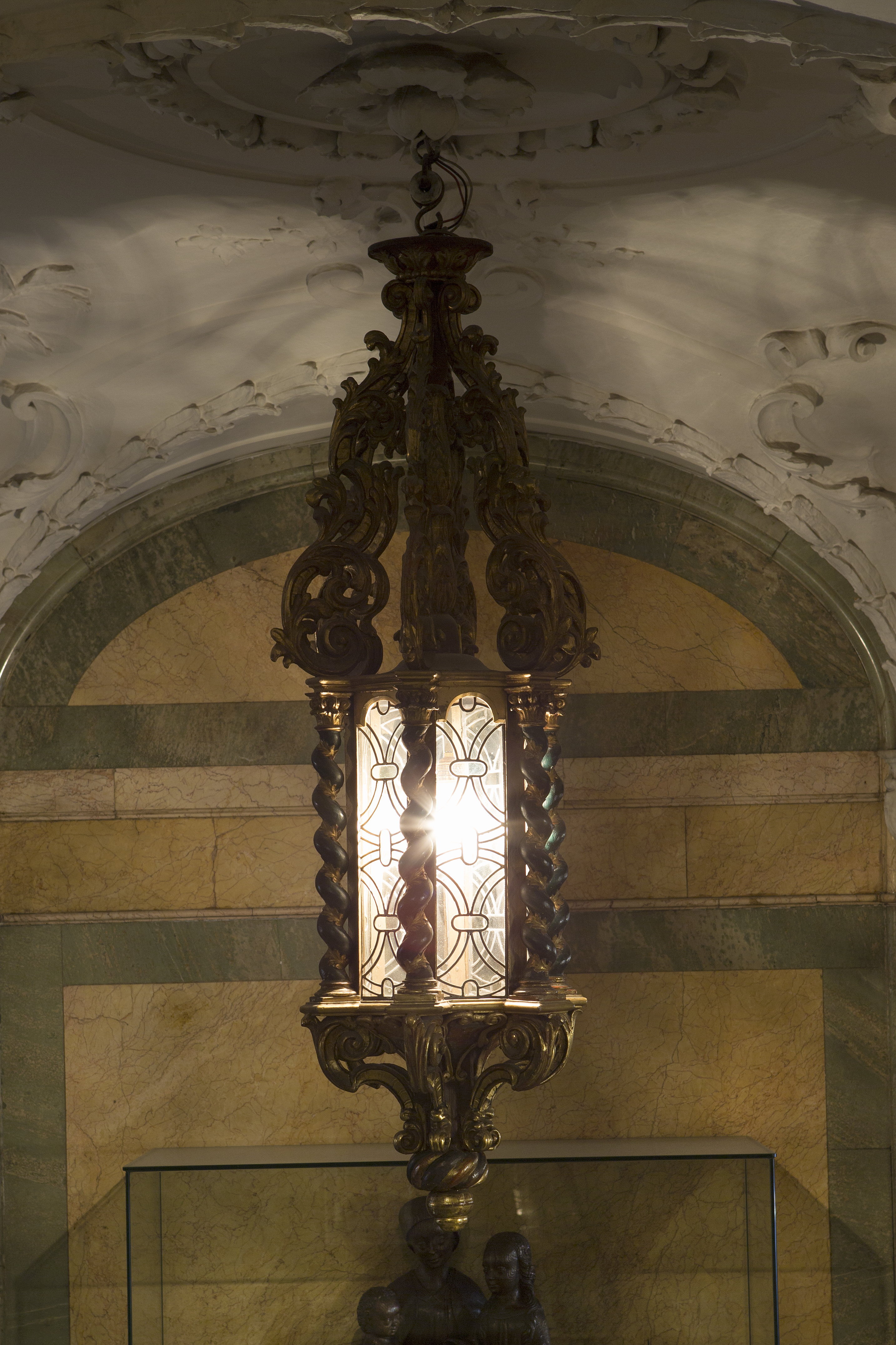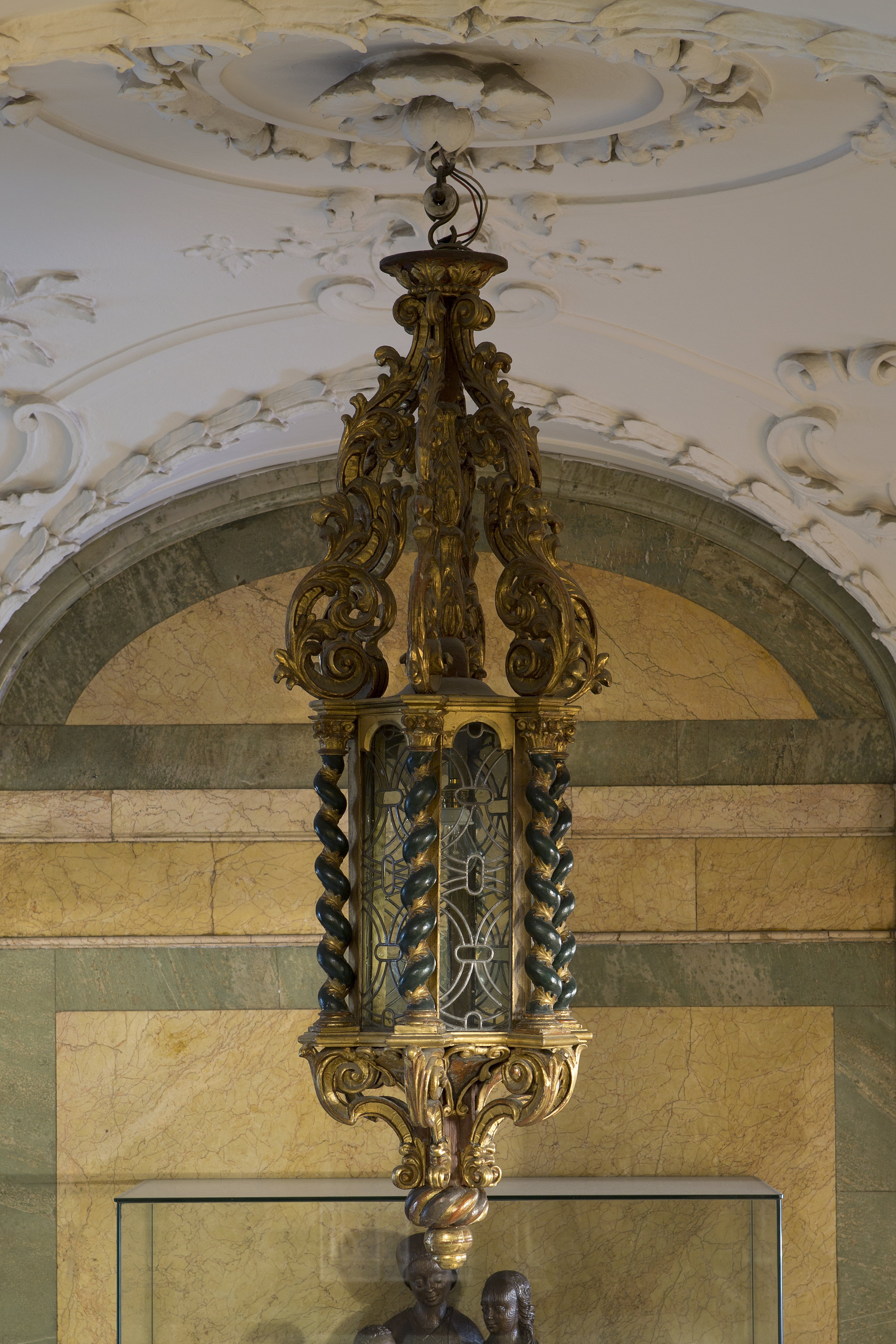 - Af trä och glas. Sexsidiga. Snidade, förgyllda och delvis målade. Stommen med hörnstolpar och hörnkolonner samt hela bottnar; de senare hvardera med plan insida och profilerad kant, från hvilken utgående vid hvarje stolpe ett fyrsidigt ut-språng för kolonnerna; stolparna med kälformig utsida; kolonnerna spiralvridna, målade i svartblått samt med profilerad bas på fyrsidig plint och med korintiskt kapitäl, bas och ka-pitäl förgyllda, längs fördjupningen mellan spiralhvarfven en förgylld bladranka i relief; upptill mellan stolparna en skifva, imiterande ett rundbågigt hvalf. Från nedre bottnens undersida utgående nedåt ett långt ihåligt spetsigt, efter bottnen sexsidigt understycke med insvängda sidor samt med spetsen afslutad i en snedgodronnerad vulst och en profilerad knopp, vulsten öfverst, med hvarannan valk målad i svartblått, hvarannan förgylld. Under hvarje utsprång en S-formad konsol med volutformiga ändar och afsmalnande nedåt, upptill å utsidan ett uppåtvändt bladornament. Mellan konsolerna upptill ett kontureradt kilformigt fält, omslutet på hvardera sidan af två sammanhängande bågar, den öfre S-formad, den nedre C-formad med ändarna utåt. I fälten olika målningar: I det första mot botten i guld en biskop med långt helskägg, i röd mössa (mitra) och röd dräkt, i vänstra handen krumstafven (kräklan) samt en bok; i andra fältet, räknadt åt höger, ett vapen med en bjälke i silfver mot röd botten, upptagande hela fältet; i det tredje i hvitt mot botten i guld ett heraldiskt åt vänster gående lamm med korsfanan och med tillbakavändt hufvud; i det fjärde ett vapen(?) med till synes en fyruddig stjärna i rödt, i hvars midt ett spetsovalt hvitt föremål, mot botten af silfver; i det femte en kvinna (abbedissa?) i hvitt dok, brunt lif och röd kjortel, hållande en uppslagen bok i vänstra handen, den högra mot bröstet, samt mot botten i guld; i det sjätte ett vapen (?) med en fläkt örn i rödt mot botten i silfver. Å öfre bottnens öfversida i midten en kupig upphöjning, i hvars midt en rödmålad cylindrisk knopp med rundad öfverända, från denna utgående uppåt en rak ståndare i två långsträckt päronformiga afdelningar, hvardera med längdgående uppåtvända bladornament; ofvanpå hvarje utsprång en snedt upp mot midten riktad grof akantusbladranka, något afsmalnande uppåt samt med öfre ändan fäst vid midtståndarens öfre ända, den nedre stödd på utsprånget; öfverst en rödmålad rund bricka med kupigt profilerad undersida samt å denna förgyllda, radiellt ställda utåtvända bladornament; å öfversidan en aflång takögla. Glaset något iriserande, fäst mellan stolparna samt bestående å hvarje sida af små olik-formade stycken, fattade i smala blyspröjsar, sammanförda till ett masverkliknande mönster med två öfver hvarandra ställda X-liknande figurer; det hela infattadt i en ram af bredare blyspröjsar, som sammanhålla styckena till en hel skifva, denna å en af sidorna med nedre hälften som lucka, med gångjärn vid vänstra kanten, vid den högra en vertikal skjutregel. Lyktorna monterade för elektriskt ljus; monteringen bestående af en stor lampa med enkel hållare. Höjd: 1.35 m. Italienskt arbete från 1600-talets slut eller 1700-talets början. Inköpta af Walther och Wilhelmina von Hallwyl, f. Kempe, 30 Augusti 1895 från guldsmeden och konsthandlaren J. Bossard, Hirschenplatz, Luzern, Schweiz, se rä-kenskapsutdrag från konsthandlaren J. Bossard 16 Oktober 1906. Ankommo 20 December 1895, se Rescontra (Huset n:r 4 vid Hamngatan). Betalda 23 December 1895. Pris: Frcs 800, se Rescontra (Walther von Hallwyl). Reparerade hos snickaren C. H. Benckert J:r, Regeringsgatan 63, Stockholm, se räkning 1895—1898. Betaldt 14 Juni 1900, se Rescontra (Walther von Hallwyl). Pris: Kr. 42. Delvis förgyllda med äkta guld samt målade hos förgyllaren Aug. Dahlstedt (f. d. G. Lönnmark), Sergelgatan 2, Stockholm, se räkning 21 Maj 1898. Betaldt samma dag, se Rescontra (Walther von Hallwyl). Pris: Kr. 90 (pr st. Kr. 45), se räkning.