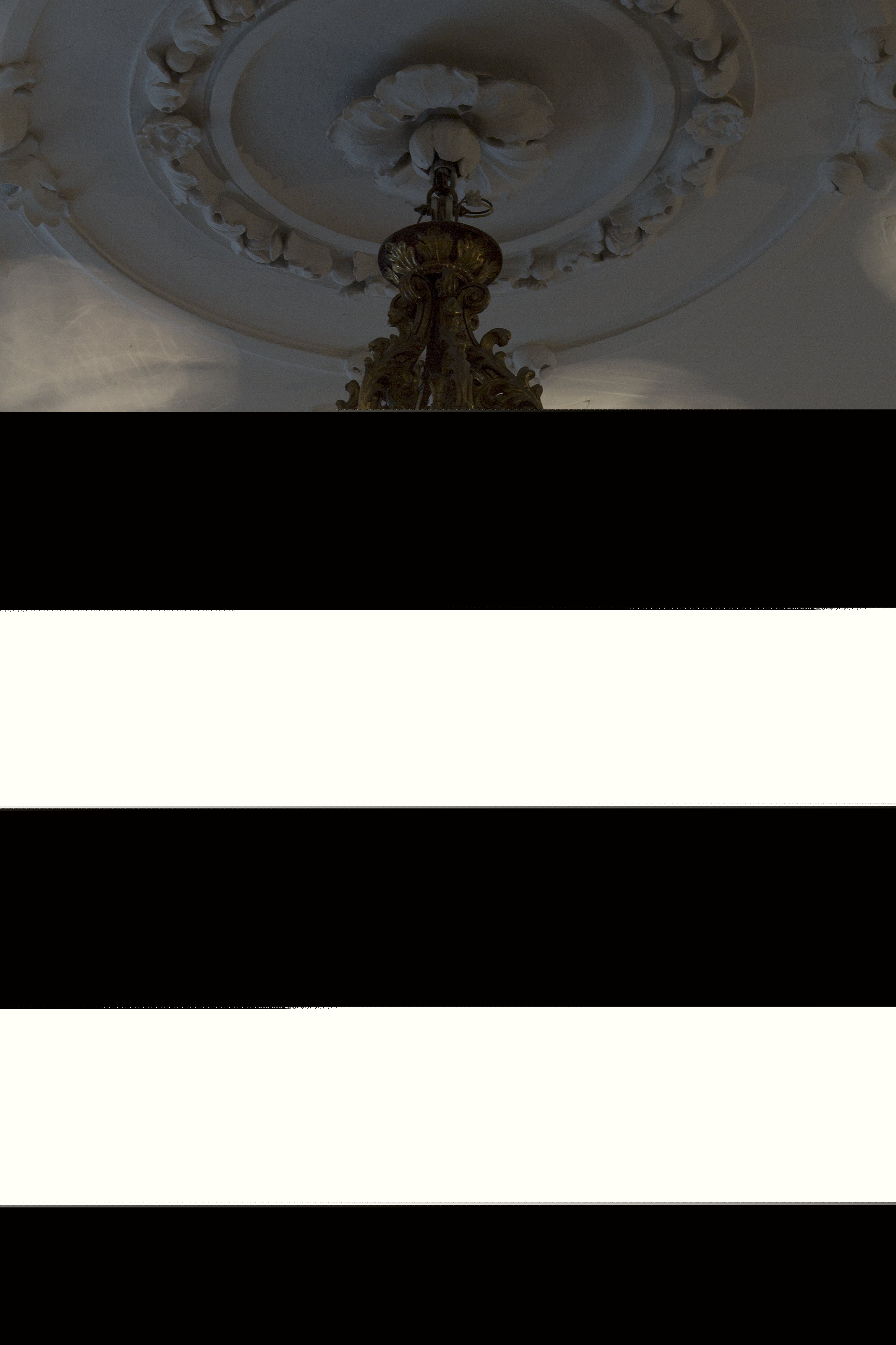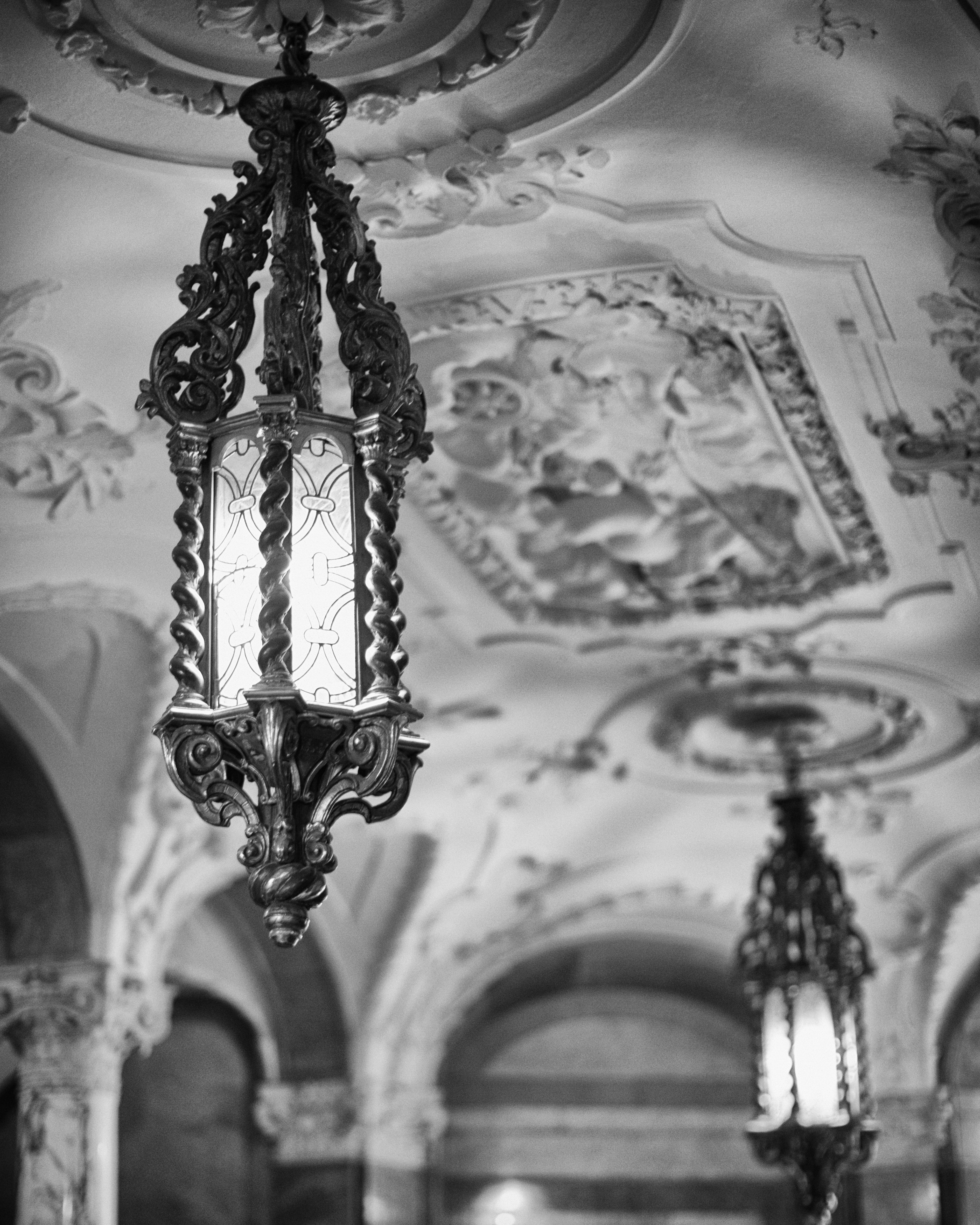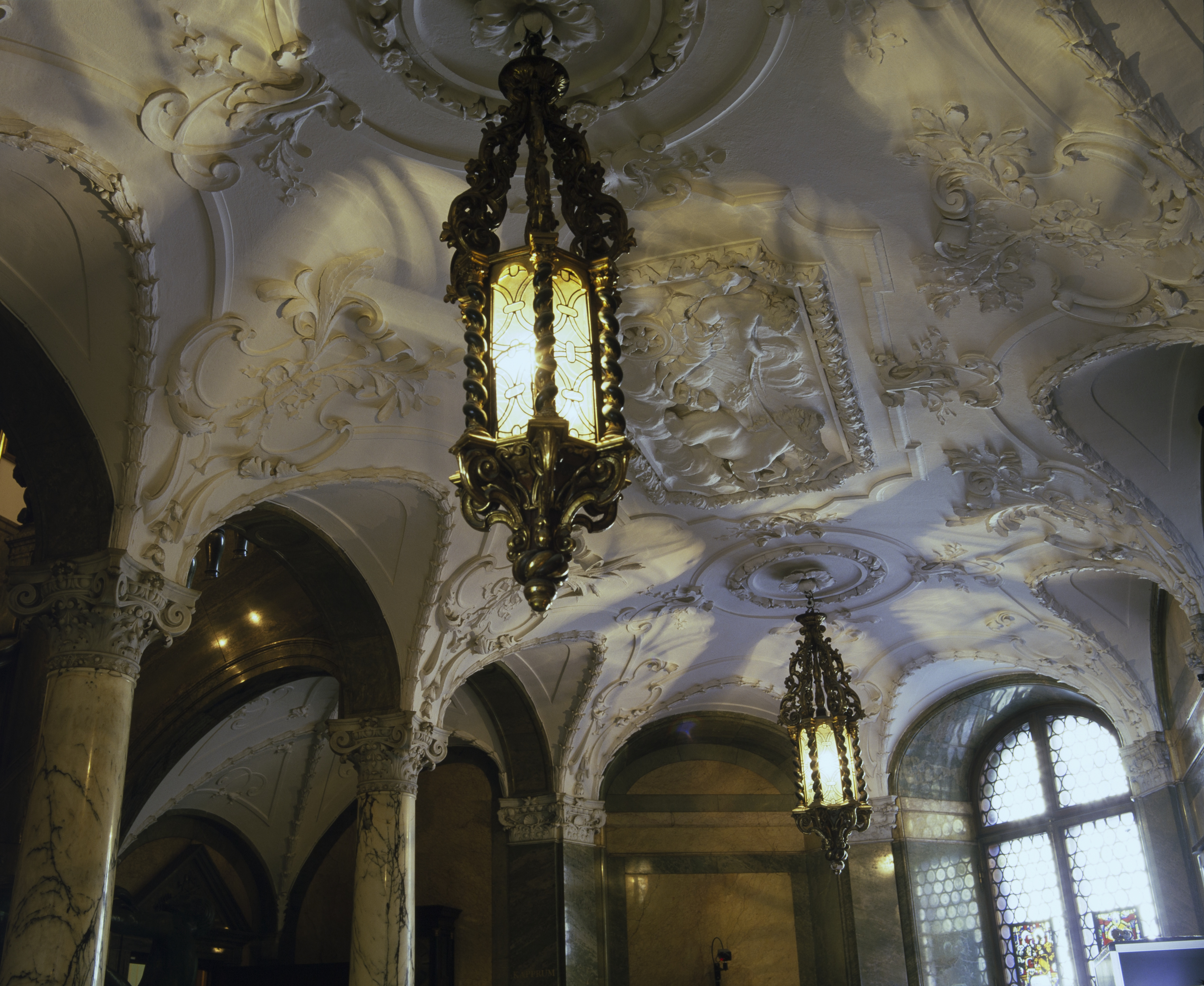 - Af trä och glas. Sexsidiga. Snidade, förgyllda och delvis målade. Stommen med hörnstolpar och hörnkolonner samt hela bottnar; de senare hvardera med plan insida och profilerad kant, från hvilken utgående vid hvarje stolpe ett fyrsidigt ut-språng för kolonnerna; stolparna med kälformig utsida; kolonnerna spiralvridna, målade i svartblått samt med profilerad bas på fyrsidig plint och med korintiskt kapitäl, bas och ka-pitäl förgyllda, längs fördjupningen mellan spiralhvarfven en förgylld bladranka i relief; upptill mellan stolparna en skifva, imiterande ett rundbågigt hvalf. Från nedre bottnens undersida utgående nedåt ett långt ihåligt spetsigt, efter bottnen sexsidigt understycke med insvängda sidor samt med spetsen afslutad i en snedgodronnerad vulst och en profilerad knopp, vulsten öfverst, med hvarannan valk målad i svartblått, hvarannan förgylld. Under hvarje utsprång en S-formad konsol med volutformiga ändar och afsmalnande nedåt, upptill å utsidan ett uppåtvändt bladornament. Mellan konsolerna upptill ett kontureradt kilformigt fält, omslutet på hvardera sidan af två sammanhängande bågar, den öfre S-formad, den nedre C-formad med ändarna utåt. I fälten olika målningar: I det första mot botten i guld en biskop med långt helskägg, i röd mössa (mitra) och röd dräkt, i vänstra handen krumstafven (kräklan) samt en bok; i andra fältet, räknadt åt höger, ett vapen med en bjälke i silfver mot röd botten, upptagande hela fältet; i det tredje i hvitt mot botten i guld ett heraldiskt åt vänster gående lamm med korsfanan och med tillbakavändt hufvud; i det fjärde ett vapen(?) med till synes en fyruddig stjärna i rödt, i hvars midt ett spetsovalt hvitt föremål, mot botten af silfver; i det femte en kvinna (abbedissa?) i hvitt dok, brunt lif och röd kjortel, hållande en uppslagen bok i vänstra handen, den högra mot bröstet, samt mot botten i guld; i det sjätte ett vapen (?) med en fläkt örn i rödt mot botten i silfver. Å öfre bottnens öfversida i midten en kupig upphöjning, i hvars midt en rödmålad cylindrisk knopp med rundad öfverända, från denna utgående uppåt en rak ståndare i två långsträckt päronformiga afdelningar, hvardera med längdgående uppåtvända bladornament; ofvanpå hvarje utsprång en snedt upp mot midten riktad grof akantusbladranka, något afsmalnande uppåt samt med öfre ändan fäst vid midtståndarens öfre ända, den nedre stödd på utsprånget; öfverst en rödmålad rund bricka med kupigt profilerad undersida samt å denna förgyllda, radiellt ställda utåtvända bladornament; å öfversidan en aflång takögla. Glaset något iriserande, fäst mellan stolparna samt bestående å hvarje sida af små olik-formade stycken, fattade i smala blyspröjsar, sammanförda till ett masverkliknande mönster med två öfver hvarandra ställda X-liknande figurer; det hela infattadt i en ram af bredare blyspröjsar, som sammanhålla styckena till en hel skifva, denna å en af sidorna med nedre hälften som lucka, med gångjärn vid vänstra kanten, vid den högra en vertikal skjutregel. Lyktorna monterade för elektriskt ljus; monteringen bestående af en stor lampa med enkel hållare. Höjd: 1.35 m. Italienskt arbete från 1600-talets slut eller 1700-talets början. Inköpta af Walther och Wilhelmina von Hallwyl, f. Kempe, 30 Augusti 1895 från guldsmeden och konsthandlaren J. Bossard, Hirschenplatz, Luzern, Schweiz, se rä-kenskapsutdrag från konsthandlaren J. Bossard 16 Oktober 1906. Ankommo 20 December 1895, se Rescontra (Huset n:r 4 vid Hamngatan). Betalda 23 December 1895. Pris: Frcs 800, se Rescontra (Walther von Hallwyl). Reparerade hos snickaren C. H. Benckert J:r, Regeringsgatan 63, Stockholm, se räkning 1895—1898. Betaldt 14 Juni 1900, se Rescontra (Walther von Hallwyl). Pris: Kr. 42. Delvis förgyllda med äkta guld samt målade hos förgyllaren Aug. Dahlstedt (f. d. G. Lönnmark), Sergelgatan 2, Stockholm, se räkning 21 Maj 1898. Betaldt samma dag, se Rescontra (Walther von Hallwyl). Pris: Kr. 90 (pr st. Kr. 45), se räkning.