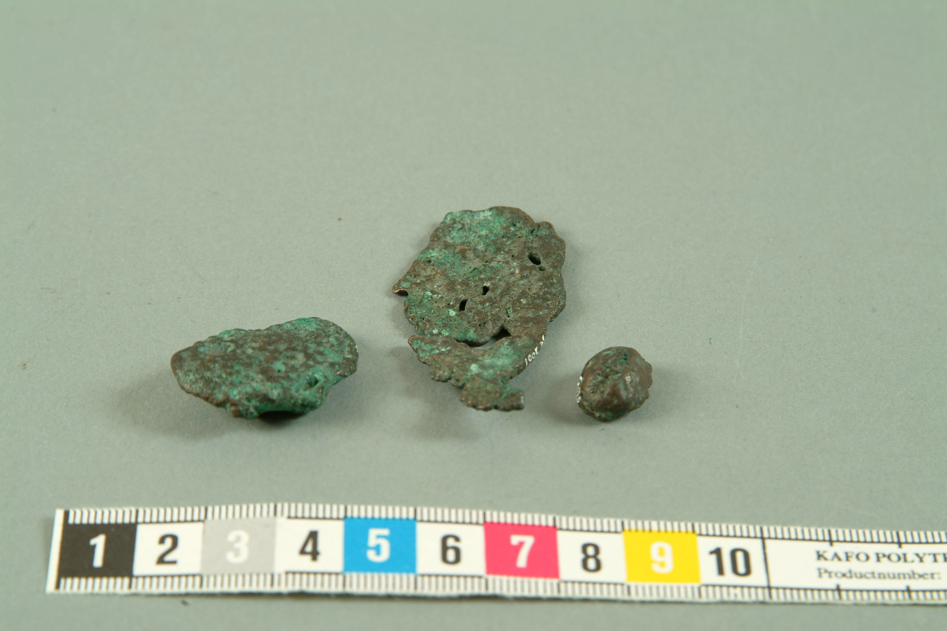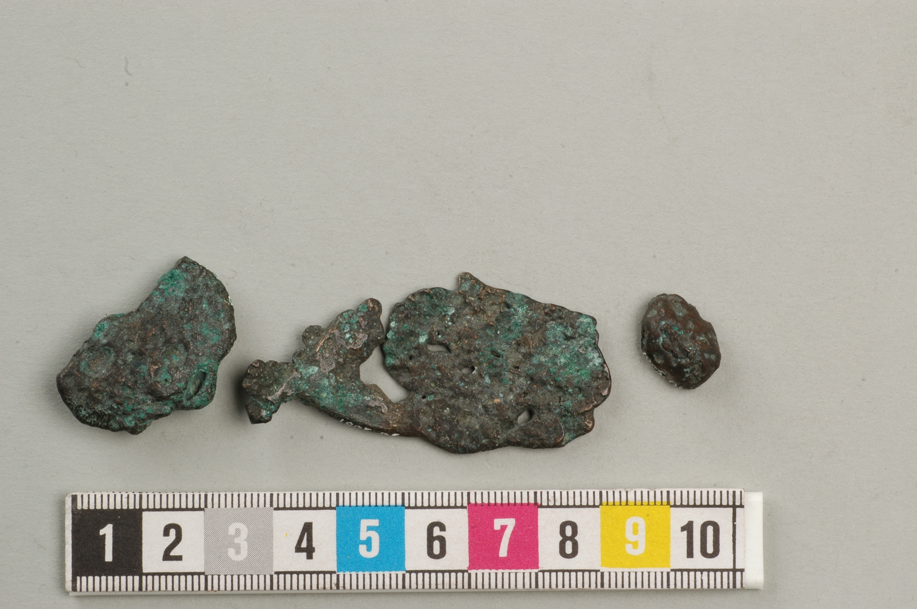 Tre bitar gjutavfall/smältor av brons. Den stora platta smältan är sågad för metallanalys 2009