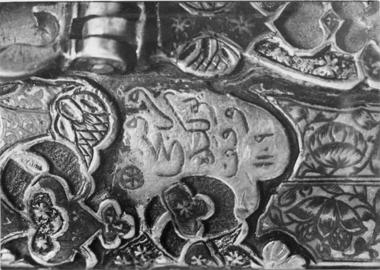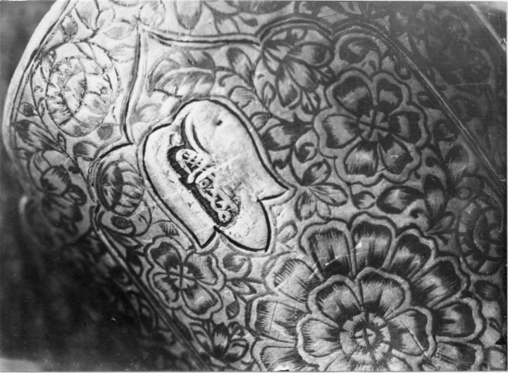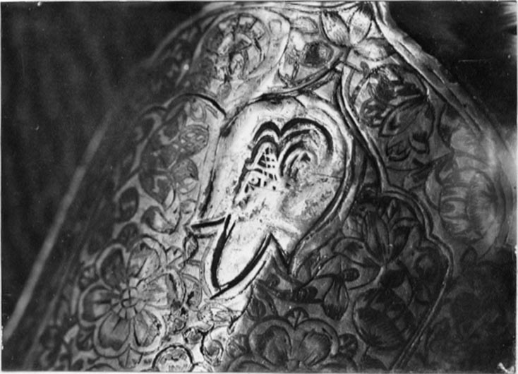 Balja med ovalt tvärsnitt, klädd med vinröd sammet, nästan täckt av två stora beslag, munbleck, 129 mm långt och släpsko med doppsko 211 mm förenade med varandra genom en smal spång på utsidan av förgyllt silver med ciselerad bladdekor i relief med niellering på utsidan, på insidan slätt med niellerad blomsterranka upptill och nedtill som utsidan. På insidan turkisk kontrollstämpel och inskrift. Invid mynningen en rörlig bygel. Baljan smalnar nedtill och avslutas med en stor kula ciselerad med blommor i relief och med nielleringar. Längst ned en kantig niellerad kula.