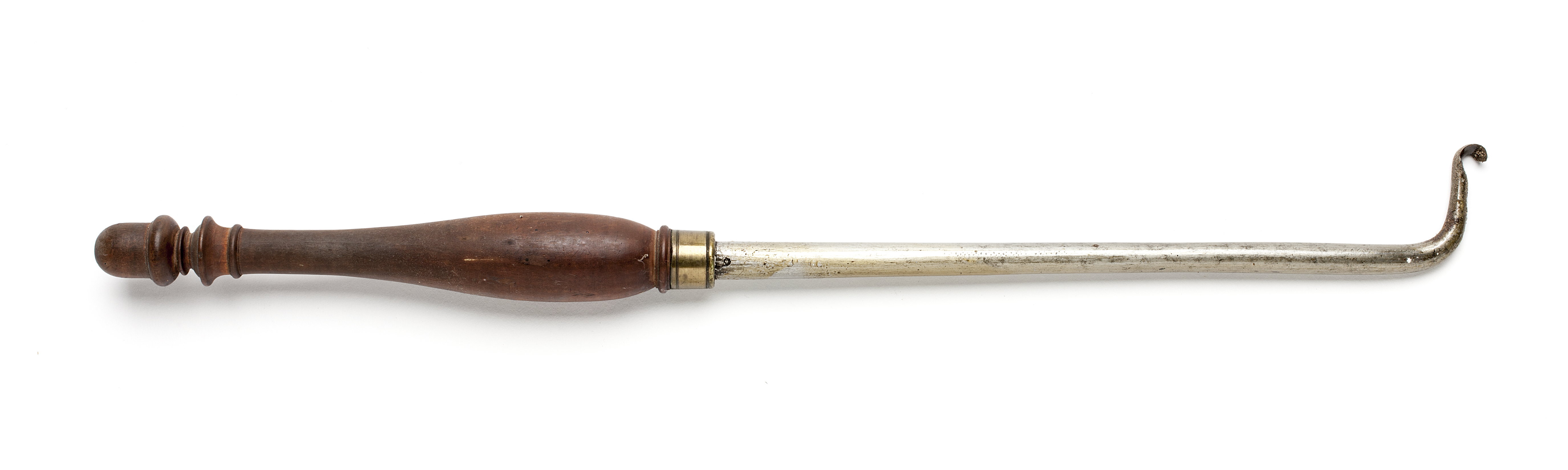 Rund klinga. Stämplat på klingan samt i skaftets ände vid fästet: "62" med stans nr 5375. Vinkelböjd ände, rundad längst fram. Egg efter rundningens ena sida. Svarvat skaft med ekollonsliknande knopp, mässingsring.