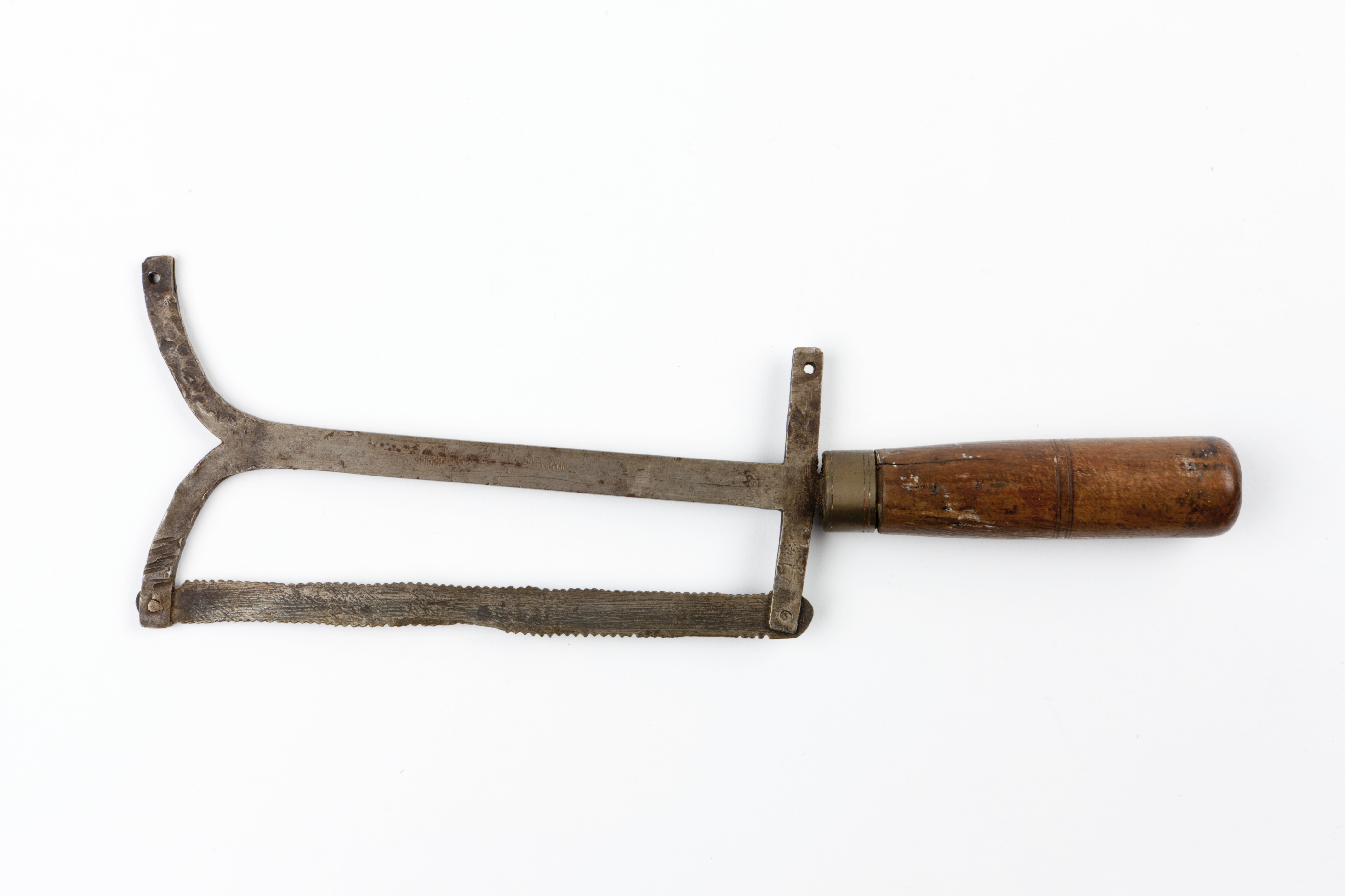 Bågens främre ände kluven i två likformiga bågar. Skaft av bok med mässingsring. Ett blad sitter i.