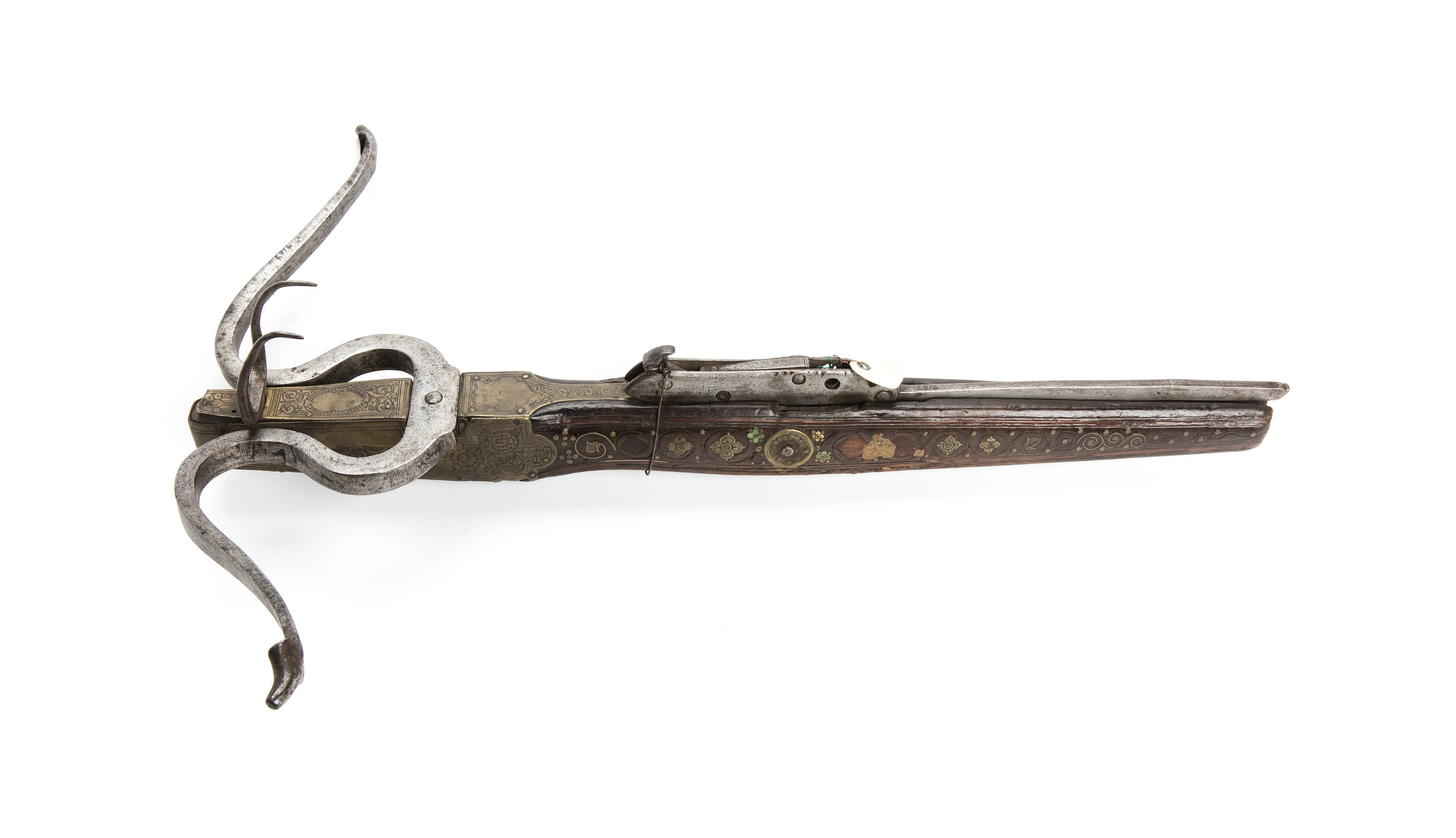 Båge av stål kraftigt s-formad. Låset friliggande på stockens ovansida med spännarm infälld i stocken. Stock av valnöt avsmalnande bakåt med på båda sidor inläggningar av mässingstråd samt däremellan fyrpassformiga figurer graverade med blommor. Runt dekoren inlagda små stjärnor av mässing. På stockens mitt genomgående bult, runt denna mässingsbricka med graverad blomma, omgiven av två gröna och två vita blomformiga beninläggningar. Stocken framtill beslagen med hel mässingsplåt med graverade blommor och rankor. På ovansidan mellan bågen en v-formad gaffel (för korn) med bakåtböjda skänklar. Ursprungligen i furst Alexander Sachovskojs samling, St.Petersburg, arv till mågen, greve Theodor Keller (död 1904) arv efter honom till sonen, greve Alexander Keller. Såld 1918 (före revolutionen) till Sverige. Såld 1920-03-05 hos Bukowski, kat. 225 (enl.inv.1867 nr 254), inköpt av legationssekreterare Harry Axelsson Johnson och skänkt till Lrk. Möjligen LRK U 746, Sachovskoj nr 254 (276, ENR 7969) Enligt Guy Wilson 1984-09-18 är armborstet engelskt. Enligt inv.1867 angivet som nederländskt eller spanskt, 1500-tal.