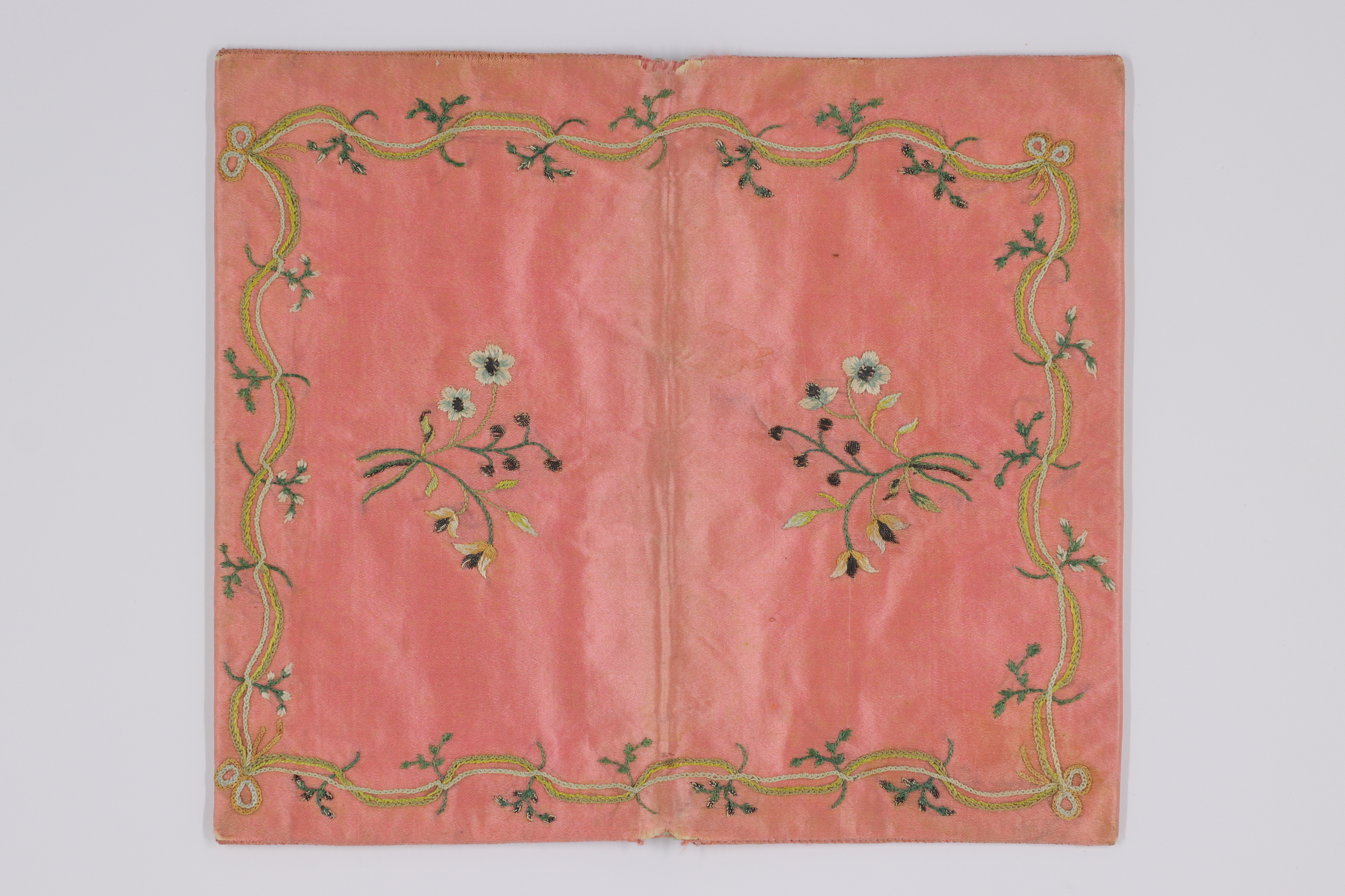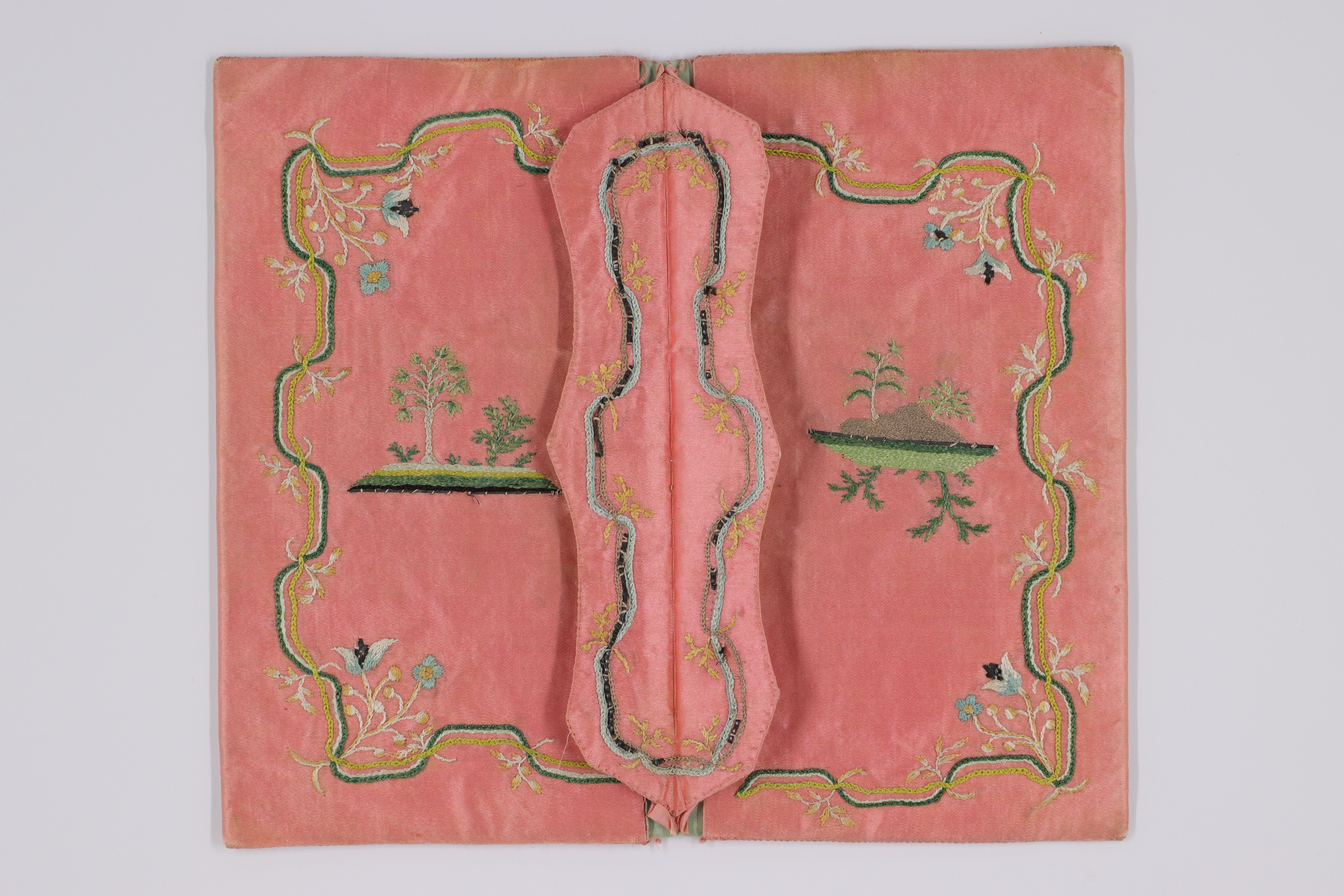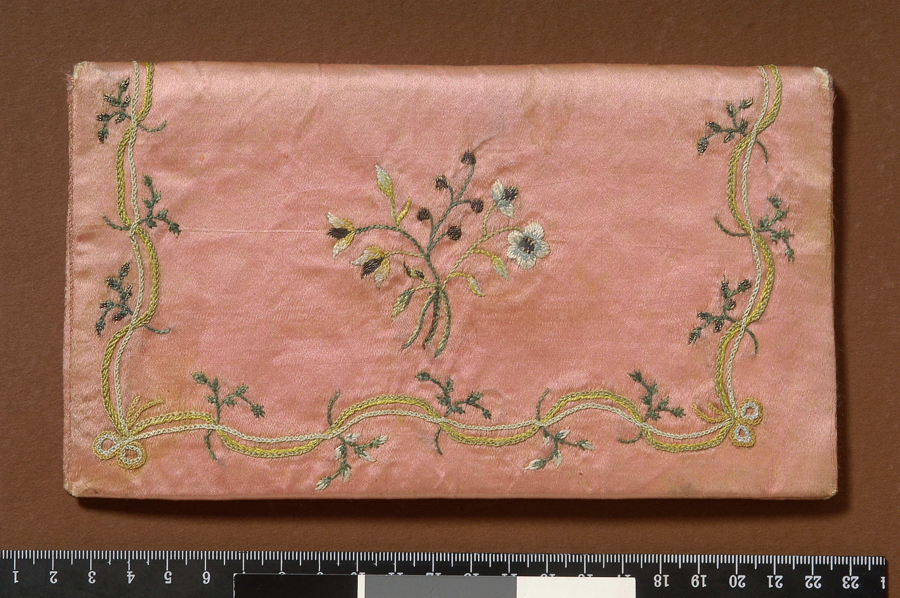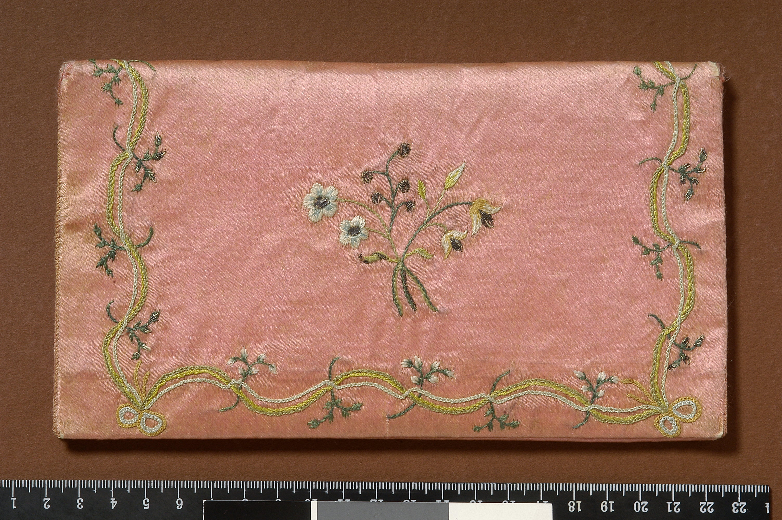 Rödrosa sidenplånbok, med broderier i kedjestygn och plattsöm i grönt, blått, vitt sidengarn och silvertråd. Fodrad med grönt siden. Insidans fickor försedda med lock. Insidans motiv går över hela uppslaget med en gemensam meandrande ram i vars hörn finns en liten blomsterbukett. På vardera ficka är ett naturmotiv broderat. Även locken är broderade. Utsidan broderad som en bandgirland i vilken här och där finns små kvistar. På vardera halva är en blomsterbukett broderad.