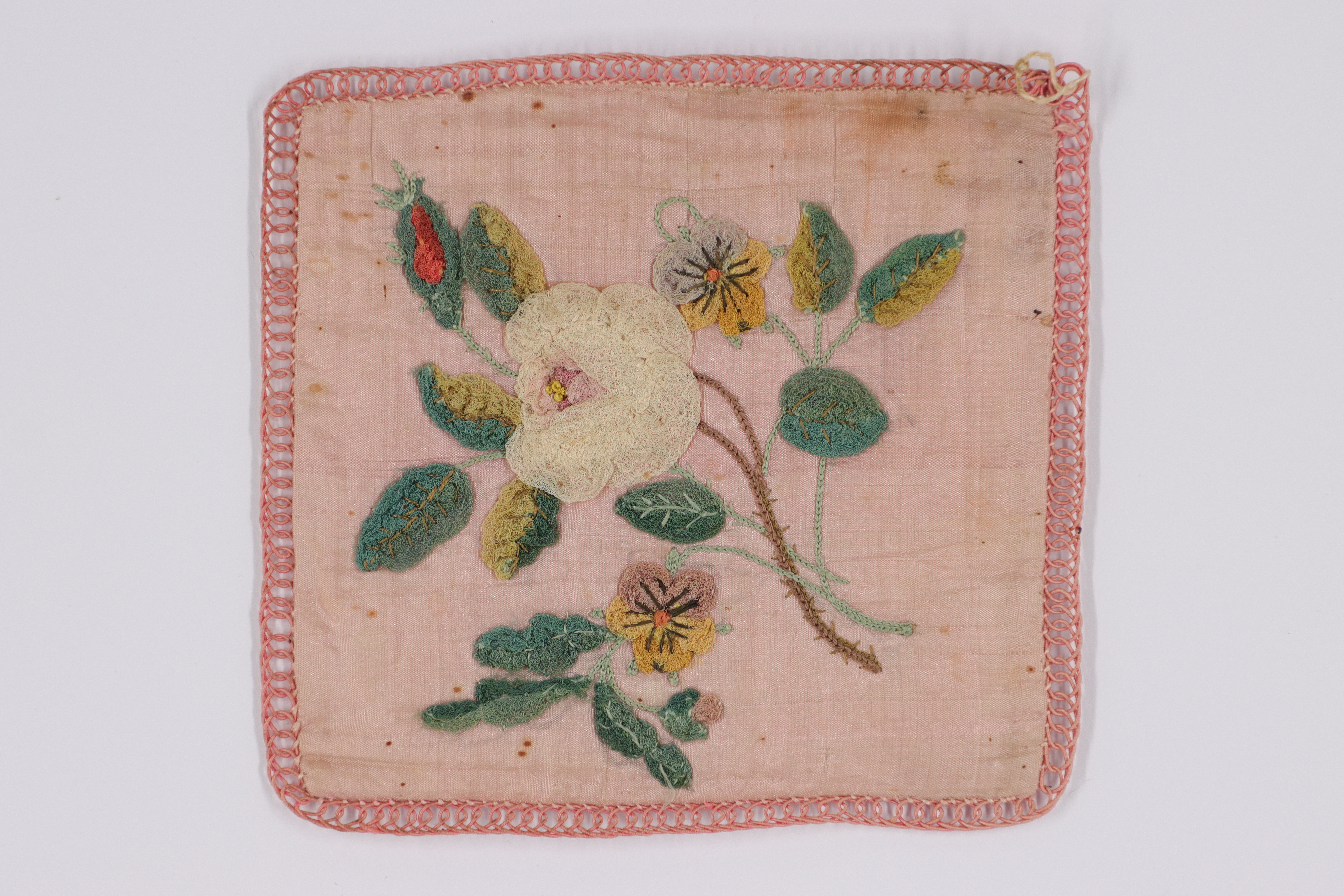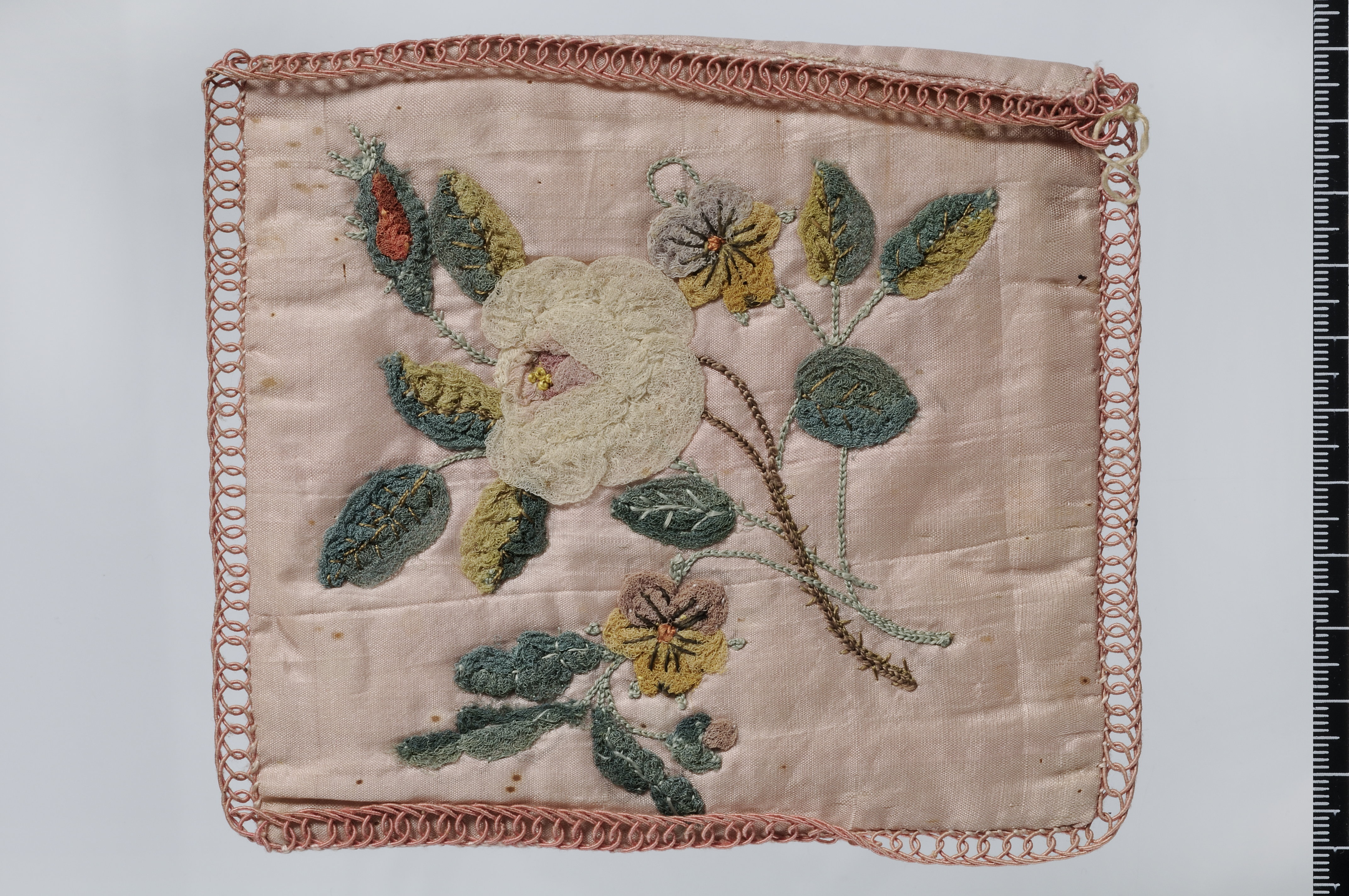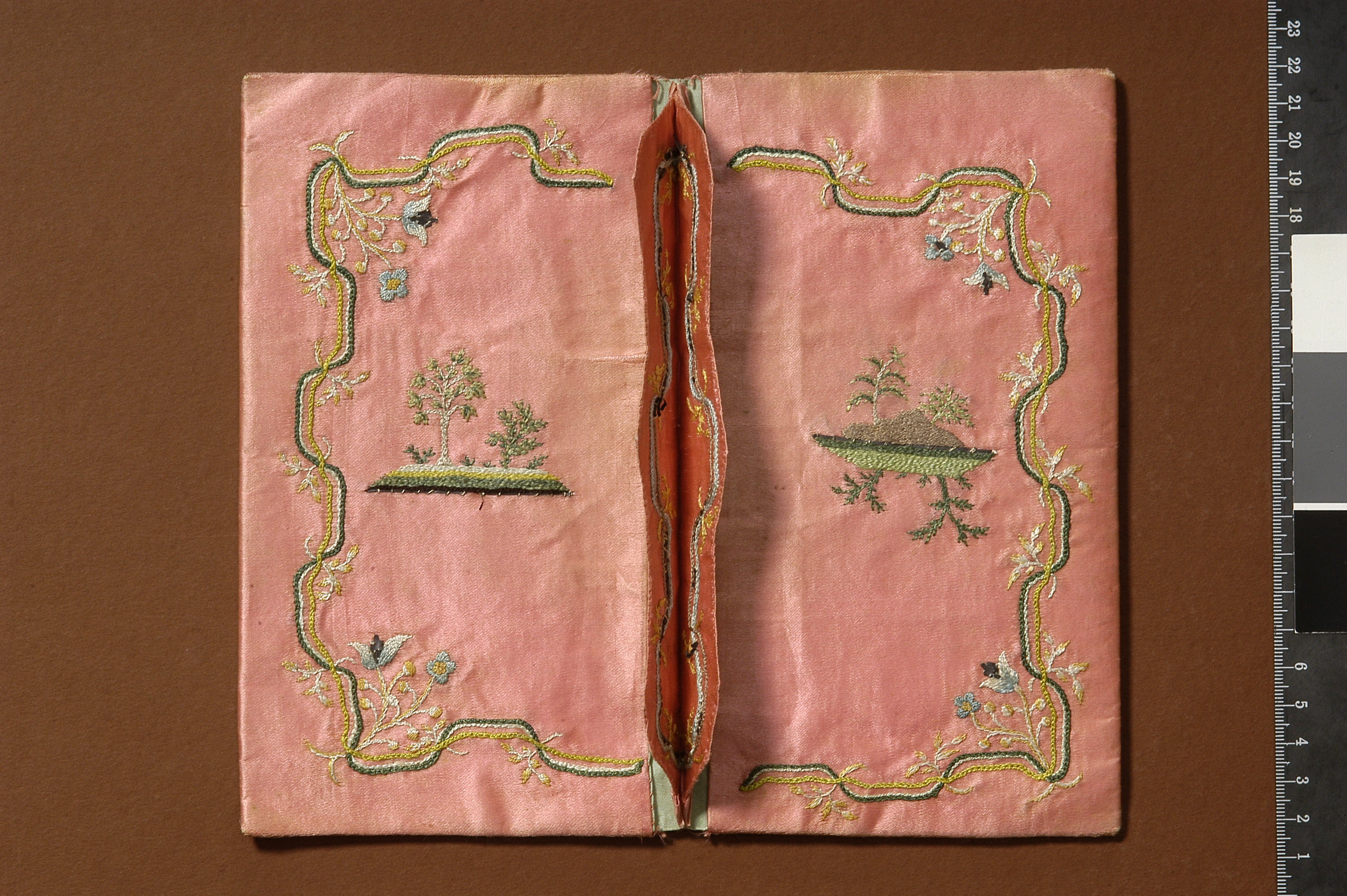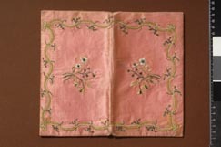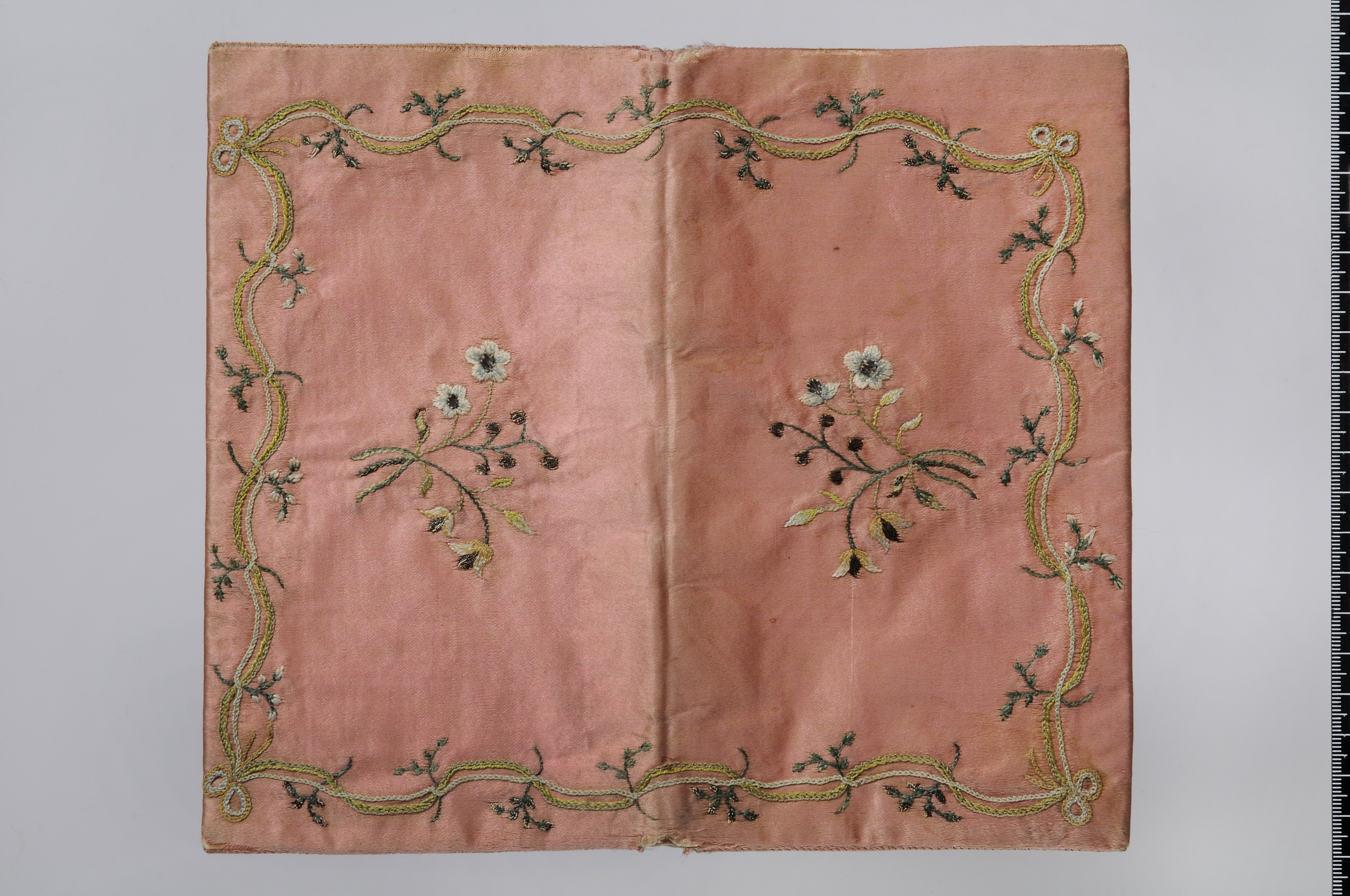 Rödrosa sidenplånbok, med broderier i kedjestygn och plattsöm i grönt, blått, vitt sidengarn och silvertråd. Fodrad med grönt siden. Insidans fickor försedda med lock. Insidans motiv går över hela uppslaget med en gemensam meandrande ram i vars hörn finns en liten blomsterbukett. På vardera ficka är ett naturmotiv broderat. Även locken är broderade. Utsidan broderad som en bandgirland i vilken här och där finns små kvistar. På vardera halva är en blomsterbukett broderad.