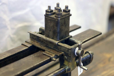 Mataranordning av stål. Nertill fäste av vinkeljärn, passande på svarvens (nnr 18412) skenor. På fästet två skenor med sidostycken. I sidostyckena borrade och gängade hål. Genom dessa gängad tapp med i änden ögla. Upptill fyrkantig stålblock med stålplatta fäst med skruvar, undertill mässingsklack. Genom klacken löper den gängade tappen. Genom att vrida på tappen flyttas stålblocket i sidled. Under hela anordningen sitter ett genomborrat gängat mässingsblock. Detta är påskruvat en gängad och med ratt vridbar stång på svarven.