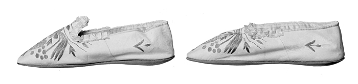 TOFFLOR i pumpsmodell, ett par Av vitt getskinn med guldbroderi. Vändsydda. På vardera sidan på mitten en tvärgående söm (s. k. sidosöm), spannad på insidan. På ovanlädrets främre kant en spetsig tunga. Broderiet sytt i plattsöm med guldtråd, mönstret på framstycket bestående av en ananasfrukt. Kring fotöppningen ett ljusrött tvåskaftat sidenband, framtill över vristen ett rysch av samma band som kantbandet. Sulor raka, av ljusbrunt tunt läder, med tvärskuren tå samt utan klack. Foder av siden (merveilleux); fodersula vadderad (s. k. polstrad), av samma material. Mått: Längd: omkring 22 cm.; bredd: omkring 5,5 cm. Gåva till Johanna Wallis sannolikt på hennes första lysningsdag, 26 November 1843. Johanna Wallis brudtofflor.