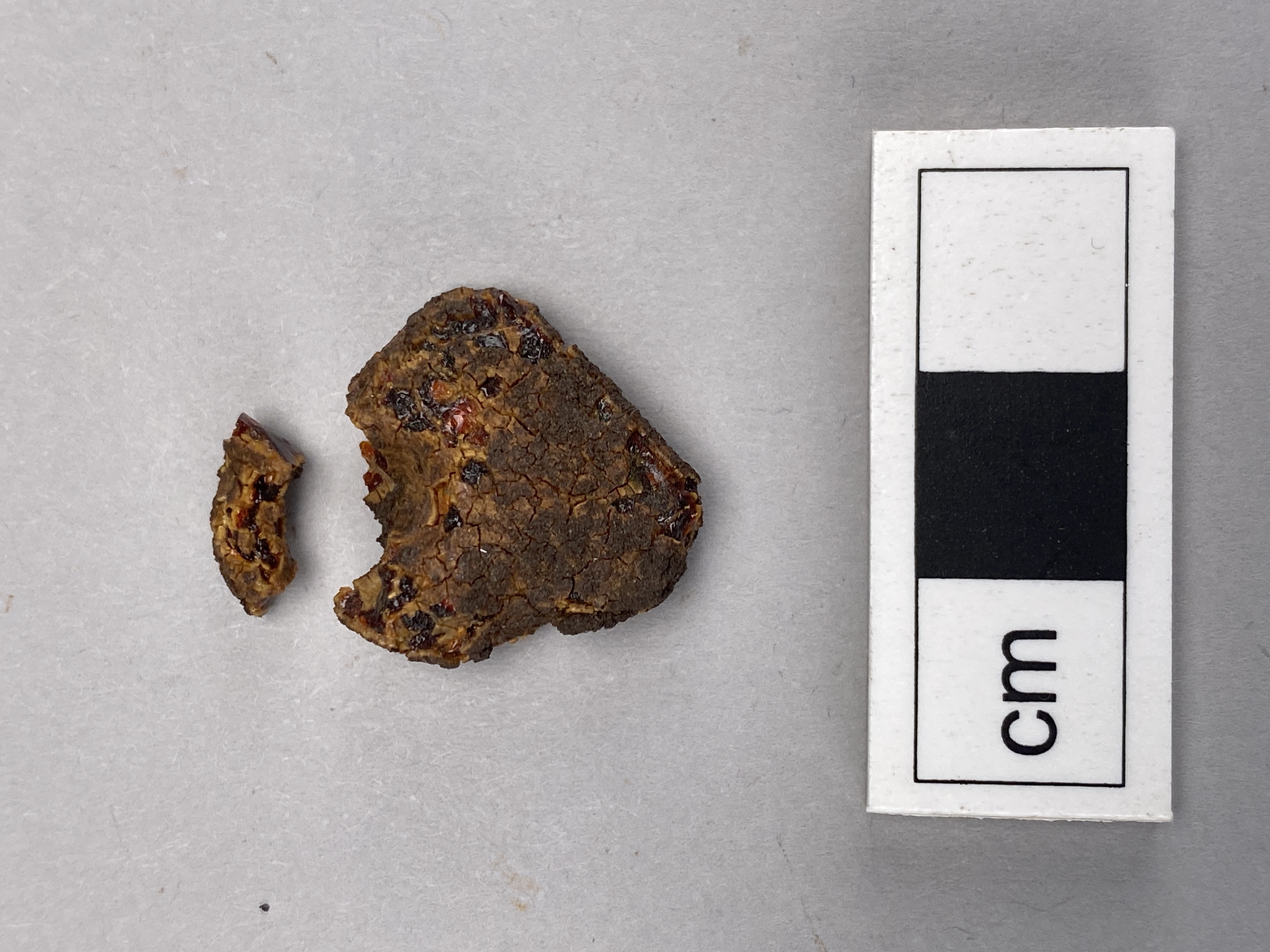 Bärnstenspärla, fragmentarisk. Isärbruten vid genomborrat hål, med ett löst fragment.