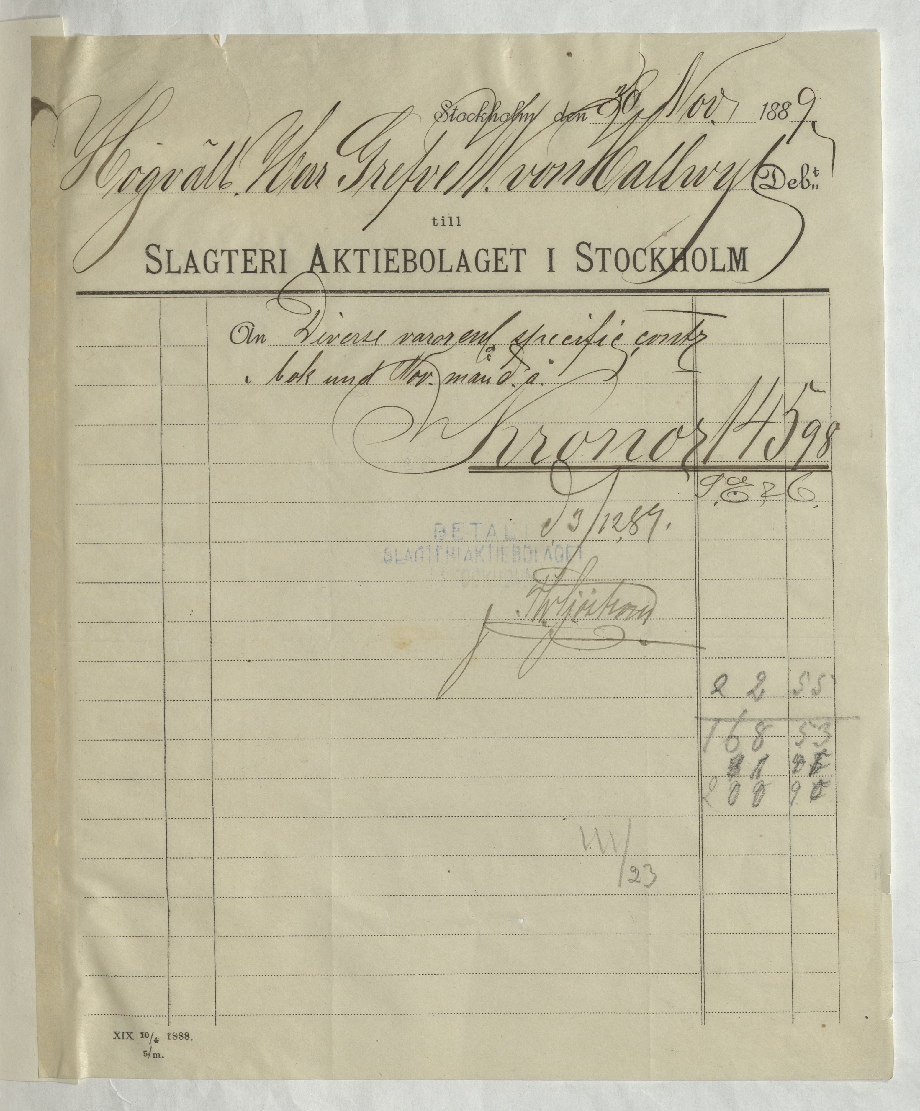 Kvitto från Slagteri Aktiebolaget i Stockholm