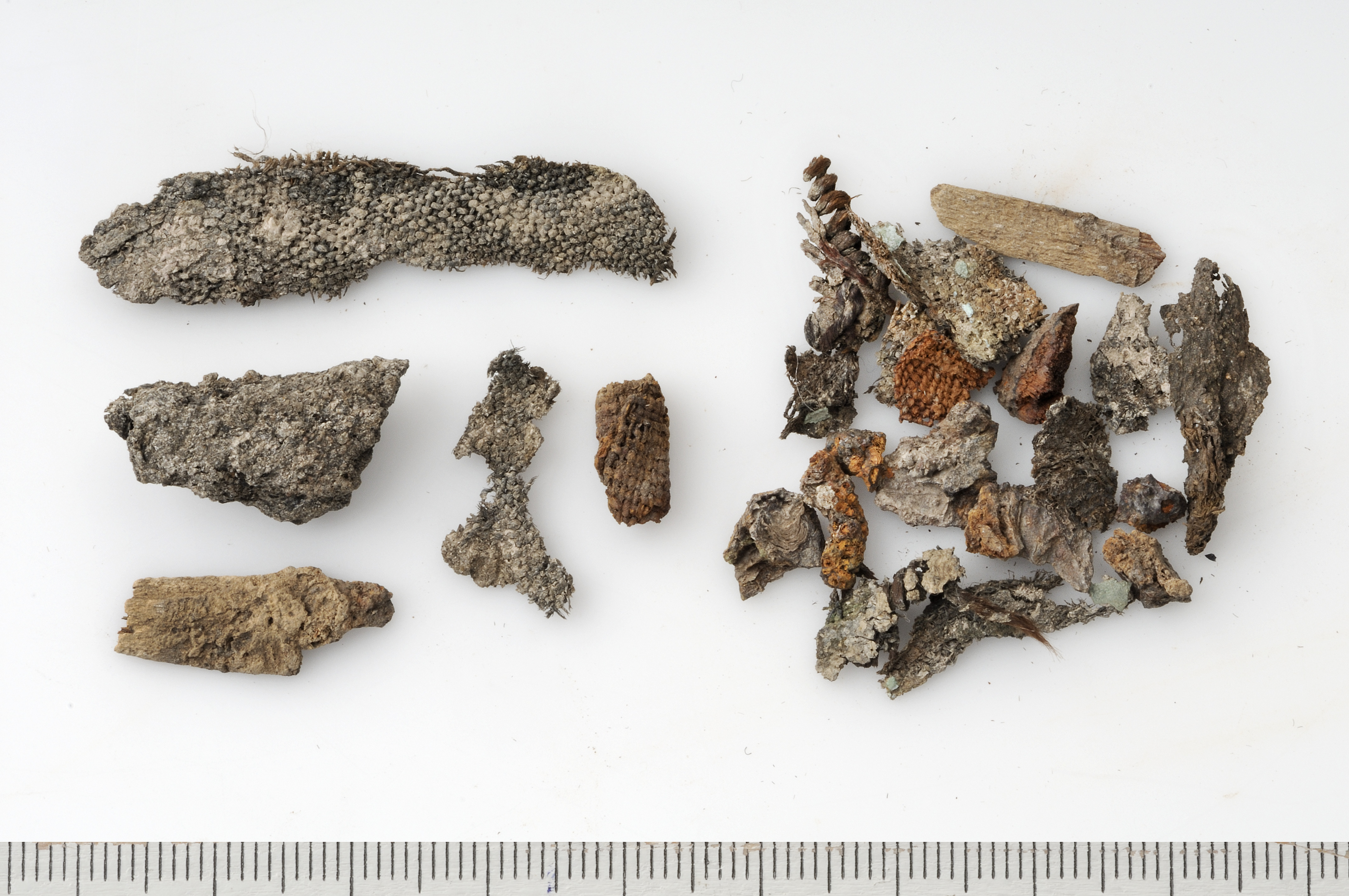 1 ask med ett flertal små textilfragment, bitar av trä, brons och järn.