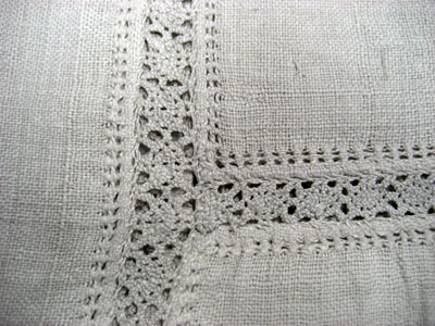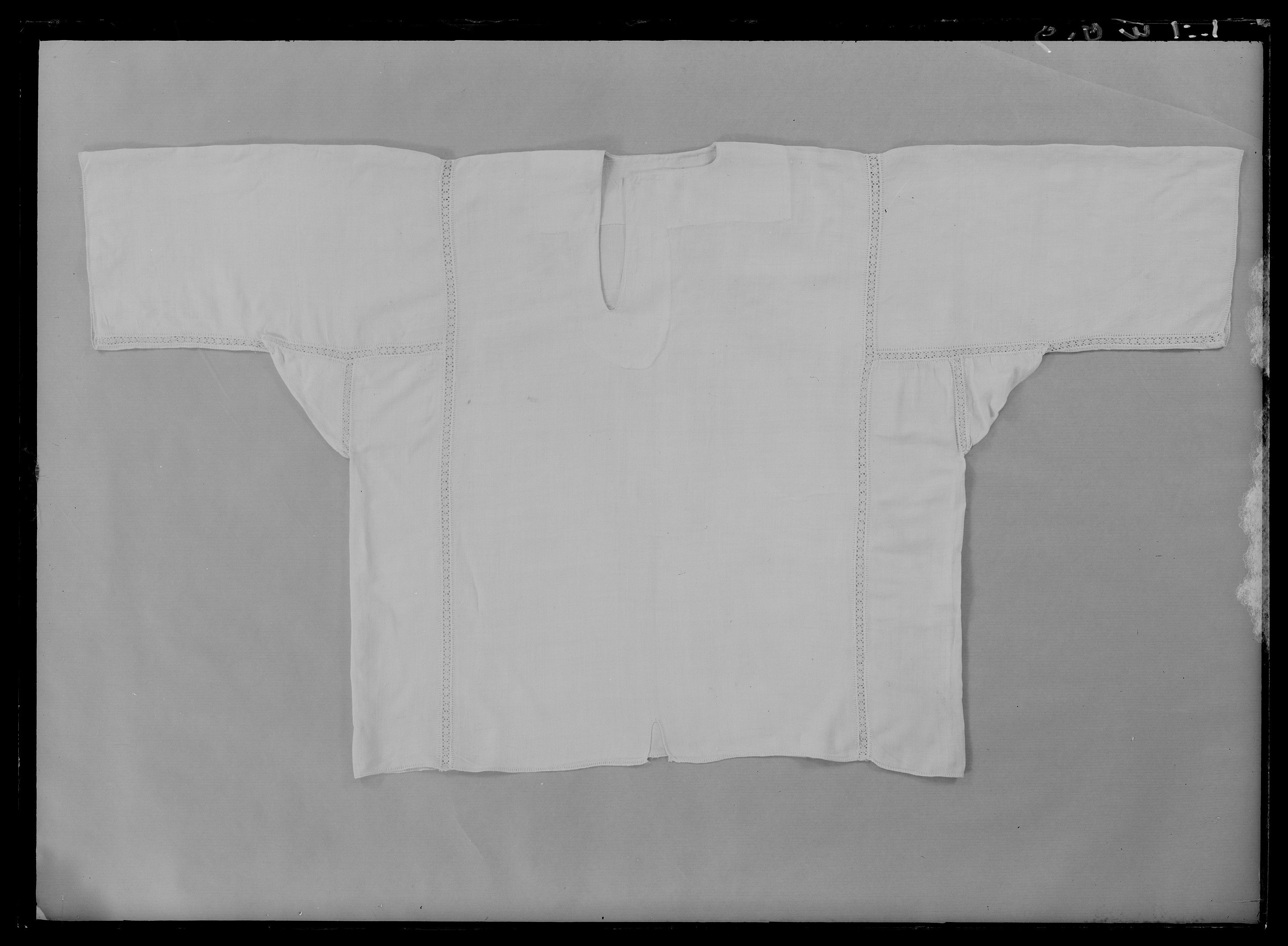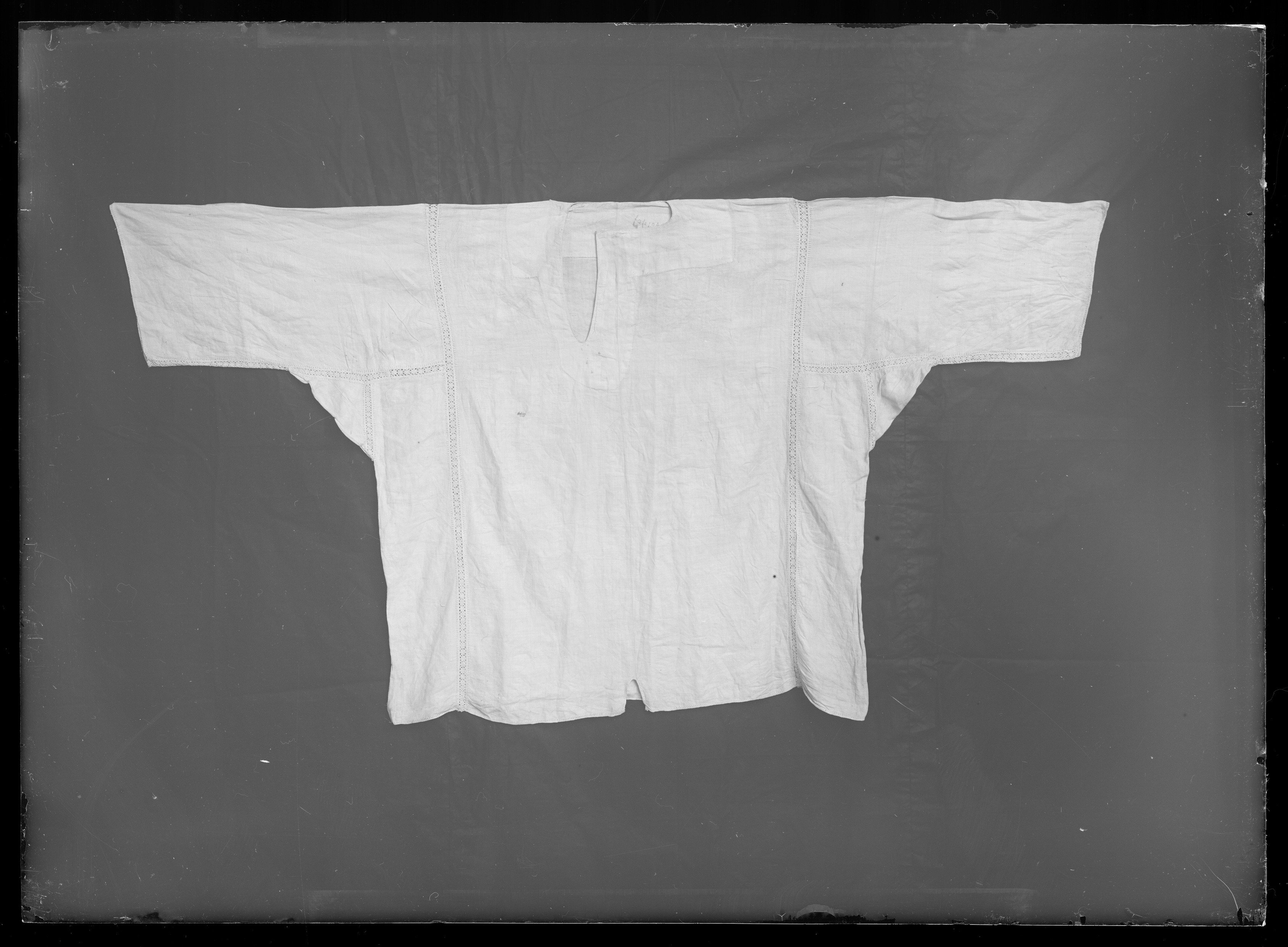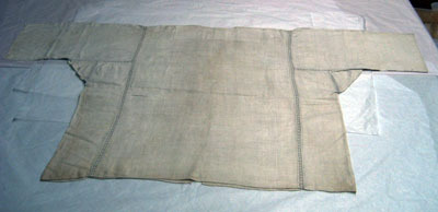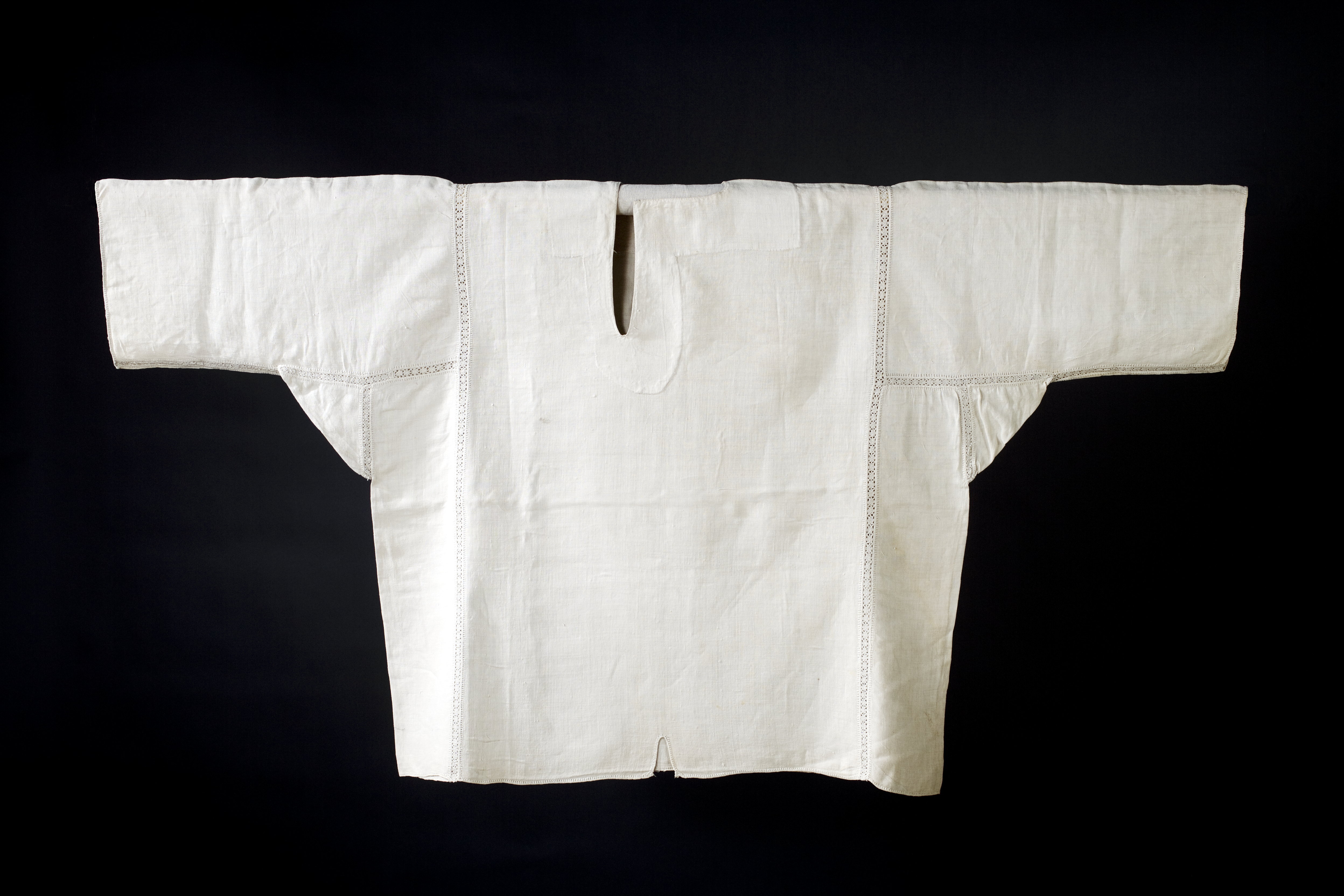 Av tunn naturfärgad vit linnelärft. Sydd av två raka stycken med två rektangulära stycken infällda på sidorna. Utan krage. I halsen ett osymmetriskt sprund i vinkel, vertikalt ned 217 mm och horisontalt åt höger 157 mm. Runtom en bred skoning av samma tyg. Vida ärmar, 480 mm långa, som har sytts fast med spjäll. Fållar av myrgång ytterst på ärmarna. Samtliga sömmar är sydda med infällda knypplade spetsar, 11mm breda knypplade spetsar av vitt linne. I nederkanten mitt på framstycket, ett 60 mm långt sprund. Tagen vid Narva 1700.