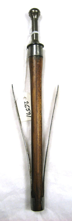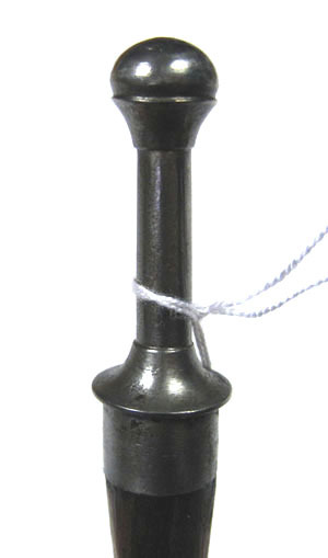 Avlång ljusbrun träpinne med upptill cirkulärt tvärsnitt, nedåt fasade på de sidor där fjädrarna sitter. Upptill skoning av blankt stål med koniskt lock och genom detta en 30 mm lång stång avslutad med slät kula med konisk hals. Nertill två bladfjädrar av stål, l 100 mm, böjda utåt och fästade nertill med varsin nit.