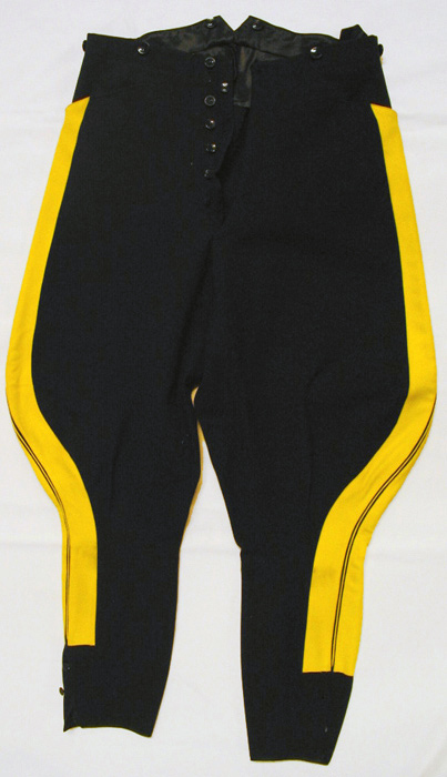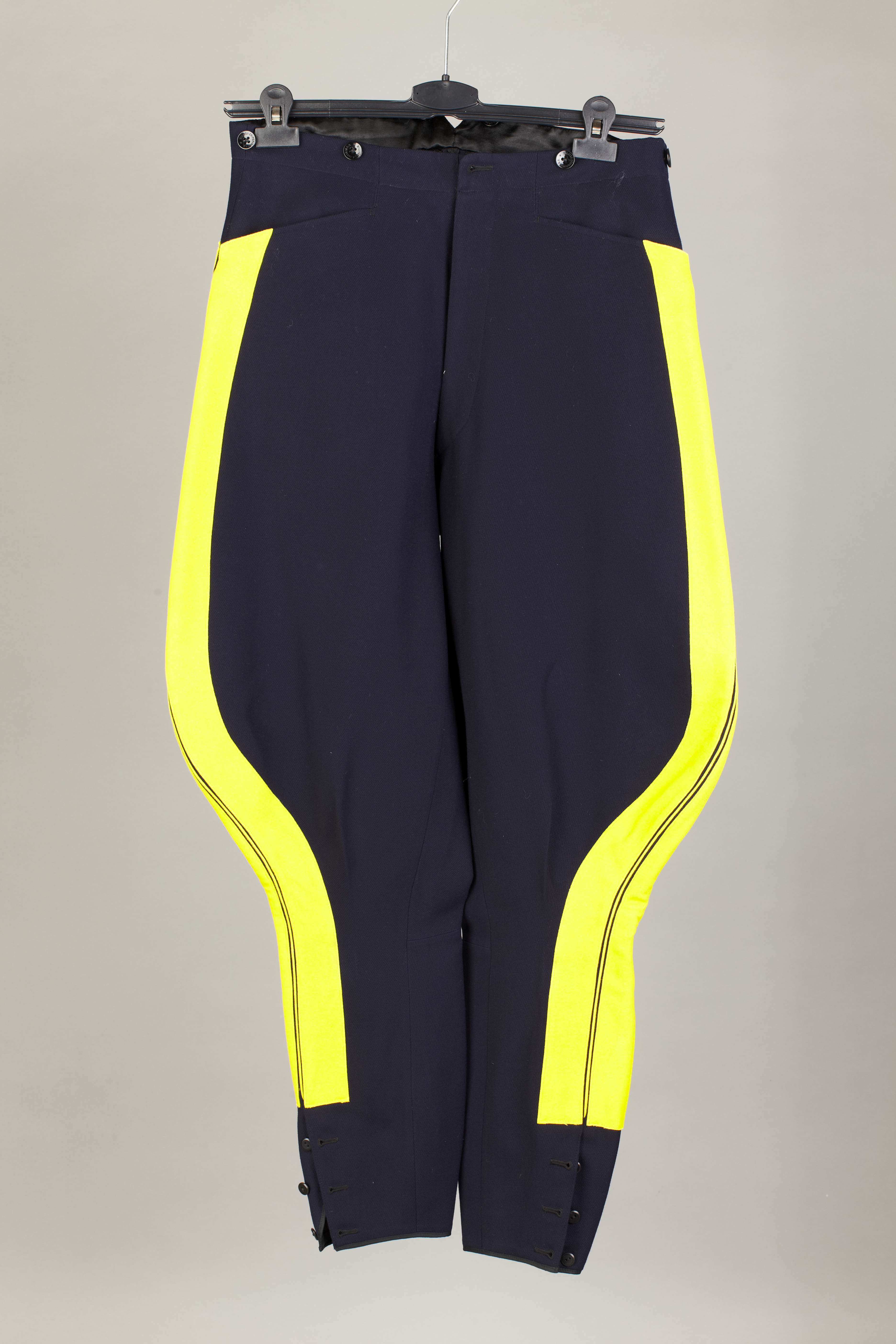 Ridbyxor av mörkblå yllediagonal med s k vid tillskärning och med dubbla gula klädeslister och emellan dem en gul passpoal. Gylf med dold knäppning, sju knappar, svarta skålformiga, av plast, d: 14 mm med på utsidan märkt: " MILITÄR EKIPERINGS A.B. " Upptill hake och hyska. Till en av gylfknapparna sitter knapphålet på en slejf i fodret. På slejfen vit sidenetikett med kungligt vapen och: " MILITÄR EKIPERINGS A.B. // KUNGL. HOFLEVERANTÖR // MEA // Stockholm, den 24:11 1938 // Herr H. K. H. // prins GUSTAF ADOLF ". Utefter överkanten fyra knappar på utsidan och baktill vid sprundet två knappar, som de andra, d: 17 mm. Två något snedställda stolpfickor fram. Nedtill vid benen sprund med enkel knapprad om tre knappar, plana, av svart plast, d: 13 mm. Längst ned en kantning av svart bomullskypert. Linningen fodrad med svart siden, byxfickorna med svart bomullstuskaft. Upptill bak en svart sidenögla.