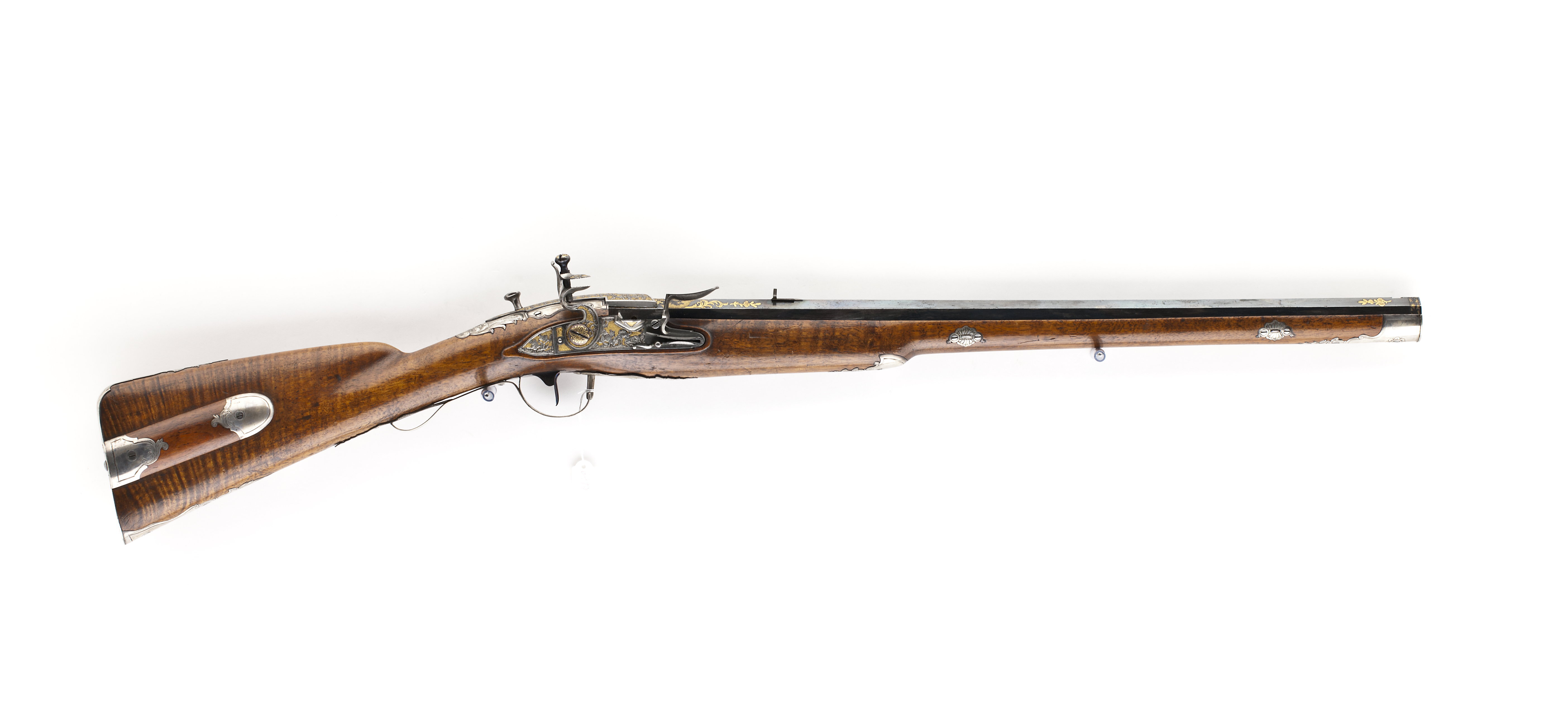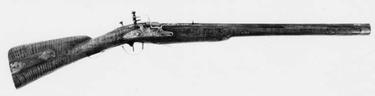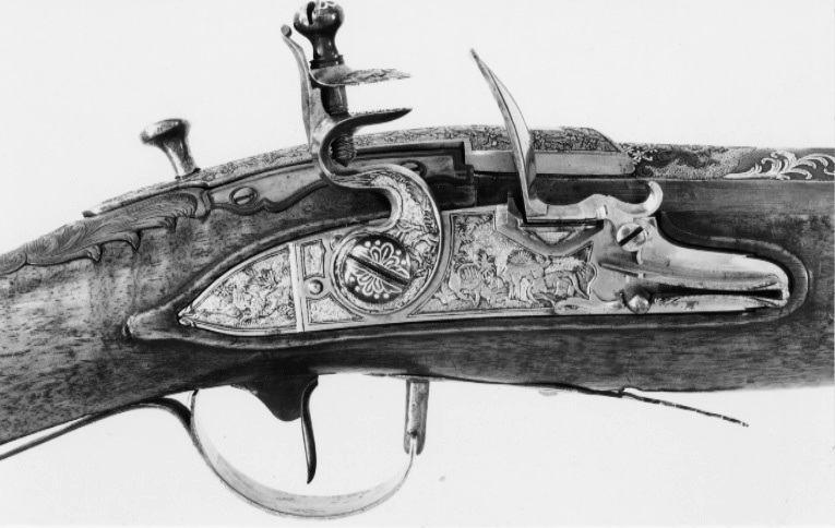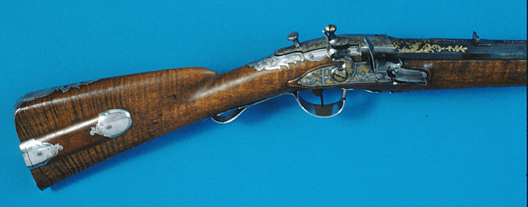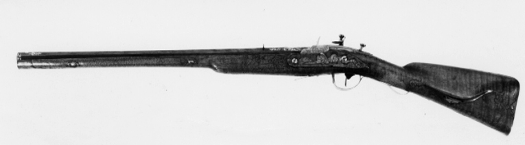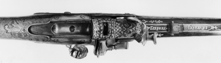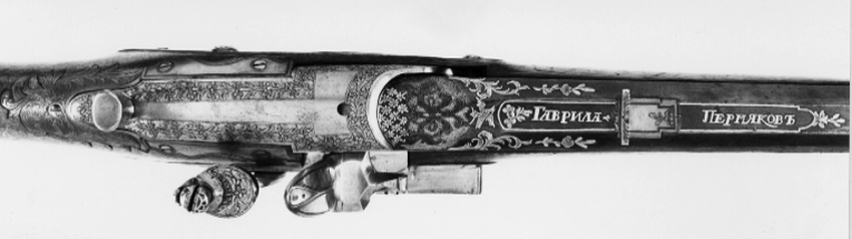 Åttsidig, blånerad pipa av stål, nio räfflor. Svansskruv saknas, i kammaren finns ett lodrätt skjutbart stålblock. På pipans ovansida däröver ett stållock med T-formigt fingergrepp. Locket går ner på pipans v. sida och är fäst på en axel på pipans undersida. På andra sidan av axeln en spets, som påverkare en kraftig fjäder, vars bakre ände går igenom ett urtag på blocket. När locket fälls uppåt trycks fjädern och blocket nedåt, varvid loppet öppnas. På blockets nederände finns en svarvad stålten, l: 25 mm. Bakom pipan är fastskruvat i kolven ett laddtråg av stål, l: 60 mm. Blomdekor av påslaget guld, på båda sidor om siktet en guldsignatur i ramverk, kyrilliska bokstäver:"GAVRILA PERMJAKOV". På de fem övre faserna vid mynningen samt runt det rektangulära hålet för blocket på kammarens ovansida blomrankor i låg relief mot punsad bakgrund. På kammaren därframför blommor av guld, bildande ett nätverk, samt därframför band- och rankflätor mot punsad och förgylld bakgrund. Locket är ej blånerat, blomrankor mot punsad och förgylld bakgrund. Riktmedel: Inlaxat ståndsikte av silver med graverad bladdekor på plattan. Kornet saknas. Fästning: Pipan fäst med två engelska pipstift samt skruv i laddtråget. Flintlås med plant låsbleck, något fasade kanter, försänkt bakspets. Snidad dekor i relief mot punsad och förgylld bakgrund, på bakspetsen en fallande fågel, framför hanen två hundar och en fälld hare samt en fågel. S-formigt svängd hane med två fåglar, hanskruv med svagt välvt, blånerat huvud. Runda käkar, på överkäken en blomranka. Blånerad käkskruv med omvänt päronformigt huvud, blomrankor i guld. Kantig, guldfodrad fängpanna med fals. Batteri med enkel, graverad dekor på eldstålsryggen, fjäder med rankformig flik. Nöt, nötstudel, avtryckarstång samt slagfjäderns, fängpannans, nötstudelns och stångfjäderns fästskruvar blånerade. Fästning: Två blånerade låsskruvar med blomdekor i guld. Blånerad avtryckare och avtryckarbleck. Helstock av valnöt med kindstöd och kolvlåda. Beslag av silver med graverad rokoko-dekor, blånerade fästskruvar. Tvådelad bakplåt med tunga på kolvryggen, avslutad med bladknippe, graverad trofégrupp med pilkoger, horn och palmkvist, två respektive en fästskruv. På kolvens v. sida ett litet silverbleck, en skruv. På kolvlådelocket ändbeslag, vardera en skruv, på lockets bakkant ett silverbleck. Vid kindstödet beslag med rör, l: 31 mm. På kolvens undersida bleck med bladknippe, tvåskruvar. Runt svansskruvbladet bleck med bladrankor, fem skruvar. Rikt konturerat sidbleck i form av sabel(?), kask, avhugget huvud mm, en skruv. Vid det avsmalnande partiet på framstocken ett bleck med bakåtriktad, konturerad spets, en skruv. Blomformiga pipstiftbrickor, vardera två skruvar. Näsband av silver med bakåtriktad bladspets, två skruvar. Varbygel av silver med kort, 8-formig främre arm med hål för laddblockets ten, bladspets. Lång, delvis dubbel bakre arm med bladspets, på bygeln graverat fält med trofégrupp, fästning med två skruvar på bakre armen, stift på framstolpen.