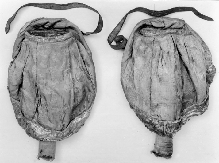 Hölsterkappa i blå sidendamast och guldtygsgarnering i form av guldskir. Blått linnefoder. Mellanfoder i grovt tyg (linne).Sko klädd med blått siden.