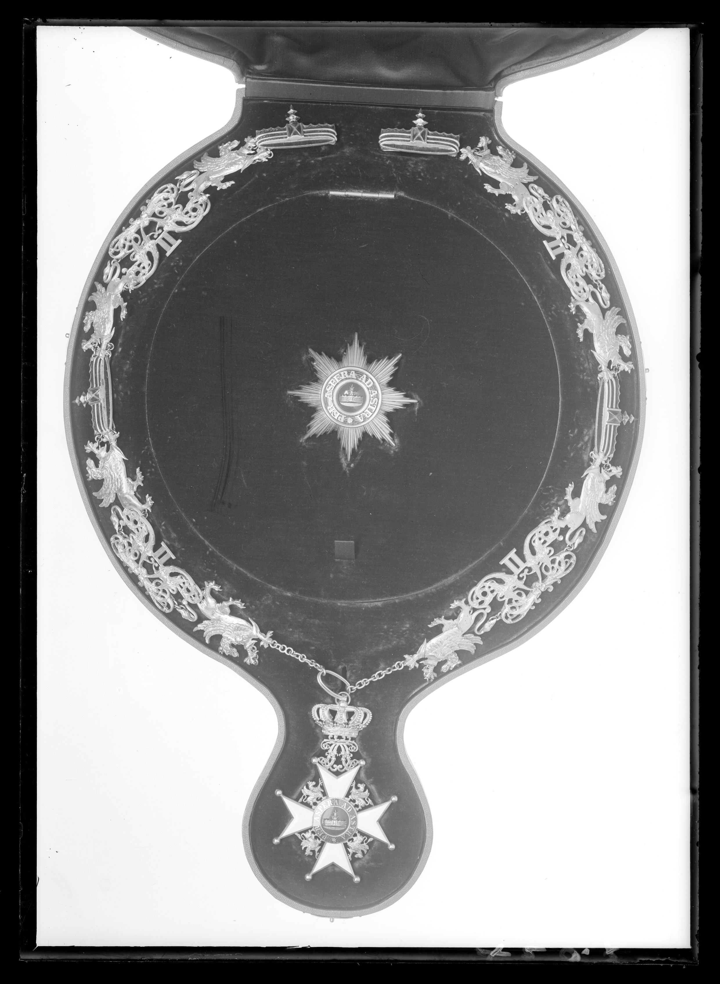 Vitemaljerat malteserkors av guld, kulor på spetsarna, mellan korsarmarna gående gripar av förgylltsilver(?). Välvd medaljong täckt med blå emalj, därpå i relief den grönemaljerade, wendiska kronan. Däromkringen guldkantad ring, täckt med röd, genomsynlig emalj, guldtext: "PER ASPERA AD ASTRA". Frånsidans medaljong välvd och täckt med blå emalj, däri namnchiffer av guld, spegelmonogram F F(storhertig Friedrich Franz), guldkanten med graverad sicksacklinje. Mellan de övre korsarmarnas spetsar ett genombrutet spegelmonogram F F, däri fäst med scharner enkunglig krona av guld, vid äpplet en fast bandring, däri fäst en oval, spiralformig ring.