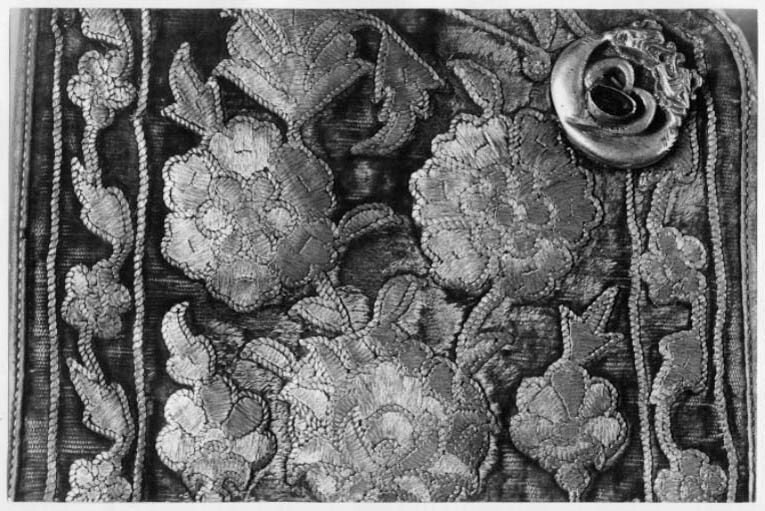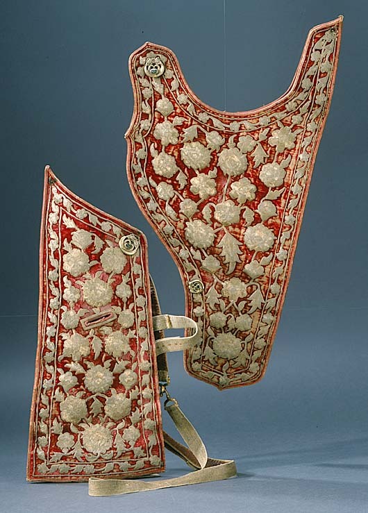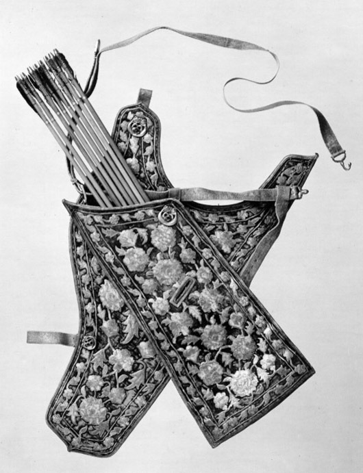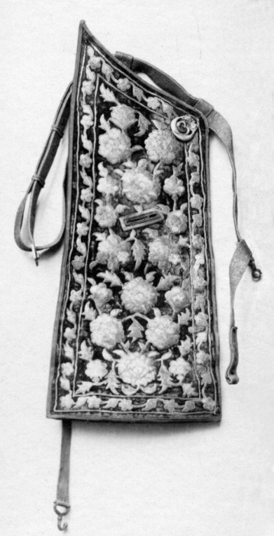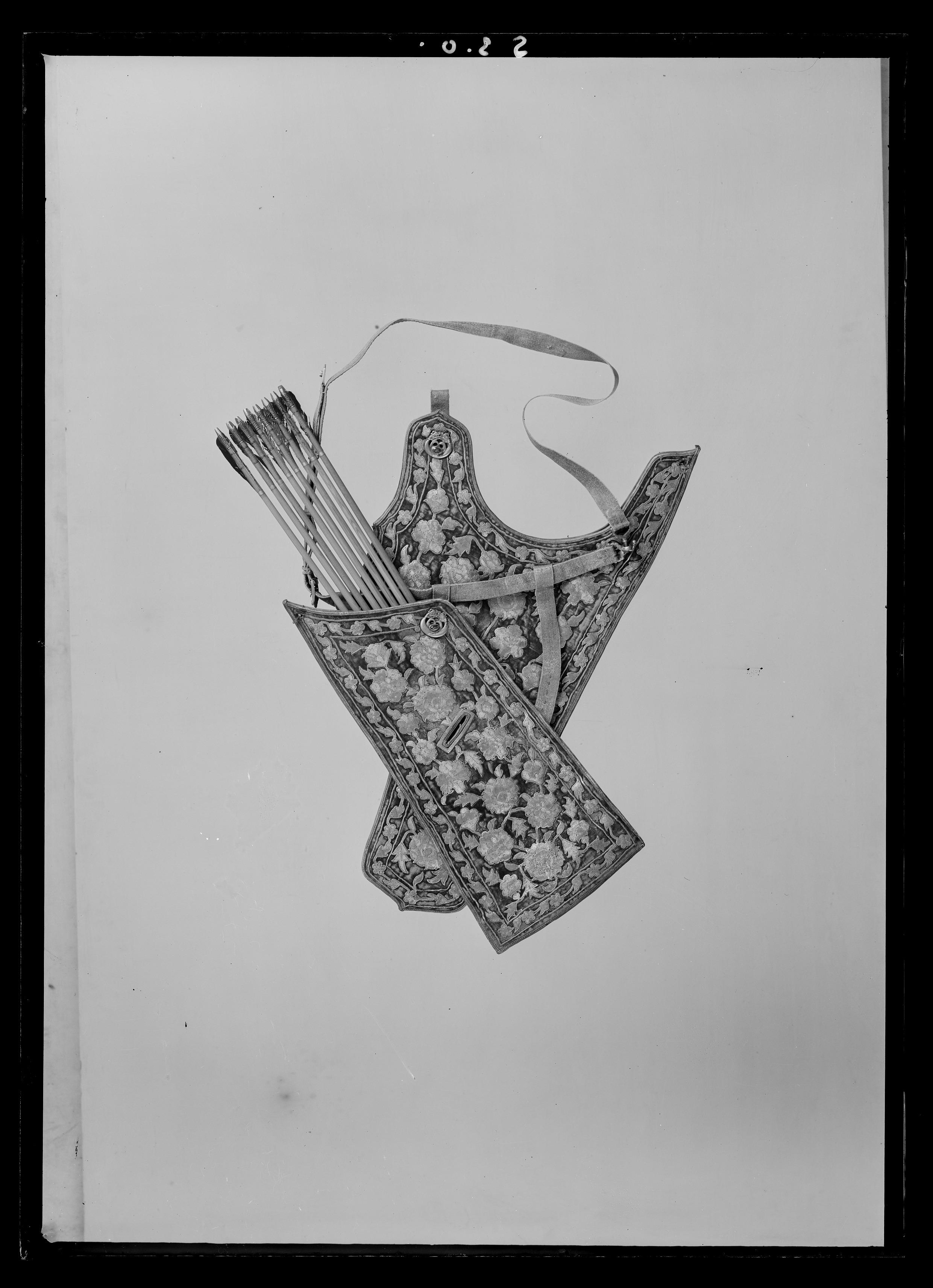 Pilkoger, ryskt kulturområde, överlämnat tillsammans med bågkoger nr 7745 till Gustav II Adolf vid en audiens i Uppsala 8 januari 1630 (1629 enl.vägl.1921) tatarkhanen Djanibeck Girays sändebud Kamber Aga. (Enl.Jarring: Djan Bek Gerey). Koger av läder, klätt med röd sammet. Trapetsoid, platt form med spetsoval botten. Utsidan dekorerad med yttäckande broderi (plattsöm) i form av blommor och rankor av guldtråd. Mittpå en sned skåra. Upptill i ena hörnet ett genombrutet, ciselerat beslag av förgyllt silver med dekor i form av två drakhuvuden. En grön sten infattad på drakarnas kropp. Baksidan utan dekor, gehäng av guld och silvergalon förstärkt med röd chagrin. Spänne, beslag samt märka och hake av förgyllt och ciselerat silver, spänne och beslag med var sin grön sten.