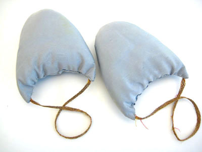 Skodyna i ljusblått siden med mönster av blommor. Söm längs kanterna. "Handtag" av bandbestående av gulmetallomspunnen textiltråd.