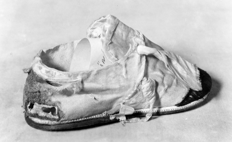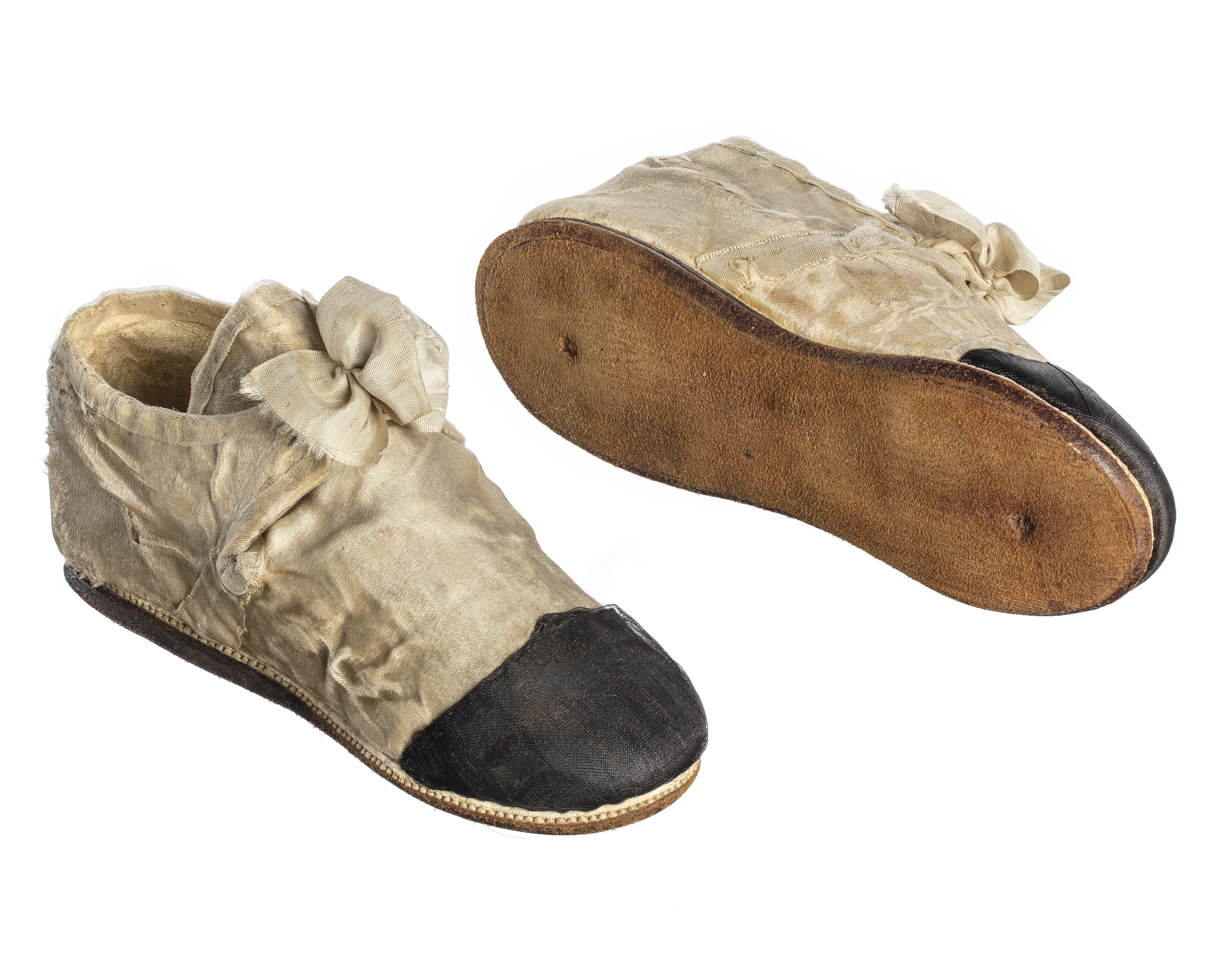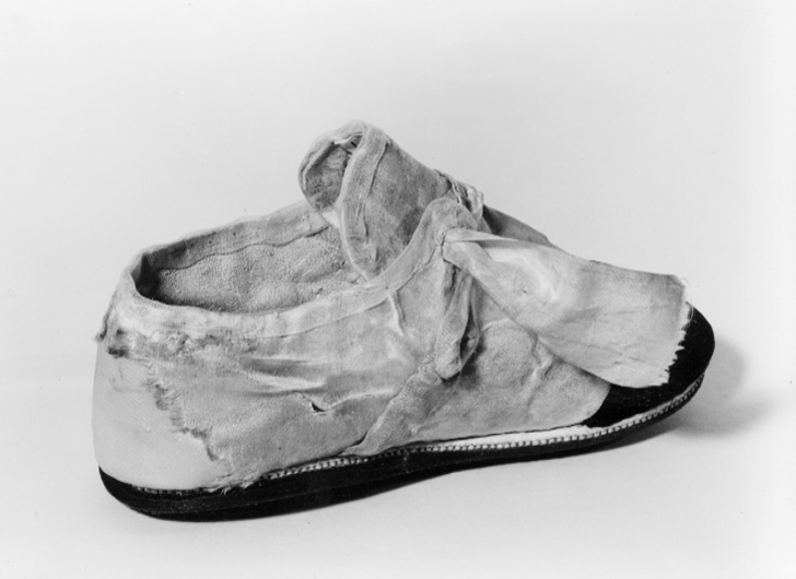 I vitt och svart siden. Sko i vitt siden sydd i ovanläder som går upp i en plös och en bakkappa med två slejfar. Ovanläder och bakkappa förenas genom sömmar på båda sidorna. De två slejfarna sluts med en i rosett knutet sidenband. Urringning, plös och slejfar är kantade med ett litet vitt sidenband. Skons läst är rak. Skon är dekorerad med svart siden på tåhättan. Fodret i bakkappan är av getskinn och ovanlädret är i linne. Sulan är av sämskläder och randsydd med klisterputsade sidor. Under randsyningen ligger en liten vit läderremsa som dekoration.