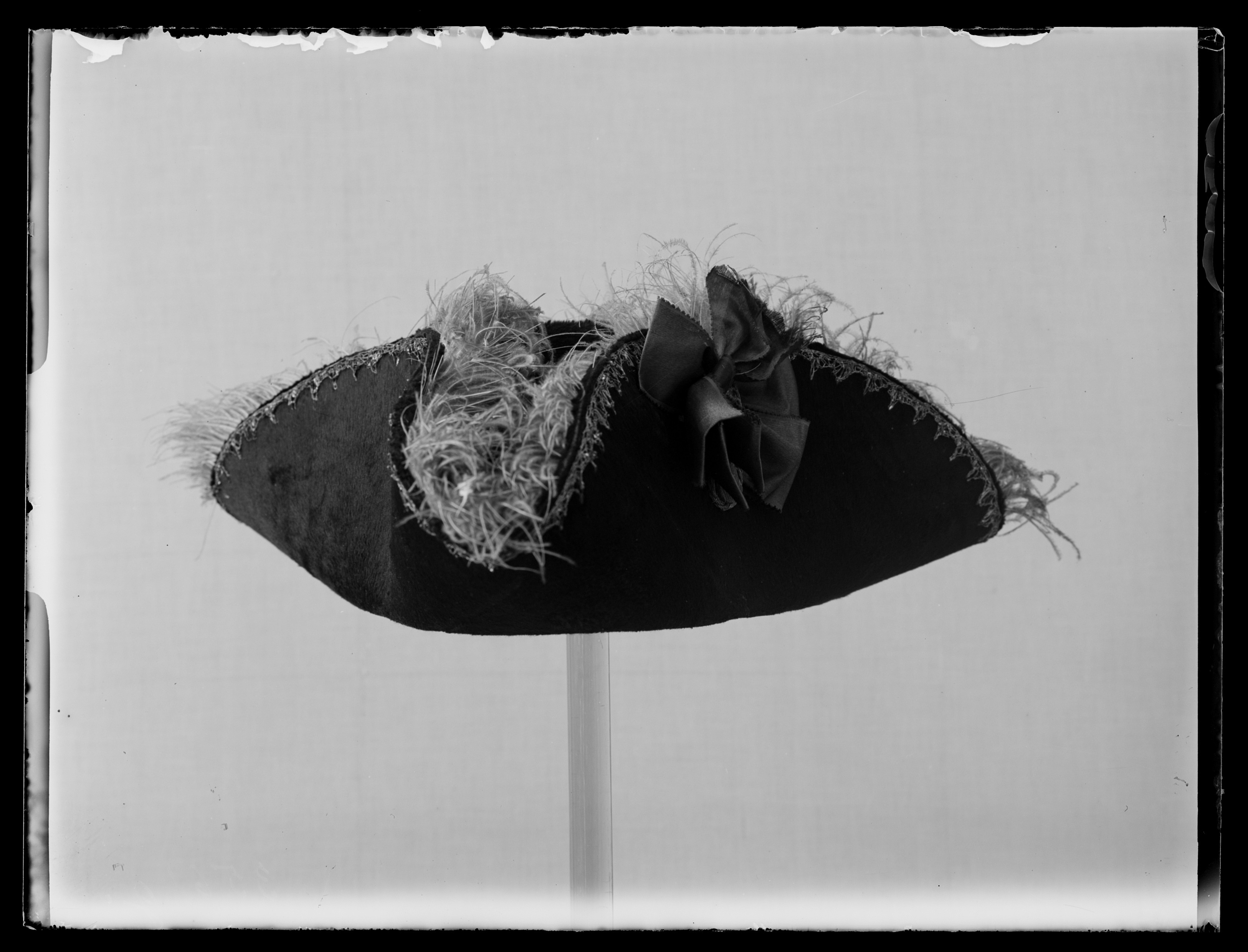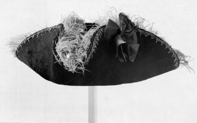 Trekantig hatt med uppvikta brätten av svart silkesfelb kantad med en bård av guldtråd broderad i spetsar. På en sida en blekt svart silkesbandros med flätad silversnöre över, b: 6 mm, nedtill den plana mössknappen, d: 17 mm som klätts med silvertråd. Plymet av ljusgrå strutsfjäder. Foder av rött siden, draperad på sidorna. Svettrem av ljusbrunt läder, b: 56 mm.