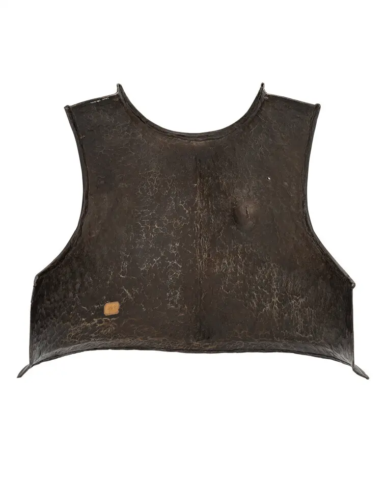 1600-talets mitt. Pilh: 237 mm. Slätt, mörkanlöpt bröstharnesk av stål med enkel kantvulst längs hals- och armöppningarna samt längs nederkanten, därinnanför enkel linjedekor. 280 mm lång mittås med antydan till gåsbuk. Insidan endast grovbearbetad. På båda sidor vid armurtagen urspr. hyska och hake av stål, på h. sida endast hyskan kvar. På linjen nertill urspr. två fästnitar, den v. saknas. Mitt på h. sida ett ca 10 mm djupt märke efter provskott, godset något sprucket på insdian, kuld: ca 17 mm. Vid halsöppningsn överändar två hål.