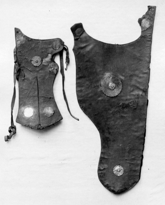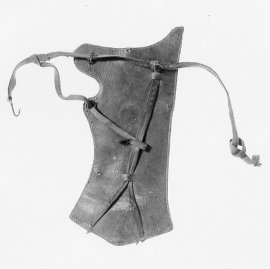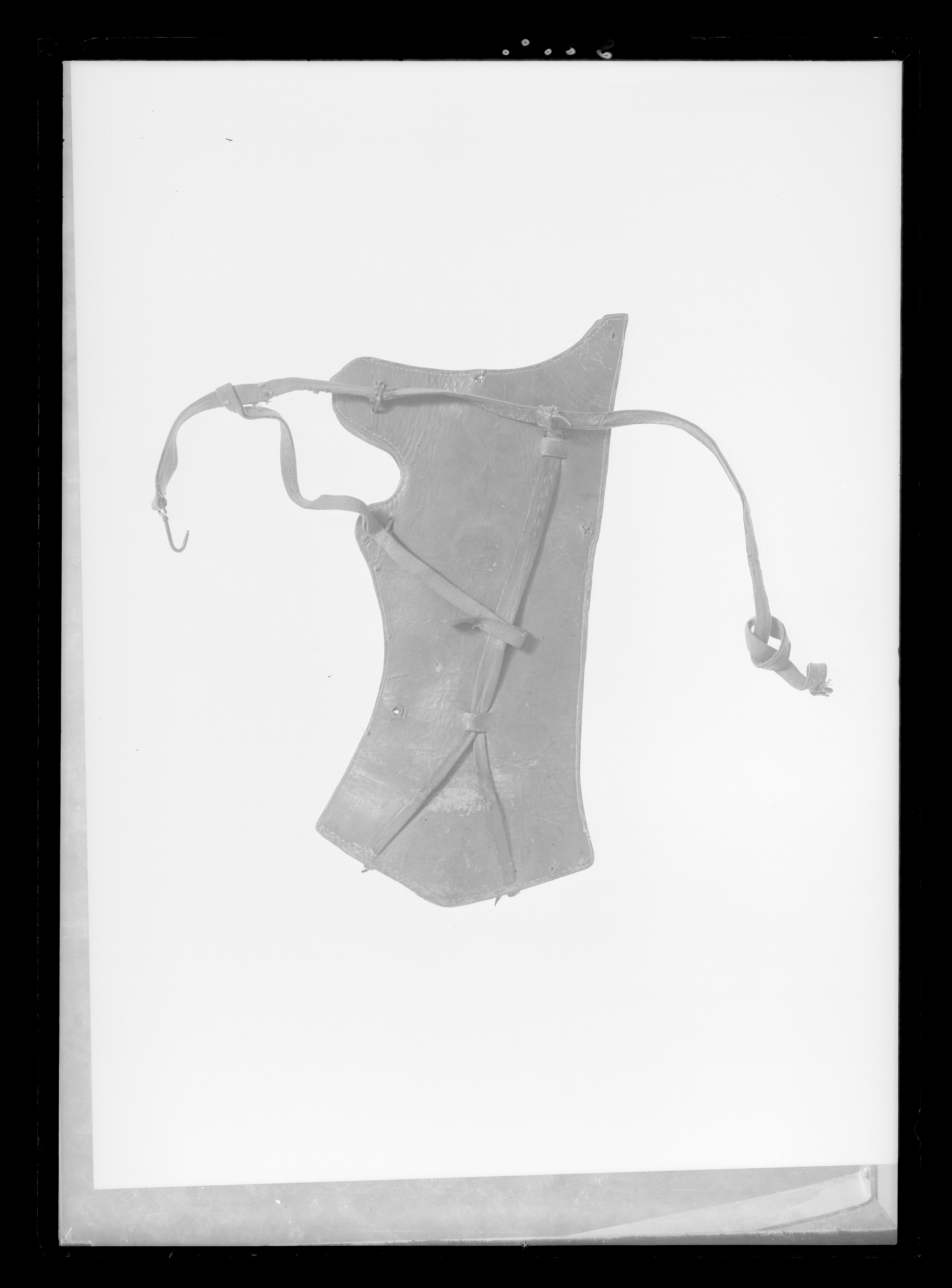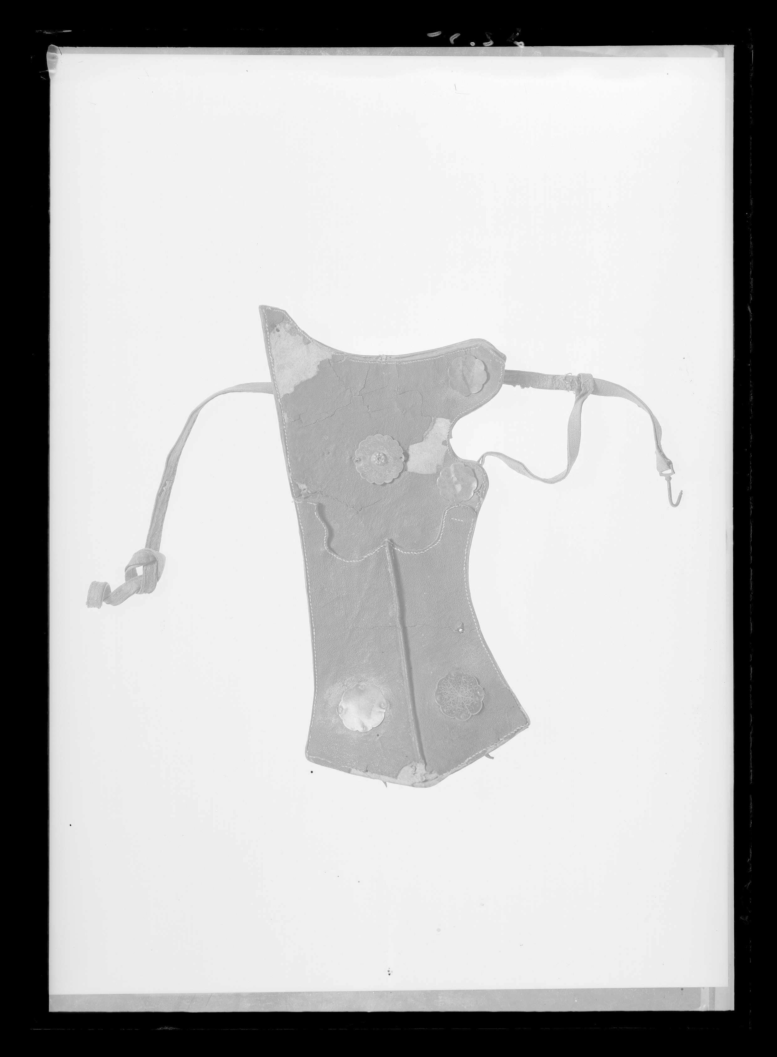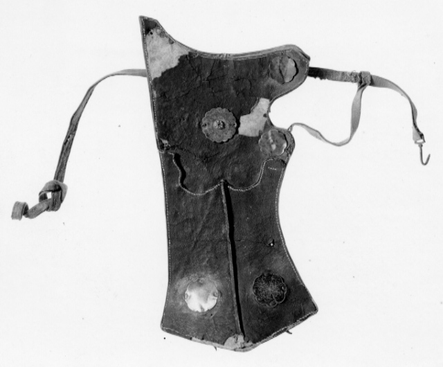 Asymmetriskt koger av brunt läder, på framsidan klätt med svart läder. Bottenplatta 61 mm bred. På framsidan en påsydd dubbel ficka av svart läder. Framsidan prydd med fem platta rosettformade beslag av silver med inläggningar i niello i tätt bladmönster (Tula-arbete). Två beslag upptill vid den svängda kanten, d: 35 mm, ett beslag mitt på övre delen, d: 43 mm, med upphöjt, förgyllt mittparti vari en sten varit infattad. Nedtill på fickan två 42 mm beslag. På baksidan är bärremmar av rött silke och röd saffian med en krok av silver fästa dels i byglar på baksidan av de översta beslagen dels i skåror i lädret.