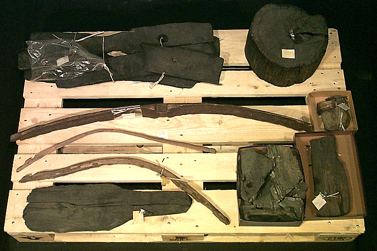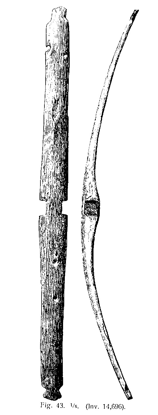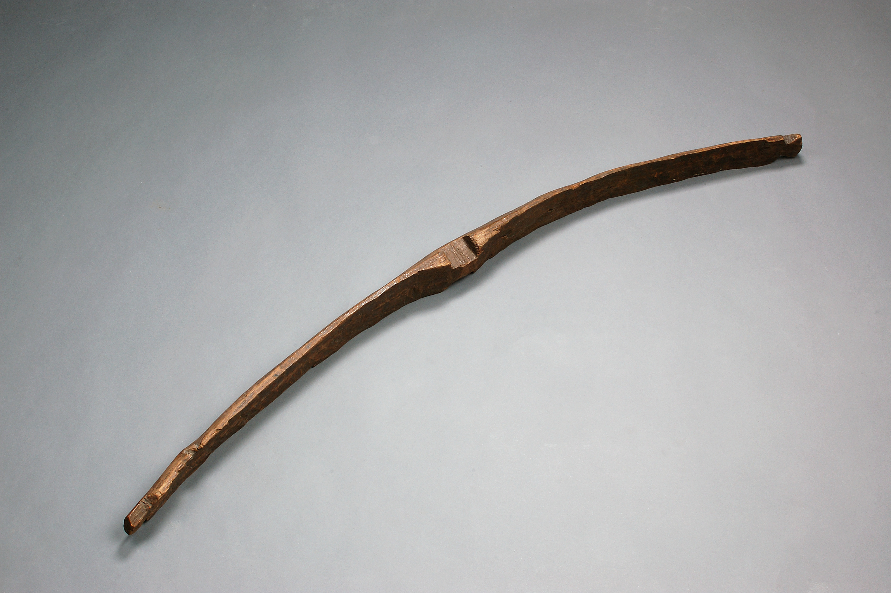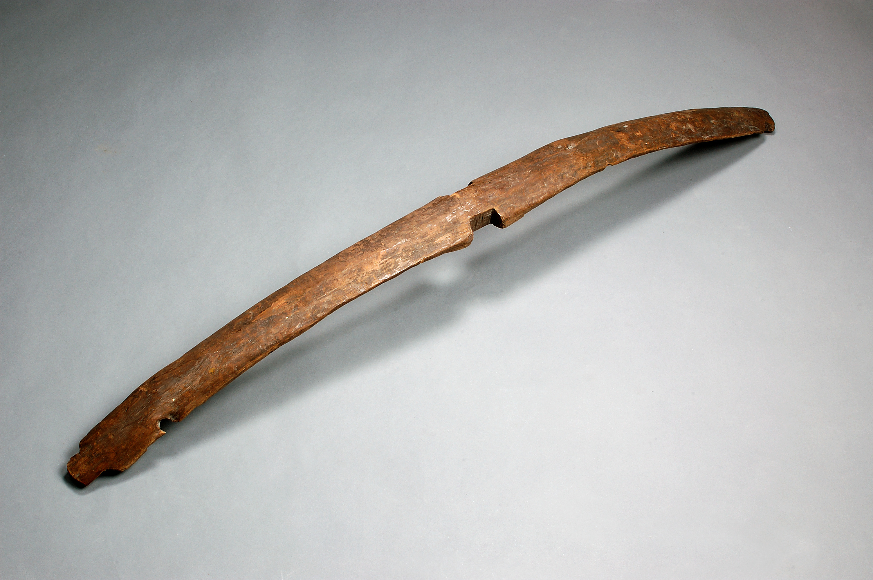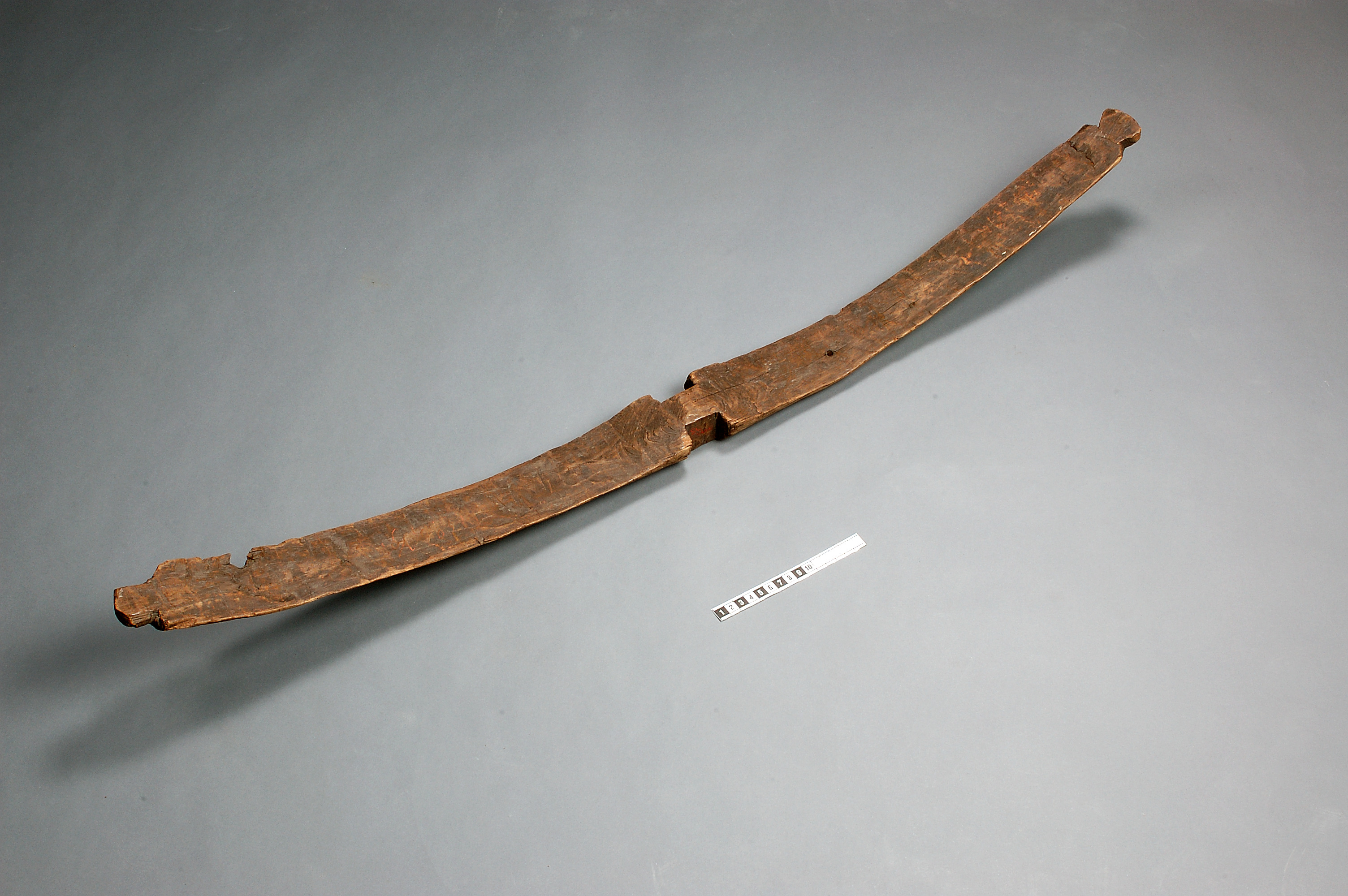 Bågen av idegran med inskärning vid mitten för infästning av armborst. Längden är 105,5 cm och vid mitten är bågen 2 cm tjock och 7,2 cm bred