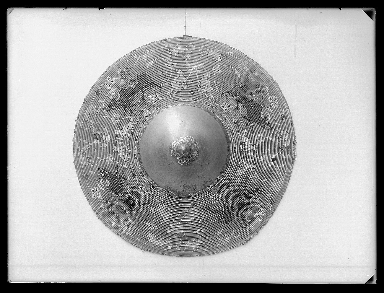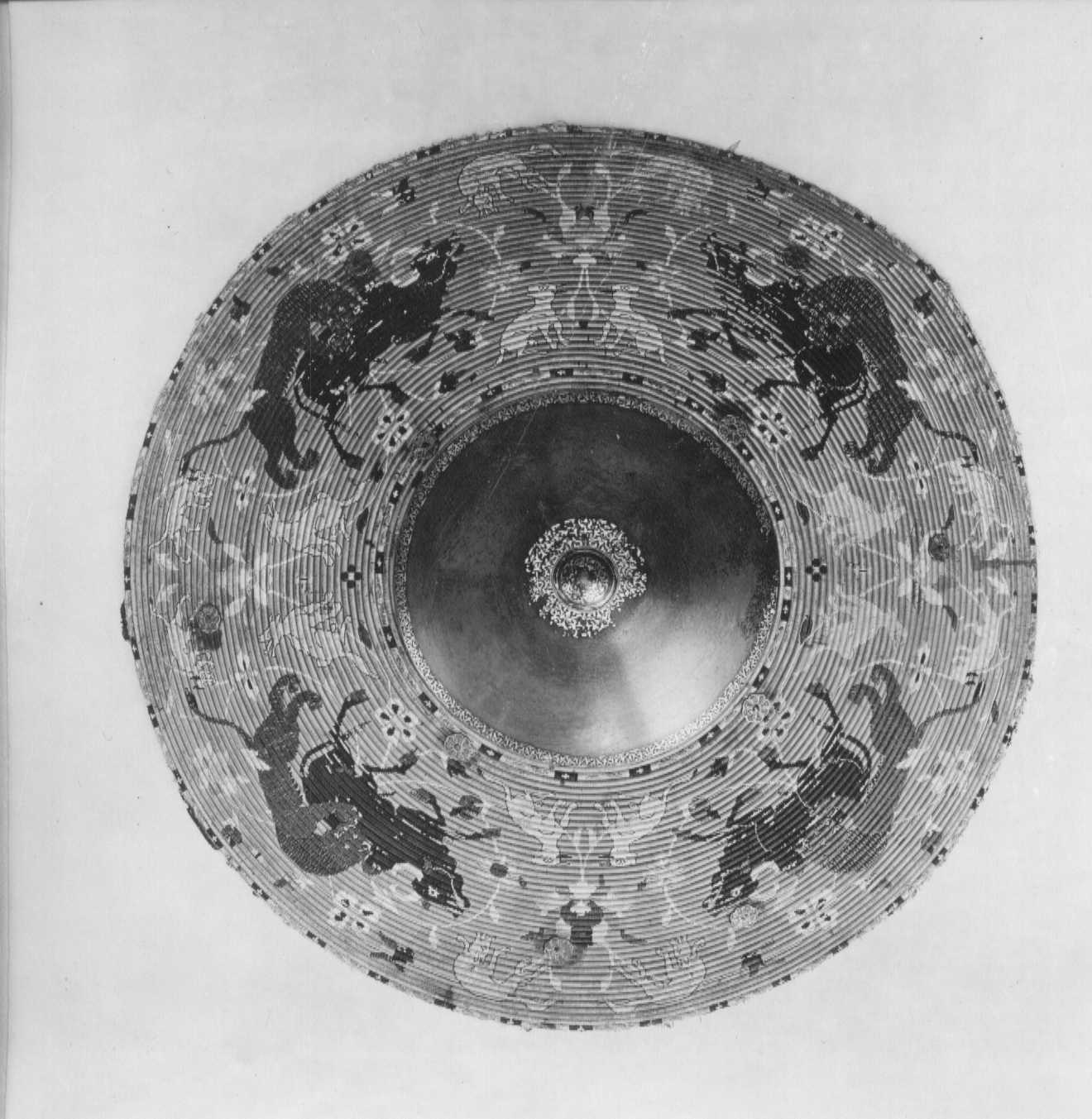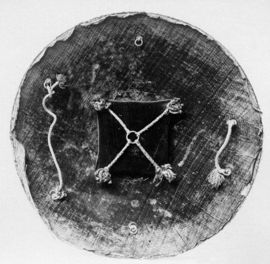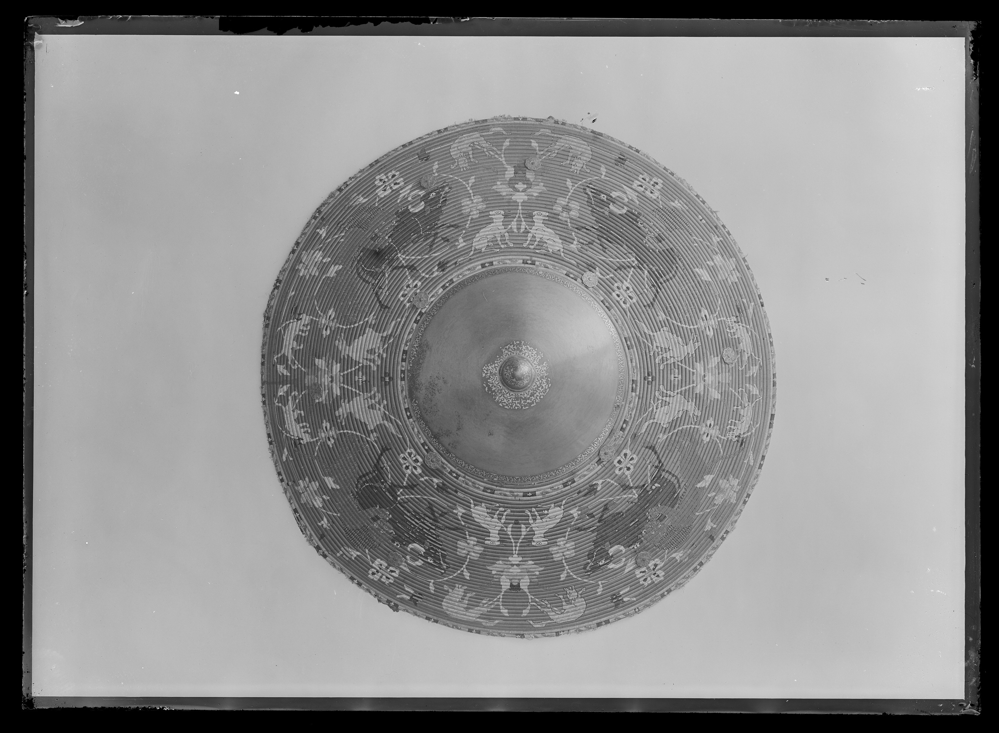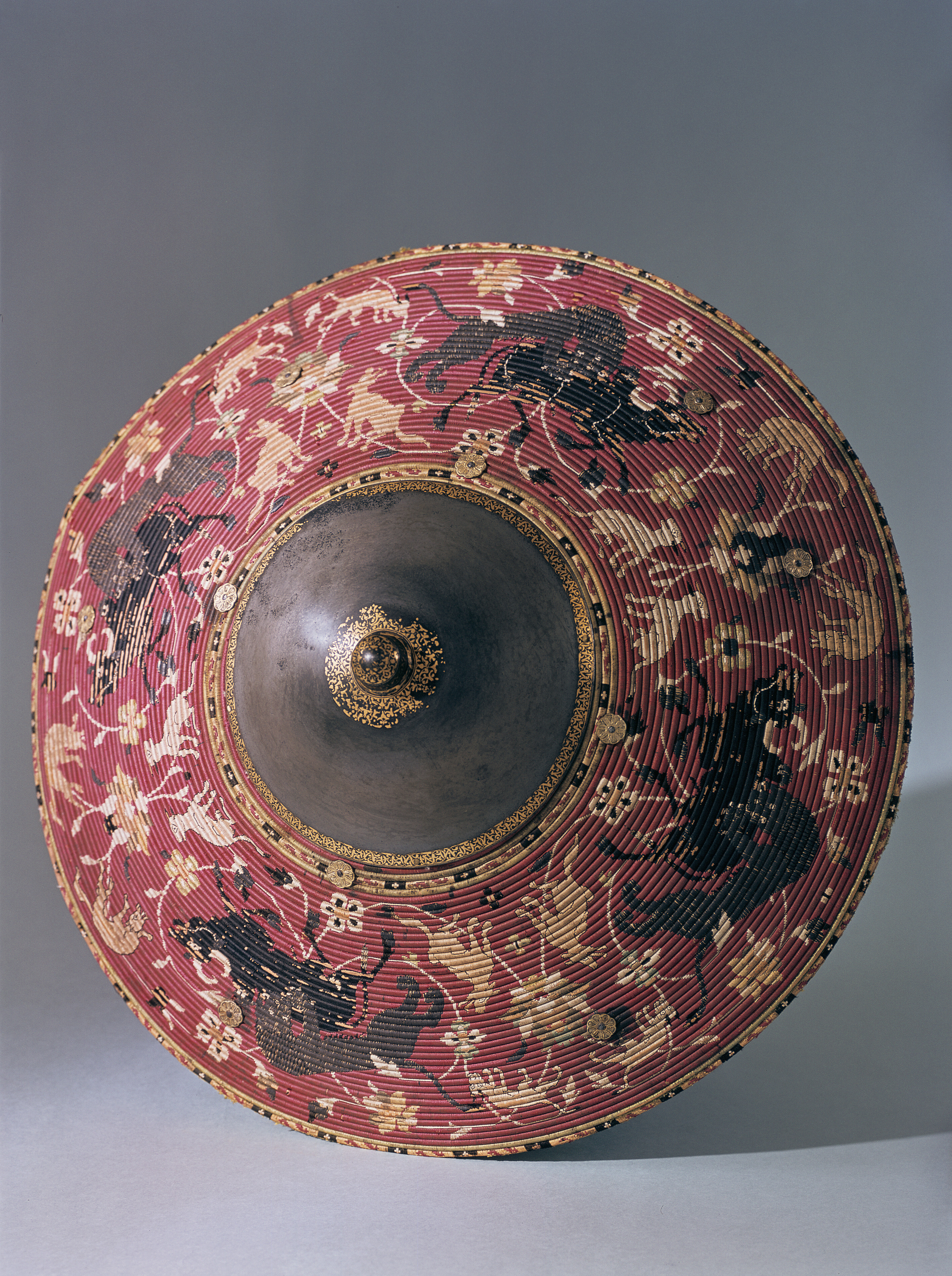 Rund sköld uppbyggd av 42 stycken synliga ringformade vidjor av fikonträ, lindade och broderade med silkestråd i rött, grönt, gult, svart, grått och vitt. All kanttråd fäst i längs fiberriktningen rakt dragna skåror i träet. Kanttråden till alla figurer och ornament fästad på detta sätt, möjligen även den röda bottentråden. Yttersta ringen med dekor av parvis oregelbundna ornament i rött, mellan dessa rektangel i svart med i mitten likarmat kors i vitt. Detta mot botten i gult. Nästa ring helt i grönt. Därefter större fält med djur över slingrande växter. Fyra större grupper av oxe i svart med vita horn och ögon, bakifrån attackerad av panter i grått med vita ögon och klor. Mellan dessa två olika grupper av i mitten stiliserad växt med i de fyra hörnen ett hunddjur, vid sköldens inre kant sittande och mot yttre kanten i rörelse. Hundarna i gult med svart kant, vita ögon och i vissa fall svarta öron. Grupperna skiljer sig åt genom djurens utseende och detaljer. Av totalt 16 djur saknar tre helt ifyllda detaljer i svart. De tre översta ringarna närmast sköldbucklan är heltäckande grön, gul med dekor som nertill och heltäckande grön. Då sköldbucklan sitter snett kan även en ytterligare heltäckande röd ring ses från ett håll. Undersida av grön sammet. I kanterna fyra rostbruna metallöglor på konturerad stålplatta. Mot ena sidan två liknande och tätare placerade öglor, mellan dem ett flätat snöre av grön silkestråd med i ena änden tofs . I mitten fyrkantig stoppad kudde "puta" av röd sammet, 185 x 195 mm. Undersidan klädd med ett ljusare rött tyg än ovansidan. I varje hörn, genom putan, en fästad ögla med snöre i orange och blått. Snörena möts och är fäsade i en lös ring över kuddens mitt. Sköldbuckla, rund och välvd i stål, diam ca 140 mm, h ca 90 mm. I yttre kant dekorativt band av förvanskade arabiska skrivtecken, b 11 mm. Upptill avslutad med rund knopp, diam nertill 34 mm, h 38 mm. Svagt avsmalnande uppåt med konisk topp. Runt knoppen 19 mm brett band av arabesk. Sidorna med dekor av samma förvanskade skrivtecken som tidigare. Den koniska toppen täckt med arabesk. All dekor av påslaget guld mot mörk botten. Fäst i nederkantkant med fyra mässingsstift. Förgyllda och dekorativa ornament, sammanlagt tio stycken, sex längs nedre kant och fyra runt bucklan. Konturerade kanter med i mitten åttbladig blomma mot prickpunsad botten, diam 19 mm. Ornamenten utgör fästen för öglorna på sköldens baksida